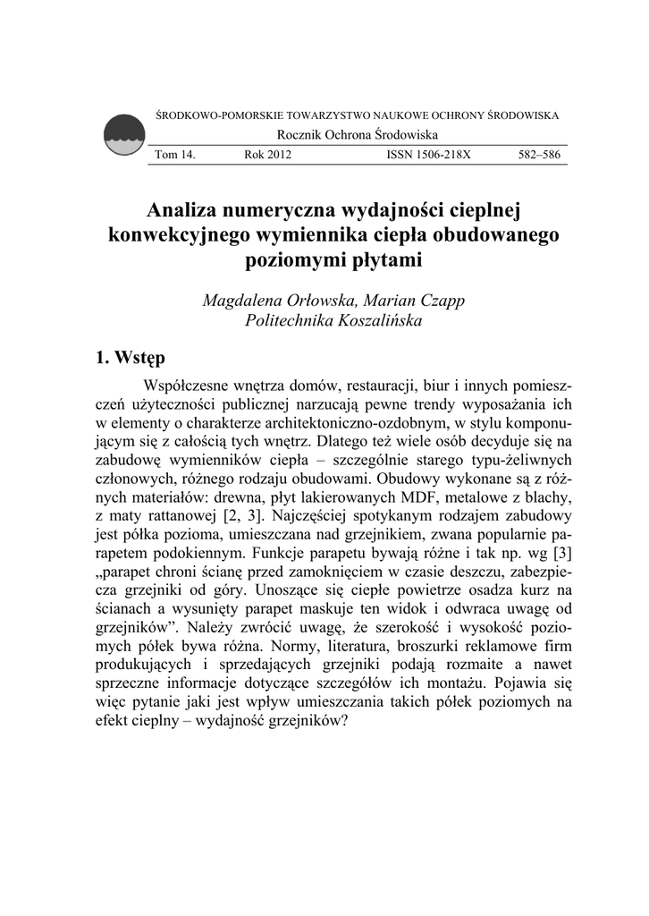 ŚROD DKOWO-POMORSK KIE TOWARZYSTW WO NAUKOWE OCH HRONY ŚRODOWIISKA Rocznik Ochro ona Środowiska Tom 14. Rok 2012 2 ISSN 1506-2218X 582––586 Anaaliza numeeryczna wy ydajności cieplnej konwek kcyjnego wymiennik w budowaneego a ciepła ob pozziomymi płytami p Magdalenna Orłowska, Marian Czappp Pollitechnika Koszalińska 1. Wstęp Wspóółczesne wnętrrza domów, reestauracji, biurr i innych pom mieszczeń użyteczzności publiczznej narzucająą pewne trendyy wyposażaniia ich w elementy o charakterze architektoniczn a no-ozdobnym,, w stylu kompponującym się z całością c tych wnętrz. w Dlateg go też wiele ossób decyduje się s na zabudowę wymienników w ciepła – szczzególnie starego typu-żeliw wnych członowych, różnego rodzaaju obudowam mi. Obudowy w wykonane są z różnych materiaałów: drewna, płyt lakierowaanych MDF, m metalowe z bllachy, z maty rattannowej [2, 3]. Najczęściej spotykanym s roodzajem zabuddowy jest półka poozioma, umieszzczana nad grrzejnikiem, zw wana popularniie parapetem podookiennym. Fuunkcje parapetu u bywają różnne i tak np. wg w [3] „parapet chrooni ścianę przed zamoknięcciem w czasie deszczu, zabeezpiecza grzejnikii od góry. Unnoszące się ciepłe powietrzze osadza kurrz na ścianach a wysunięty w paraapet maskuje ten widok i oodwraca uwaggę od grzejników”. Należy zwróócić uwagę, że ż szerokość i wysokość poziop mych półek bywa różna. Normy, literaatura, broszurkki reklamowe firm produkującycch i sprzedaj ających grzejn niki podają rrozmaite a nawet n sprzeczne innformacje dotyyczące szczeg gółów ich montażu. Pojawiia się więc pytaniee jaki jest wpłływ umieszczaania takich póółek poziomycch na efekt cieplnyy – wydajność grzejników? Analiza numeryczna wydajności cieplnej konwekcyjnego wymiennika… 583 2. Badania numeryczne W artykule przedstawiono część wyników badań wykonanych drogą analizy numerycznej przy użyciu programu Ansys Flotran CFD [1]. Założono płytowy wymiennik ciepła o zadanych, przykładowych wymiarach, pracujący w warunkach konwekcji naturalnej, swobodnej. Nad nim w zmiennych odległościach z umieszczono półkę poziomą o różnych szerokościach e. Rysunki 1 a,b,c obrazują uzyskane z obliczeń pola temperatury powietrza dla wybranych układów przepływowych tej serii analiz. Wybrano następujące szerokości e = 5, 15, 25 cm ekranów poziomych. Ekrany te umieszczano na wysokościach: z = 2, 4, 7, 8 , 40 cm nad płytą grzejną. Na rysunku 2 przedstawiono wydajność cieplną wymiennika Q w zależności od szerokości ekranów poziomych, „półek” e = 5, 15, 25 cm. Rysunek 3 obrazuje wydajności cieplne wymiennika Q w funkcji wysokości umieszczenia ekranu poziomego nad płytą grzejną z = 4, 7, 10, 40 cm. 3. Wnioski Z przedstawionych zależności graficznych jednoznacznie wynika, że najlepszą opcją jest brak tzw. parapetów. Przy takiej konfiguracji wartości wydajności osiągają maksimum. Im mniejsza szerokość parapetu, tym wydajność większa. Podobnie z wysokością umieszczenia parapetu nad grzejnikiem. Im większe wysokości e, tym wyższe wydajności cieplne wymiennika Q. Przed montażem więc tego typu półek należy zastanowić się czy bardziej zależy nam na praktycznym ich wykorzystaniu, (często stanowią półkę np. dla roślin czy książek) czy na korzystniejszych warunkach cyrkulacji powietrza w pomieszczeniu i większej wydajności. 584 Magdalena Orłowska, Marian Czapp a) b) c) Rys. 1. Rozkłady temperatury powietrza przy różnych zmiennych szerokościach poziomych ekranów e: a) 5, b) 15, c) 25 cm, z = 4 cm Fig. 1. Fields of air temperature at different horizontal screen widths a) 5, b) 15, c) 25 cm, z = 4 cm Q [W] Analiza numeryczna wydajności cieplnej konwekcyjnego wymiennika… 460 450 440 430 420 410 400 390 380 370 360 350 585 z [cm] 4 7 10 40 5 10 15 20 szerokość parapetu e [cm] 25 BEZ PARAPETU Q [W] Rys. 2. Wydajność cieplna wymiennika Q w funkcji szerokości ekranu poziomego e oraz wysokości położenia nad płytą grzejną z Fig. 2. Heat exchanger efficiency Q as a function of the horizontal screen width e and height of location on the hotplate z 460 450 440 430 420 410 400 390 380 370 360 350 e [cm] 5 15 25 BEZ PARAPETU 0 2 4 6 8 10121416182022242628303234363840 wysokość umieszczenia parapetu nad powierzchnią grzejną z [cm] Rys. 3. Wydajność cieplna wymiennika Q w zależności od wysokości położenia z ekranu poziomego nad powierzchnią grzejną przy różnej szerokości ekranów poziomych e. Fig. 3. Heat exchanger efficiency Q, depending on the height of the horizontal screen above a heating surface with horizontal screens different widths e 586 Magdalena Orłowska, Marian Czapp Literatura 1. 2. 3. Ansys Flotran CFD Koczyk H.: Ogrzewnictwo praktyczne. wydanie II, Systherm serwis. 2009. Wichniewicz J.: Parapet we wnętrzu. Murator 2 (334) 2012. Numerical Analysis of Heat Efficiency of the Convective Heat Exchanger Build with Horizontal Plates Abstract The paper discusses the problem of placing horizontal shelves on the heating effect and performance of radiator. Results of invstigations shown clearly that the best option is a window without sills. Such configuration asures maximum efficiency. The smaller width of window sill, the higher efficiency. Similarly, the height of sill above radiator. Bigger values of sill height asure higher efficiency of heat-exchanger. Before installing the shelves of such type it should be reconsidered whether we want a more practical use of sills (often as a shelf for plants or books) or on more favorable terms of air circulation in the room and higher efficiency.