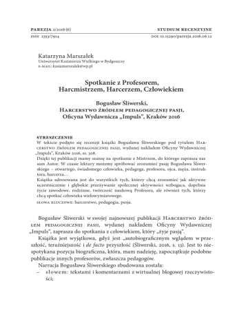 parezja · 2/2016(6) · studium recenzyjne · parezja 2/2016 (6) issn 2353/7914 157 studium recenzyjne doi: 10.15290/parezja.2016.06.12 Katarzyna Marszałek Uniwersytet Kazimierza Wielkiego w Bydgoszczy e-mail: [email protected] Spotkanie z Profesorem, Harcmistrzem, Harcerzem, Człowiekiem Bogusław Śliwerski, Harcerstwo źródłem pedagogicznej pasji, Oficyna Wydawnicza „Impuls”, Kraków 2016 streszczenie W tekście podjęto się recenzji książki Bogusława Śliwerskiego pod tytułem Harcerstwo źródłem pedagogicznej pasji, wydanej nakładem Oficyny Wydawniczej „Impuls”, Kraków 2016, ss. 308. Dzięki tej publikacji mamy szansę na spotkanie z Mistrzem, do którego zaprasza nas sam Autor. W czasie lektury możemy spróbować zrozumieć pasję Bogusława Śliwerskiego – otwartego, świadomego człowieka, pedagoga, profesora, ojca, męża, instruktora, harcerza… Książka adresowana jest do wszystkich tych, którzy chcą zrozumieć jak aktywne uczestniczenie i głębokie przeżywanie społecznej aktywności wzbogaca, dopełnia życie zawodowe, rodzinne, twórczość naukową Profesora, ale również tych, którzy chcą spotkać człowieka wielowymiarowego. słowa kluczowe: harcerstwo, pedagogia, pasja. Bogusław Śliwerski w swojej najnowszej publikacji Harcerstwo źródłem pedagogicznej pasji, wydanej nakładem Oficyny Wydawniczej „Impuls”, zaprasza do spotkania z człowiekiem, który „żyje pasją”. Książka jest wyjątkowa, gdyż jest „autobiograficznym wglądem w przeszłość, teraźniejszość i de facto przyszłość (Śliwerski, 2016, s. 13). Jest to niespotykana pozycja biograficzna, która, mam nadzieję, zapoczątkuje podobne publikacje innych profesorów, zwłaszcza pedagogów. Narracja Bogusława Śliwerskiego zbudowana została: – s łowem : tekstami i komentarzami z wirtualnej blogowej rzeczywistości; 158 · k. marszałek · – obr a z em, bogatą szatą graficzną: licznymi fotografiami ze zbiorów prywatnych, skanami dokumentów, kronik, publikacji, okładek. Autor książki informuje czytelnika, że książka została napisana „na bazie (…) referatu w czasie XXVIII Letniej Szkoły Młodych Pedagogów Komitetu Nauk Pedagogicznych PAN, która odbyła się w Sandomierzu w dniach 15–19 września 2014 roku. Tygodniowy cykl prac, debat i warsztatów doktorantów, doktorów i profesorów nauk humanistycznych oraz społecznych z całego kraju został podporządkowany problematyce autobiograficzno-narracyjnej – „Opowiem ci o swojej pasji – słowem, dźwiękiem i obrazem…” (Śliwerski, 2016, s. 11). W publikacji Autor przedstawia swoje zaangażowanie humanistycznego pedagoga w pięciu obszarach: – pedagoga wobec polityki oświatowej (felietony, eseje, ekspertyzy, udział w komisjach, kapitułach konkursów, recenzje itp.); – pedagoga wobec doświadczeń procesu wychowawczego (teorie wychowania a włączanie się w spór o jego istotę i kierunek); – pedagoga wobec etosu pracy własnego środowiska (recenzje blog); – pedagoga jako interweniującego w praktykę humanisty (własna klinika: klasy autorskie, uspołecznienie szkół, kierowanie uczelnią); – pedagoga jako wzoru osobowego (własna biografia, doświadczenia oporu, zysków i strat) (Śliwerski, 2016, s. 13). Jak wspomina Profesor: W polskiej rzeczywistości akademickiej książka autobiograficzna jest wciąż jeszcze rzadko pojawiającym się darem twórczości (Śliwerski, 2016, s. 17). O mistrzach nauk o wychowaniu wiemy tylko tyle, ile oni sami powiedzieli nam o sobie w swoich dziełach czy ile jesteśmy w stanie odtworzyć na podstawie własnych wspomnień z wzajemnych relacji osobistych i/lub zawodowych (Śliwerski, 2016, s. 16). Dzięki tej publikacji mamy szansę na spotkanie z Mistrzem, do którego zaprasza nas sam Autor. W czasie lektury możemy spróbować zrozumieć pasję Bogusława Śliwerskiego – otwartego, świadomego człowieka, pedagoga, profesora, ojca, męża, instruktora, harcerza…, który we wstępie określa: Wszystko, co osiągnąłem w pedagogice i co nadal realizuję w swojej pracy naukowo-badawczej, dydaktycznej, oświatowej i społecznej, ma swoje fundamenty w harcerstwie, którego byłem członkiem, a następnie instruktorem przez łącznie ćwierć wieku (Śliwerski, 2016, s. 14). parezja · 2/2016(6) · studium recenzyjne · 159 Publikacja składa się z siedmiu zasadniczych części. W pierwszej zostajemy zaproszeni na spotkanie z akademickimi oraz harcerskimi Mistrzami Autora. Wspomina w niej m.in. o Oldze Czerniawskiej, Marii Dudzikowej, Sergiuszu Hessenie, Aleksandrze Kamińskim, Karolu Kotłowskim, Jerzym Miecznikowskim, Zygmuncie Mysłakowskim, Bogdanie Nawroczyńskim. Te spotkania pozwalają na pełniejsze zrozumienie kolejnych rozdziałów, w których Autor ukazuje swoja drogę „ku chrześcijańskiej i personalistycznej pedagogice i pedagogii (także harcerskiej)”, jak również odpowiada na pytanie: „pedagogika czy pedagogia harcerska?”. Tę część książki kończy rozdział zamiast zakończenia, czyli co dało mi harcerstwo. Autor stwierdza w nim: [G]dybym miał wymienić tylko to, co było dla mnie najważniejsze, co zyskałem i z czego jestem dumny, to byłyby to wartości społeczno-moralne (m.in. patriotyzm, solidarność, bezinteresowność, spolegliwość, samorządność), osobiste przyjaźnie, uspołecznienie, umocnienie religijności, samodzielność (umiejętność korzystania z wolności osobistej, dzielności, praca nad sobą, przewodniczenie koleżeńskie), pedagogiczne kompetencje (sztuka wspierania innych w rozwoju, wspomagania rozwoju charakteru i umiejętności), szeroko rozumiana wiedza i umiejętności działania na rzecz dobra wspólnego oraz wiedza o świecie” (Śliwerski, 2016, s. 97). Zdobytą wiedzą Profesor od lat dzieli się nie tylko za pomocą swoich publikacji, ale również poprzez wpisy w prowadzonym od lipca 2007 roku blogu „pedagog”. I właśnie temu obszarowi działalno