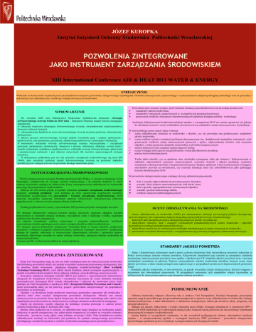 JÓZEF KUROPKA Instytut InŜynierii Ochrony Środowiska Politechniki Wrocławskiej POZWOLENIA ZINTEGROWANE JAKO INSTRUMENT ZARZĄDZANIA ŚRODOWISKIEM XIII International Conference AIR & HEAT 2011 WATER & ENERGY STRESZCZENIE Wskazano na konieczność uzyskania przez przedsiębiorstwa krajowe pozwolenia zintegrowanego zapobiegania i kontroli zanieczyszczeń, opracowanego z wykorzystaniem najlepszej dostępnej technologii oraz na procedury i dokumenty ocen oddziaływania wszelkiego rodzaju inwestycji na środowisko. WPROWADZENIE We wrześniu 2000 roku Ministerstwo Środowiska opublikowało dokument „Strategia zrównowaŜonego rozwoju Polski do 2025 roku”. Dokument obejmuje między innymi następujące zagadnienia: załoŜenia wyjściowe (koncepcja zrównowaŜonego rozwoju, uwarunkowania międzynarodowe, horyzont realizacji strategii), rekomendowane działania na rzecz zrównowaŜonego rozwoju (wymiar społeczny, ekonomiczny i ekologiczny), aktorzy procesu zrównowaŜonego rozwoju (udział wszystkich grup i struktur społecznych i państwowych, rola parlamentu, prezydenta, administracji państwowej i samorządów lokalnych), instrumenty wdraŜania rozwoju zrównowaŜonego (zmiany instytucjonalne i zarządzanie procesem, mechanizmy ekonomiczne, finansowe i prawne, informacja, edukacja, rozwój nauki i transfer technologii, współpraca międzynarodowa, wskaźniki rozwoju zrównowaŜonego, planowanie i monitorowanie realizacji) i jest zbiorem wytycznych dla resortów opracowujących strategie resortowe. W dokumencie podkreślona jest teŜ rola systemów zarządzania środowiskowego wg norm ISO 14000, jako narzędzia realizacji zasady zrównowaŜonego rozwoju na poziomie zakładów produkcyjnych i usługowych oraz na poziomie kaŜdego stanowiska pracy. Pozwolenie takie zostanie wydane, jeŜeli działanie instalacji (przedsiębiorstwa) nie powoduje przekroczeń: standardów jakości środowiska, standardów emisyjnych, ustanowionych w szczegółowych przepisach prawnych, granicznych wielkości emisyjnych charakteryzujących najlepszą dostępną technikę / technologię. Analizując funkcjonowanie konkretnej instalacji zgodnie z wymaganiami BAT nie moŜna ograniczać się jedynie do określenia wartości i oceny wskaźników procesowych czy standardów emisji zanieczyszczeń z tej instalacji. W myśl polskiego prawa naleŜy takŜe wykonać: ocenę oddziaływania instalacji na środowisko i określić, czy nie powoduje ona przekroczenia standardów jakości środowiska, ocenę wielkości emisji z instalacji pod kątem dotrzymywania tzw. dodatkowych standardów emisyjnych, czyli granicznych wielkości emisji zanieczyszczeń gazowych i pyłów, odprowadzania ścieków oraz usuwania odpadów, a takŜe graniczne standardy emisji hałasu i pól elektromagnetycznych, analizę funkcjonowania urządzeń ograniczających emisję, ocenę wymagań dotyczących energochłonności i materiałochłonności produkcji, analizę norm technologicznych. Trzeba takŜe określić, czy są spełnione inne, niezbędne wymagania, takie jak istnienie i funkcjonowanie w zakładzie odpowiednich systemów motywacyjnych, systemów kontroli i jakości produkcji, systemów zarządzania ochroną środowiska i bezpieczeństwem pracy. Dopiero spełnienie wyŜej wymienionych wymagań i stan-dardów pozwala na stwierdzenie, czy oceniana instalacja moŜe być zakwalifikowa-na jako spełniająca kryteria określone przez BAT. SYSTEM ZARZĄDZANIA ŚRODOWISKOWEGO W pozwoleniu zintegrowanym organ wydający decyzję administracyjną określa: Wśród szeregu nowych rozwiązań formalno-prawnych jakie Polska, w związku z integracją z Unią Europejską, zaadaptowała do swojego systemu legislacyjnego i do praktyki działania w sferze ochrony środowiska znajdują się dobrowolne formy samoograniczenia oddziaływań na środowisko przez jego instytucjonalnych uŜytkowników. Zaliczyć do nich moŜna przede wszystkim wdraŜanie systemów zarządzania środowiskowego, programy „czystszej produkcji” oraz działania na rzecz ograniczenia uciąŜliwości wyrobów, potwierdzane uzyskiwaniem tzw.„eko-znaków”. Systemy zarządzania środowiskowego (SZŚ) stanowią szczególnie uŜyteczny instrument poprawy efektywności funkcjonowania jednostek gospodarczych w zakresie szeroko pojętej ochrony środowiska. Według projektodawców normy, wprowadzenie SZŚ powinno przynieść następujące korzyści: w obszarze finansowym: redukcja kosztów energii, surowców, usuwania odpadów, kosztów ponoszonych za zaistniałe sytuacje awaryjne, oszczędność czasu i ludzkiego wysiłku, racjonalne skalkulowanie kosztów ubezpieczeń, w zakresie zarządzania: szybsze wykrywanie i usuwanie nieprawidłowości, moŜliwość wprowadzenia działań zapobiegawczych zanim wystąpią szkodliwe efekty środowiskowe, w obszarze prawno-społecznym: polepszenie wizerunku firmy w oczach klientów, polepszenie stosunków z władzami i grupami zainteresowanymi, spełnienie wymogów inwestorów i polepszenie dostępu do kapitału, ułatwienia w otrzymywaniu odpowiednich zezwoleń i uprawnień poprzez prezentację właściwego stosunku do spraw ochrony środowiska, promocja ochrony środowiska na własnym przykładzie, zmiany profilu i technologii produkcji na mniej odpadową. ilość i warunki odprowadzania do powietrza gazów lub pyłów, warunki i ilość ścieków wprowadzanych do wód lub do ziemi, ilość i sposoby zagospodarowania wytwarzanych odpadów, warunki i poziom emitowanego hałasu, wielkość emisji pól elektromagnetycznych. OCENY ODDZIAŁYWANIA NA ŚRODOWISKO Ocena oddziaływania na środowisko (OOŚ) jest instrumentem realizacji prewencyjnej polityki ekologicznej zarówno krajowej, jak i regionalnej, będącej integralną częścią polityki rozwoju zrównowaŜonego. Rola OOŚ jako narzędzia prewencji ekologicznej odnosi się przede wszystkim do: identyfikacji rodzajów, skali i zasięgów ewentualnych ponadnormatywnych stanów środowiska i zagr