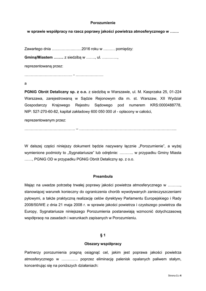 Porozumienie w sprawie współpracy na rzecz poprawy jakości powietrza atmosferycznego w ……. Zawartego dnia ….…………..……2016 roku w ……… pomiędzy: Gminą/Miastem …….. z siedzibą w ……., ul. …………, reprezentowaną przez: ……………………………….. - …………………. a PGNiG Obrót Detaliczny sp. z o.o. z siedzibą w Warszawie, ul. M. Kasprzaka 25, 01-224 Warszawa, zarejestrowaną w Sądzie Rejonowym dla m. st. Warszaw, XII Wydział Gospodarczy Krajowego Rejestru Sądowego pod numerem KRS:0000488778, NIP: 527-270-60-82, kapitał zakładowy 600 050 000 zł - opłacony w całości, reprezentowanym przez: …………………………………. – ………………………………………………………………….. W dalszej części niniejszy dokument będzie nazywany łącznie „Porozumienie”, a wyżej wymienione podmioty to „Sygnatariusze” lub odrębnie: ……….. w przypadku Gminy Miasta ……, PGNiG OD w przypadku PGNiG Obrót Detaliczny sp. z o.o. Preambuła Mając na uwadze potrzebę trwałej poprawy jakości powietrza atmosferycznego w ………., stanowiącej warunek konieczny do ograniczenia chorób wywoływanych zanieczyszczeniami pyłowymi, a także praktyczną realizację celów dyrektywy Parlamentu Europejskiego i Rady 2008/50/WE z dnia 21 maja 2008 r. w sprawie jakości powietrza i czystszego powietrza dla Europy, Sygnatariusze niniejszego Porozumienia postanawiają wzmocnić dotychczasową współpracę na zasadach i warunkach zapisanych w Porozumieniu. §1 Obszary współpracy Partnerzy porozumienia pragną osiągnąć cel, jakim jest poprawa jakości powietrza atmosferycznego w …………. poprzez eliminację palenisk opalanych paliwem stałym, koncentrując się na poniższych działaniach: Strona 1 z 4 1. prowadzenie działań informacyjnych i edukacyjnych zachęcających mieszkańców ……. oraz ……….. przedsiębiorców do dokonania eliminacji palenisk opalanych paliwem stałym, 2. udział PGNiG OD w realizacji przez podmioty wskazane w ust.1 inwestycji polegających na eliminacji palenisk opalanych paliwem stałym, 3. udzielanie merytorycznego wsparcia przez Sygnatariuszy Porozumienia podmiotom wymienionym w ust. 1 na etapie projektowania i realizacji ww. inwestycji, 4. udzielanie ekonomicznego wsparcia przez Sygnatariuszy Porozumienia podmiotom wymienionym w ust. 1, po zrealizowaniu ww. inwestycji. §2 Zobowiązania stron Porozumienia 1. PGNiG OD zobowiązuje się do: 1.1. wspierania finansowego procesu budowy wewnętrznej instalacji gazowej, instalacji c.o. i/lub c.w.u. w budynkach w związku z eliminacją palenisk opalanych paliwem stałym na warunkach określonych w odrębnych umowach, 1.2. zapewnienia dostaw gazu dla nowych odbiorców likwidujących paleniska opalane paliwem stałym na potrzeby zasilania kuchni, instalacji c.o. i/lub c.w.u. na warunkach określonych w odrębnych umowach i wiążących PGNIG OD taryfach, 1.3. wprowadzenia dopuszczalnych prawem upustów na składniki taryf w celu zachęcenia odbiorców do likwidacji paleniska opalanego paliwem stałym, przy uwzględnieniu zasady równego traktowania odbiorców paliwa gazowego, 1.4. wsparcia merytorycznego procesu przyłączeniowego wewnętrznej instalacji gazowej, instalacji c.o. i/lub c.w.u. w budynkach do sieci dystrybucyjnej w związku z eliminacją palenisk opalanych paliwem stałym, 1.5. udostępniania Sygnatariuszowi Porozumienia informacji dotyczących sieci gazowej na terenie nieruchomości, których mieszkańcy ubiegają się o dotacje z budżetu Miasta ………., z zastrzeżeniem powszechnie obowiązujących przepisów prawa, w tym w szczególności ochrony danych osobowych i tajemnicy handlowej. 2. Miasto ……….. zobowiązuje się do: 2.1. inwentaryzacji nieruchomości na których funkcjonują paleniska opalane paliwem stałym oraz skierowania w ten obszar szczególnie dedykowanych działań informacyjno – edukacyjnych, których celem jest eliminacja palenisk na paliwa stałe na korzyść bardziej efektywnych i przyjaznych środowisku źródeł ciepła, a także Strona 2 z 4 udostępniania wyników tej inwentaryzacji PGNiG OD na jej żądanie, z zastrzeżeniem powszechnie obowiązujących przepisów prawa, w tym w szczególności ochrony danych osobowych. 2.2. kontynuowania programu udzielania dotacji podmiotom, które dokonały zmiany wykorzystywanego dotychczas źródła energii na inne, powodujące zmniejszenie emisji do atmosfery, na warunkach określonych Uchwałą ………. Rady Miasta ………. w sprawie kryteriów wyboru inwestycji do finansowania lub dofinansowania oraz trybu postępowania w sprawie udzielania dotacji ekologicznych i sposobu ich rozliczania. 2.3. umieszczenia w obowiązujących dokumentach i procedurach dotyczących sposobu zaopatrzenia w ciepło na etapie przygotowania procesu budowlanego informacji o konieczności postępowania zgodnie z zasadami efektywności energetycznej, ustawą o efektywności energetycznej oraz wymogami Prawa budowlanego. 3. Sygnatariusze Porozumienia zobowiązują się do prowadzenia indywidualnych i wspólnych, także z udziałem innych podmiotów, inicjatyw i działań edukacyjno informacyjnych adresowanych do zarządców nieruchomości mieszkaniowych, projektantów, aktualnych i potencjalnych inwestorów instytucjonalnych i indywidualnych oraz lokalnej społeczności, na temat przyjaznych środowisku i efektywnych źródeł ciepła. §3 Formuła Porozumienia 1. Porozumienie ma charakter otwarty i jawny. 2. Sygnatariusze Porozumienia zapraszają inne podmioty do włączenia się w działania wynikające z celów Porozumienia. 3. Sygnatariusze Porozumienia gwarantują sobie swobodę zawierania indywidualnych umów wzajemnych określających szczegółowe zasady współpracy w zakresie likwidacji palenisk opalanych paliwem stałym. §4 Finansowanie współpracy Uwzględniając fakt, iż większość z przyjętych do realizacji działań w ramach 