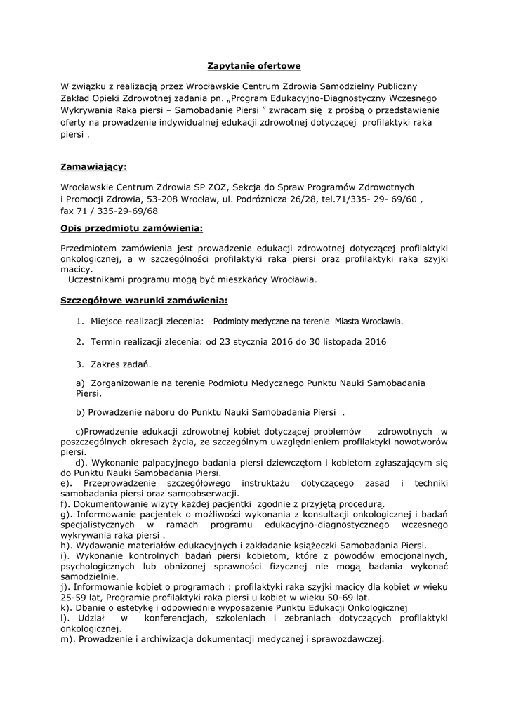 Zapytanie ofertowe W związku z realizacją przez Wrocławskie Centrum Zdrowia Samodzielny Publiczny Zakład Opieki Zdrowotnej zadania pn. „Program Edukacyjno-Diagnostyczny Wczesnego Wykrywania Raka piersi – Samobadanie Piersi ” zwracam się z prośbą o przedstawienie oferty na prowadzenie indywidualnej edukacji zdrowotnej dotyczącej profilaktyki raka piersi . Zamawiający: Wrocławskie Centrum Zdrowia SP ZOZ, Sekcja do Spraw Programów Zdrowotnych i Promocji Zdrowia, 53-208 Wrocław, ul. Podróżnicza 26/28, tel.71/335- 29- 69/60 , fax 71 / 335-29-69/68 Opis przedmiotu zamówienia: Przedmiotem zamówienia jest prowadzenie edukacji zdrowotnej dotyczącej profilaktyki onkologicznej, a w szczególności profilaktyki raka piersi oraz profilaktyki raka szyjki macicy. Uczestnikami programu mogą być mieszkańcy Wrocławia. Szczegółowe warunki zamówienia: 1. Miejsce realizacji zlecenia: Podmioty medyczne na terenie Miasta Wrocławia. 2. Termin realizacji zlecenia: od 23 stycznia 2016 do 30 listopada 2016 3. Zakres zadań. a) Zorganizowanie na terenie Podmiotu Medycznego Punktu Nauki Samobadania Piersi. b) Prowadzenie naboru do Punktu Nauki Samobadania Piersi . c)Prowadzenie edukacji zdrowotnej kobiet dotyczącej problemów zdrowotnych w poszczególnych okresach życia, ze szczególnym uwzględnieniem profilaktyki nowotworów piersi. d). Wykonanie palpacyjnego badania piersi dziewczętom i kobietom zgłaszającym się do Punktu Nauki Samobadania Piersi. e). Przeprowadzenie szczegółowego instruktażu dotyczącego zasad i techniki samobadania piersi oraz samoobserwacji. f). Dokumentowanie wizyty każdej pacjentki zgodnie z przyjętą procedurą. g). Informowanie pacjentek o możliwości wykonania z konsultacji onkologicznej i badań specjalistycznych w ramach programu edukacyjno-diagnostycznego wczesnego wykrywania raka piersi . h). Wydawanie materiałów edukacyjnych i zakładanie książeczki Samobadania Piersi. i). Wykonanie kontrolnych badań piersi kobietom, które z powodów emocjonalnych, psychologicznych lub obniżonej sprawności fizycznej nie mogą badania wykonać samodzielnie. j). Informowanie kobiet o programach : profilaktyki raka szyjki macicy dla kobiet w wieku 25-59 lat, Programie profilaktyki raka piersi u kobiet w wieku 50-69 lat. k). Dbanie o estetykę i odpowiednie wyposażenie Punktu Edukacji Onkologicznej l). Udział w konferencjach, szkoleniach i zebraniach dotyczących profilaktyki onkologicznej. m). Prowadzenie i archiwizacja dokumentacji medycznej i sprawozdawczej. n). Prowadzenie dokumentacji merytoryczno-finansowej wykonanych zadań i ilości przepracowanych godzin. Warunki jakie musi spełniać Zleceniobiorca: w celu rozliczenia się z a) wykształcenie kierunkowe: - pielęgniarka z ukończonymi szkoleniami w zakresie profilaktyki raka piersi, - położna z ukończonymi szkoleniami w zakresie profilaktyki raka piersi b) minimum 4-letnie doświadczenie w ww. edukacji c) aktualne obowiązujące dla danego stanowiska orzeczenie lekarza medycyny pracy o braku przeciwskazań do zatrudnienia lub podpisane oświadczenia o posiadaniu aktualnego orzeczenia lekarza medycyny pracy o braku przeciwskazań do zatrudnienia (załącznik nr 3) d) zaświadczenie o przeszkoleniu BHP ( dotyczy Realizatorów ubiegających się o udzielanie edukacji zdrowotnej na terenie placówek Wrocławskiego Centrum Zdrowia) Oferty proszę zgłaszać osobiście lub listownie w formie pisemnej na druku formularza ofertowego Miejsce i czas złożenia oferty: Wrocławskie Centrum Zdrowia SP ZOZ, ul. Podróżnicza 26/28; 53-208 Wrocław. Oferty przyjmowane są do 19 stycznia 2015 do godziny 10:00 Załącznik: 1. Formularz ofertowy 2. Podpisane przez Dyrekcję Placówki Oświadczenie o nieodpłatnym udostępnieniu pomieszczenia dla Punktu Edukacyjnego 3. Oświadczenie Wrocławskie Centrum Zdrowia SP ZOZ Ul. Podróżnicza 26/28 53-208 Wrocław tel. 71/335-29-69/60 tel./fax 71/335-29-68 FORMULARZ OFERTOWY 1. Realizacja zlecenia: ………………………………………………………………………………………………………………………………………………… ………………………………………………………………………………………………………………………………………………… ………………………………………………………………………………………………………………………………………………… ……………………………………………………………………………………………………………………………………………….. 2. Imię i nazwisko / nazwa składającego ofertę: ............................................................................................................................ ............................................................................................................................ ………………………………………………………………………………………………………………………………………………. 3. Adres: ............................................................................................................. miejscowość kod pocztowy ........................................................................................................................... ulica i numer lokalu ........................................... telefon ....................................................... e-mail 4. PESEL: ................................................................... 5. NIP: ...................................................................... 6. Regon: .................................................................. 7. Dokument potwierdzający kwalifikacje zawodowe: ........................................................................................................................... ...........................................................