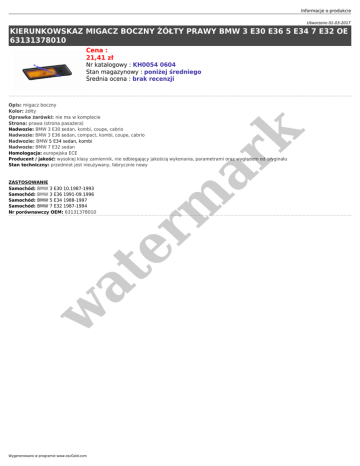 Informacje o produkcie Utworzono 01-03-2017 KIERUNKOWSKAZ MIGACZ BOCZNY ŻÓŁTY PRAWY BMW 3 E30 E36 5 E34 7 E32 OE 63131378010 Cena : 21,41 zł Nr katalogowy : KH0054 0604 Stan magazynowy : poniżej średniego Średnia ocena : brak recenzji w at ZASTOSOWANIE Samochód: BMW 3 E30 10.1987-1993 Samochód: BMW 3 E36 1991-09.1996 Samochód: BMW 5 E34 1988-1997 Samochód: BMW 7 E32 1987-1994 Nr porównawczy OEM: 63131378010 er m ar k Opis: migacz boczny Kolor: żółty Oprawka żarówki: nie ma w komplecie Strona: prawa (strona pasażera) Nadwozie: BMW 3 E30 sedan, kombi, coupe, cabrio Nadwozie: BMW 3 E36 sedan, compact, kombi, coupe, cabrio Nadwozie: BMW 5 E34 sedan, kombi Nadwozie: BMW 7 E32 sedan Homologacja: europejska ECE Producent / jakość: wysokiej klasy zamiennik, nie odbiegający jakością wykonania, parametrami oraz wyglądem od oryginału Stan techniczny: przedmiot jest nieużywany, fabrycznie nowy Wygenerowano w programie www.oscGold.com