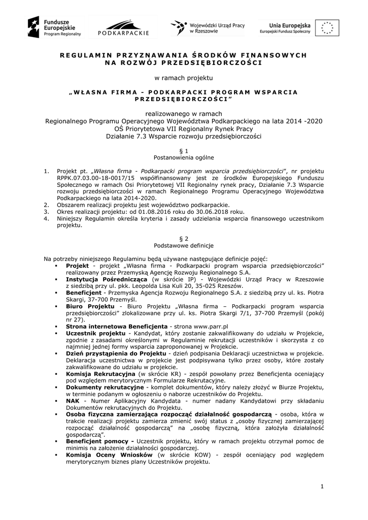 REGULAMIN PRZYZNAWANIA ŚRODKÓW FINANSOWYCH NA ROZWÓJ PRZEDSIĘBIORCZOŚCI w ramach projektu „WŁASNA FIRMA - PODKARPACKI PROGRAM WSPARCIA PRZEDSIĘBIORCZOŚCI” realizowanego w ramach Regionalnego Programu Operacyjnego Województwa Podkarpackiego na lata 2014 -2020 OŚ Priorytetowa VII Regionalny Rynek Pracy Działanie 7.3 Wsparcie rozwoju przedsiębiorczości §1 Postanowienia ogólne 1. 2. 3. 4. Projekt pt. „Własna firma - Podkarpacki program wsparcia przedsiębiorczości”, nr projektu RPPK.07.03.00-18-0017/15 współfinansowany jest ze środków Europejskiego Funduszu Społecznego w ramach Osi Priorytetowej VII Regionalny rynek pracy, Działanie 7.3 Wsparcie rozwoju przedsiębiorczości w ramach Regionalnego Programu Operacyjnego Województwa Podkarpackiego na lata 2014-2020. Obszarem realizacji projektu jest województwo podkarpackie. Okres realizacji projektu: od 01.08.2016 roku do 30.06.2018 roku. Niniejszy Regulamin określa kryteria i zasady udzielania wsparcia finansowego uczestnikom projektu. §2 Podstawowe definicje Na potrzeby niniejszego Regulaminu będą używane następujące definicje pojęć: Projekt - projekt „Własna firma - Podkarpacki program wsparcia przedsiębiorczości” realizowany przez Przemyską Agencję Rozwoju Regionalnego S.A. Instytucja Pośrednicząca (w skrócie IP) - Wojewódzki Urząd Pracy w Rzeszowie z siedzibą przy ul. pkk. Leopolda Lisa Kuli 20, 35-025 Rzeszów. Beneficjent - Przemyska Agencja Rozwoju Regionalnego S.A. z siedzibą przy ul. ks. Piotra Skargi, 37-700 Przemyśl. Biuro Projektu - Biuro Projektu „Własna firma – Podkarpacki program wsparcia przedsiębiorczości” zlokalizowane przy ul. ks. Piotra Skargi 7/1, 37-700 Przemyśl (pokój nr 27). Strona internetowa Beneficjenta - strona www.parr.pl Uczestnik projektu - Kandydat, który zostanie zakwalifikowany do udziału w Projekcie, zgodnie z zasadami określonymi w Regulaminie rekrutacji uczestników i skorzysta z co najmniej jednej formy wsparcia zaproponowanej w Projekcie. Dzień przystąpienia do Projektu - dzień podpisania Deklaracji uczestnictwa w projekcie. Deklaracja uczestnictwa w projekcie jest podpisywana tylko przez osoby, które zostały zakwalifikowane do udziału w projekcie. Komisja Rekrutacyjna (w skrócie KR) - zespół powołany przez Beneficjenta oceniający pod względem merytorycznym Formularze Rekrutacyjne. Dokumenty rekrutacyjne - komplet dokumentów, który należy złożyć w Biurze Projektu, w terminie podanym w ogłoszeniu o naborze uczestników do Projektu. NAK - Numer Aplikacyjny Kandydata - numer nadany Kandydatowi przy składaniu Dokumentów rekrutacyjnych do Projektu. Osoba fizyczna zamierzająca rozpocząć działalność gospodarczą - osoba, która w trakcie realizacji projektu zamierza zmienić swój status z „osoby fizycznej zamierzającej rozpocząć działalność gospodarczą” na „osobę fizyczną, która założyła działalność gospodarczą”. Beneficjent pomocy - Uczestnik projektu, który w ramach projektu otrzymał pomoc de minimis na założenie działalności gospodarczej. Komisja Oceny Wniosków (w skrócie KOW) - zespół oceniający pod względem merytorycznym biznes plany Uczestników projektu. 1 Wsparcie finansowe (dotacja inwestycyjna) - to bezzwrotna pomoc finansowa, udzielana Uczestnikowi projektu, pozwalająca na sfinansowanie początkowych wydatków związanych z podejmowaną działalnością gospodarczą, przyznawana w wysokości nie większej niż 23 000 złotych. Finansowe wsparcie pomostowe - to bezzwrotna pomoc finansowa wypłacana uczestnikowi projektu w formie comiesięcznej dotacji przez okres pierwszych 12 miesięcy licząc od daty rozpoczęcia działalności gospodarczej przez uczestnika projektu, w wysokości nie większej niż 1 600 złotych, ułatwiająca uczestnikowi pomocy prowadzenie działalności gospodarczej w początkowym okresie. Zasada minimalizowania zjawiska creamingu – zasada, zgodnie z którą pomoc finansowa powinna być kierowana wyłącznie do osób, które nie rozpoczęłyby działalności gospodarczej bez uzyskania wsparcia ze środków Europejskiego Funduszu Społecznego. Oświadczenie w powyższym zakresie uczestnicy projektu będą podpisywali przy składaniu biznes planów. §3 Wsparcie finansowe na rozwój przedsiębiorczości - warunki ogólne 1. 2. 3. 4. 5. 6. 7. Uczestnicy projektu mogą ubiegać się o następujące formy wsparcia finansowego na rozwój przedsiębiorczości: 1) wsparcie finansowe (dotacja inwestycyjna), 2) Finansowe wsparcie pomostowe. Wparcie finansowe na rozwój przedsiębiorczości w postaci dotacji inwestycyjnej i finansowego wsparcia pomostowego stanowią pomoc de minimis Warunkiem niezbędnym ubiegania się o przyznanie wsparcia finansowego na rozwój przedsiębiorczości jest ukończenie zaplanowanego w ramach projektu szkolenia z zakresu rozpoczynania i prowadzenia działalności gospodarczej z absencją nie przekraczającą 20% (tj. 8 godzin) oraz skorzystanie z indywidualnego doradztwa w wymiarze 6 godzin. Wsparcia finansowego na rozwój przedsiębiorczości nie będą mogły otrzymać osoby, które są w stanie faktycznie rozpocząć prowadzenia działalności gospodarczej bez uzyskania wsparcia ze środków Europejskiego Funduszu Społecznego (zgodnie z zasadą minimalizowania zjawiska creamingu). Wsparcia finansowego na rozwój przedsiębiorczości nie będą mogły otrzymać osoby, które planują rozpoczęcie działalności gospodarczej w sektorach, o których mowa w art. 1 ust. 1 rozporządzenia Komisji (UE) nr 1407/2013. Podstawą przyznania środków finansowych na rozwój przedsiębiorczości jest zatwierdzony przez Beneficjenta biznes plan złożony przez Uczestnika projektu, zgodnie z wzorem stanowiącym załącznik nr 1 do niniejszego regulaminu. Uczestnik projektu nie może zarejestrować działalności gospodarczej przed dniem złożenia do Beneficjenta biznes planu. §4 Wsparcie finansowe (dotacja inwestycyjna) 1. 2. 3. W