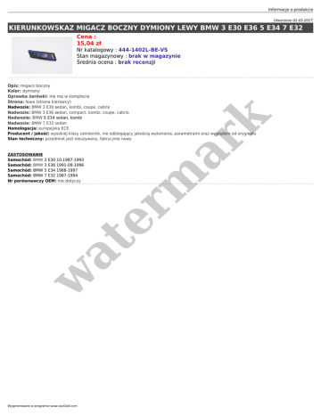 Informacje o produkcie Utworzono 01-03-2017 KIERUNKOWSKAZ MIGACZ BOCZNY DYMIONY LEWY BMW 3 E30 E36 5 E34 7 E32 Cena : 15,04 zł Nr katalogowy : 444-1402L-BE-VS Stan magazynowy : brak w magazynie Średnia ocena : brak recenzji w at ZASTOSOWANIE Samochód: BMW 3 E30 10.1987-1993 Samochód: BMW 3 E36 1991-09.1996 Samochód: BMW 5 E34 1988-1997 Samochód: BMW 7 E32 1987-1994 Nr porównawczy OEM: nie dotyczy er m ar k Opis: migacz boczny Kolor: dymiony Oprawka żarówki: nie ma w komplecie Strona: lewa (strona kierowcy) Nadwozie: BMW 3 E30 sedan, kombi, coupe, cabrio Nadwozie: BMW 3 E36 sedan, compact, kombi, coupe, cabrio Nadwozie: BMW 5 E34 sedan, kombi Nadwozie: BMW 7 E32 sedan Homologacja: europejska ECE Producent / jakość: wysokiej klasy zamiennik, nie odbiegający jakością wykonania, parametrami oraz wyglądem od oryginału Stan techniczny: przedmiot jest nieużywany, fabrycznie nowy Wygenerowano w programie www.oscGold.com