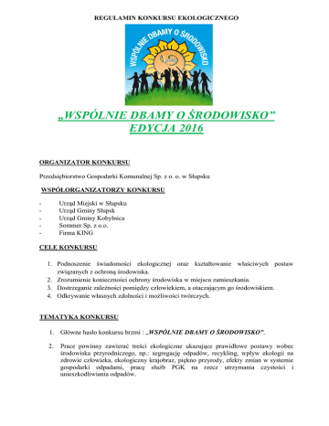 REGULAMIN KONKURSU EKOLOGICZNEGO „WSPÓLNIE DBAMY O ŚRODOWISKO” EDYCJA 2016 ORGANIZATOR KONKURSU Przedsiębiorstwo Gospodarki Komunalnej Sp. z o. o. w Słupsku WSPÓŁORGANIZATORZY KONKURSU Urząd Miejski w Słupsku Urząd Gminy Słupsk Urząd Gminy Kobylnica Sommer Sp. z o.o. Firma KING - CELE KONKURSU 1. Podnoszenie świadomości ekologicznej oraz kształtowanie właściwych postaw związanych z ochroną środowiska. 2. Zrozumienie konieczności ochrony środowiska w miejscu zamieszkania. 3. Dostrzeganie zależności pomiędzy człowiekiem, a otaczającym go środowiskiem. 4. Odkrywanie własnych zdolności i możliwości twórczych. TEMATYKA KONKURSU 1. Główne hasło konkursu brzmi : „WSPÓLNIE DBAMY O ŚRODOWISKO”. 2. Prace powinny zawierać treści ekologiczne ukazujące prawidłowe postawy wobec środowiska przyrodniczego, np.: segregację odpadów, recykling, wpływ ekologii na zdrowie człowieka, ekologiczny krajobraz, piękno przyrody, efekty zmian w systemie gospodarki odpadami, pracę służb PGK na rzecz utrzymania czystości i unieszkodliwiania odpadów. ZASADY KONKURSU 1. Konkurs adresowany jest do młodzieży szkolnej z terenu miasta Słupska oraz Gmin: Słupsk i Kobylnica, w wieku od 10 do 19 lat (uczniowie klas IV-VI szkół podstawowych, gimnazjów oraz szkół ponadgimnazjalnych). 2. Konkurs rozegrany zostanie w trzech kategoriach, z których wyłonieni zostaną nagrodzeni (miejsca 1-3) oraz wyróżnieni. KATEGORIE KONKURSOWE 1. Kategoria plastyczna: plakat użyj haseł ekologicznych zachęcających do ochrony środowiska przyrodniczego, - technika wykonania dowolna, - format plakatu A4 lub A3 2. Kategoria techniczna eko-rzecz - wykorzystaj rzeczy niepotrzebne, nieużyteczne (odpady) do stworzenia czegoś nowego, przydatnego i pożytecznego, - technika wykonania oraz wielkość pracy dowolna 3. Kategoria fotograficzna: fotografia – pokaż piękno otaczającego nas środowiska naturalnego w mieście lub poza nim / ukaż pracę PGK Sp. z o.o. w Słupsku - format zapisu JPG 4. W kategoriach plastycznej i technicznej każdy uczestnik konkursu ma prawo do złożenia tylko jednej pracy wykonanej samodzielnie i indywidualnie (prace zbiorowe nie będą brane pod uwagę), w kategorii fotograficznej każdy uczestnik ma prawo do złożenia maksymalnie trzech prac. Do pracy należy dołączyć: - imię i nazwisko oraz wiek autora; - tytuł pracy; - adres, nazwę i numer szkoły oraz imię i nazwisko nauczyciela/opiekuna, pod kierunkiem którego została przygotowana praca; - numer telefonu kontaktowego oraz adres e-mail 5. Zgłoszenie prac do konkursu jest równoznaczne z przekazaniem praw autorskich do nich na rzecz Organizatora, o których mowa w art. 50 ustawy z dnia 4 lutego 1994r. o prawach autorskich i prawach pokrewnych (Dz. U. z 1994r., Nr 24, poz. 83) oraz ze zgodą na publikację na stronie internetowej Organizatora oraz w materiałach wydawanych przez Organizatora. TERMINY 1. 2. 3. 4. Prace konkursowe w kategoriach plastycznej i technicznej należy dostarczyć osobiście bądź drogą pocztową do siedziby PGK Sp. z o.o. (ul. Szczecińska 112, 76-200 Słupsk). Prace konkursowe w kategorii fotograficznej należy dostarczyć osobiście na nośniku danych lub przesłać na adres e-mailowy [email protected]. Ostateczny termin dostarczenia prac - 23 grudnia 2016 r. Prace zgłoszone po terminie nie będą przyjmowane. Komisja konkursowa, powołana przez Organizatora, z udziałem przedstawicieli Współorganizatorów konkursu, dokona oceny prac i wyłoni laureatów konkursu w dniu 28 grudnia 2016 r. Uroczyste wręczenie nagród i certyfikatów „Młodego Ekologa” planowane jest na drugi tydzień stycznia 2017 r.. O miejscu i terminie wręczenia nagród zwycięzcy i wyróżnieni zostaną powiadomieni telefonicznie. NAGRODY 1. W każdej kategorii konkursowej nagrodzeni zostaną autorzy trzech najlepszych w opinii komisji konkursowej prac. Organizator planuje również wyróżnienie prac szczególnie ciekawych, które nie zostaną zakwalifikowane do głównych nagród. 2. Dla autorów nagrodzonych oraz wyróżnionych prac przewidziane są atrakcyjne nagrody rzeczowe: a) Sprzęt elektroniczny i fotograficzny b) Bony zakupowe c) Ekologiczne gadżety PGK Sp. z o.o. 3. W zależności od poziomu konkursu Organizator zastrzega sobie prawo innego podziału nagród. INFORMACJE DODATKOWE 1. Prace dostarczone na konkurs stanowią własność Organizatora konkursu. 2. Organizator zastrzega sobie prawo publikacji oraz wykorzystywania do celów własnych prac biorących udział w konkursie. 3. Wszelkie informacje dotyczące konkursu można uzyskać pod numerem telefonu: (59) 843 72 55. 4. Aktualne informacje dotyczące konkursu dostępne są na stronie internetowej www.pgkslupsk.pl. I TY ZOSTAŃ MŁODYM EKOLOGIEM ! WEŹ UDZIAŁ W KONKURSIE „WSPÓLNIE DBAMY O ŚRODOWISKO” – edycja 2016