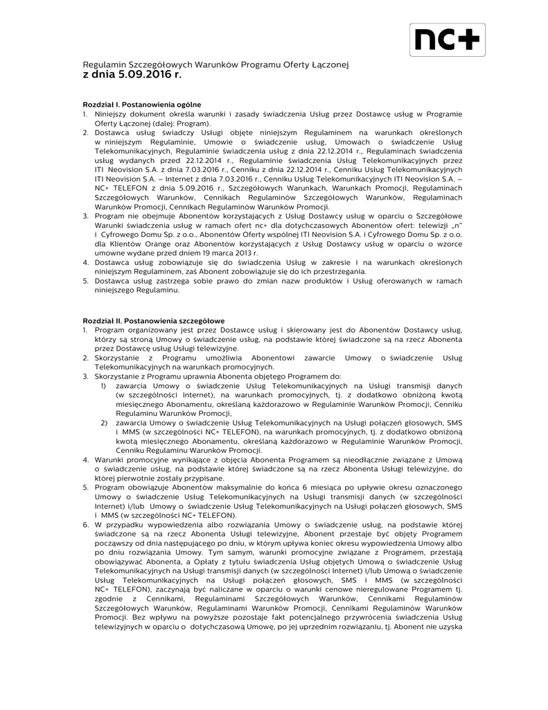 Regulamin Szczegółowych Warunków Programu Oferty Łączonej z dnia 5.09.2016 r. Rozdział I. Postanowienia ogólne 1. Niniejszy dokument określa warunki i zasady świadczenia Usług przez Dostawcę usług w Programie Oferty Łączonej (dalej: Program). 2. Dostawca usług świadczy Usługi objęte niniejszym Regulaminem na warunkach określonych w niniejszym Regulaminie, Umowie o świadczenie usług, Umowach o świadczenie Usług Telekomunikacyjnych, Regulaminie świadczenia usług z dnia 22.12.2014 r., Regulaminach świadczenia usług wydanych przed 22.12.2014 r., Regulaminie świadczenia Usług Telekomunikacyjnych przez ITI Neovision S.A. z dnia 7.03.2016 r., Cenniku z dnia 22.12.2014 r., Cenniku Usług Telekomunikacyjnych ITI Neovision S.A. – Internet z dnia 7.03.2016 r., Cenniku Usług Telekomunikacyjnych ITI Neovision S.A. – NC+ TELEFON z dnia 5.09.2016 r., Szczegółowych Warunkach, Warunkach Promocji, Regulaminach Szczegółowych Warunków, Cennikach Regulaminów Szczegółowych Warunków, Regulaminach Warunków Promocji, Cennikach Regulaminów Warunków Promocji. 3. Program nie obejmuje Abonentów korzystających z Usług Dostawcy usług w oparciu o Szczegółowe Warunki świadczenia usług w ramach ofert nc+ dla dotychczasowych Abonentów ofert: telewizji „n” i Cyfrowego Domu Sp. z o.o., Abonentów Oferty wspólnej ITI Neovision S.A. i Cyfrowego Domu Sp. z o.o. dla Klientów Orange oraz Abonentów korzystających z Usług Dostawcy usług w oparciu o wzorce umowne wydane przed dniem 19 marca 2013 r. 4. Dostawca usług zobowiązuje się do świadczenia Usług w zakresie i na warunkach określonych niniejszym Regulaminem, zaś Abonent zobowiązuje się do ich przestrzegania. 5. Dostawca usług zastrzega sobie prawo do zmian nazw produktów i Usług oferowanych w ramach niniejszego Regulaminu. Rozdział II. Postanowienia szczegółowe 1. Program organizowany jest przez Dostawcę usług i skierowany jest do Abonentów Dostawcy usług, którzy są stroną Umowy o świadczenie usług, na podstawie której świadczone są na rzecz Abonenta przez Dostawcę usług Usługi telewizyjne. 2. Skorzystanie z Programu umożliwia Abonentowi zawarcie Umowy o świadczenie Usług Telekomunikacyjnych na warunkach promocyjnych. 3. Skorzystanie z Programu uprawnia Abonenta objętego Programem do: 1) zawarcia Umowy o świadczenie Usług Telekomunikacyjnych na Usługi transmisji danych (w szczególności Internet), na warunkach promocyjnych, tj. z dodatkowo obniżoną kwotą miesięcznego Abonamentu, określaną każdorazowo w Regulaminie Warunków Promocji, Cenniku Regulaminu Warunków Promocji, 2) zawarcia Umowy o świadczenie Usług Telekomunikacyjnych na Usługi połączeń głosowych, SMS i MMS (w szczególności NC+ TELEFON), na warunkach promocyjnych, tj. z dodatkowo obniżoną kwotą miesięcznego Abonamentu, określaną każdorazowo w Regulaminie Warunków Promocji, Cenniku Regulaminu Warunków Promocji. 4. Warunki promocyjne wynikające z objęcia Abonenta Programem są nieodłącznie związane z Umową o świadczenie usług, na podstawie której świadczone są na rzecz Abonenta Usługi telewizyjne, do której pierwotnie zostały przypisane. 5. Program obowiązuje Abonentów maksymalnie do końca 6 miesiąca po upływie okresu oznaczonego Umowy o świadczenie Usług Telekomunikacyjnych na Usługi transmisji danych (w szczególności Internet) i/lub Umowy o świadczenie Usług Telekomunikacyjnych na Usługi połączeń głosowych, SMS i MMS (w szczególności NC+ TELEFON). 6. W przypadku wypowiedzenia albo rozwiązania Umowy o świadczenie usług, na podstawie której świadczone są na rzecz Abonenta Usługi telewizyjne, Abonent przestaje być objęty Programem począwszy od dnia następującego po dniu, w którym upływa koniec okresu wypowiedzenia Umowy albo po dniu rozwiązania Umowy. Tym samym, warunki promocyjne związane z Programem, przestają obowiązywać Abonenta, a Opłaty z tytułu świadczenia Usług objętych Umową o świadczenie Usług Telekomunikacyjnych na Usługi transmisji danych (w szczególności Internet) i/lub Umową o świadczenie Usług Telekomunikacyjnych na Usługi połączeń głosowych, SMS i MMS (w szczególności NC+ TELEFON), zaczynają być naliczane w oparciu o warunki cenowe nieregulowane Programem tj. zgodnie z Cennikami, Regulaminami Szczegółowych Warunków, Cennikami Regulaminów Szczegółowych Warunków, Regulaminami Warunków Promocji, Cennikami Regulaminów Warunków Promocji. Bez wpływu na powyższe pozostaje fakt potencjalnego przywrócenia świadczenia Usług telewizyjnych w oparciu o dotychczasową Umowę, po jej uprzednim rozwiązaniu, tj. Abonent nie uzyska prawa do kontynuowania korzystania z benefitów wynikających z Programu, z których korzystał przed rozwiązaniem Umowy. Rozdział III. Postanowienia końcowe 1. W nieuregulowanych niniejszym Regulaminem kwestiach zastosowanie będą miały postanowienia Umowy o świadczenie usług, Umów o świadczenie Usług Telekomunikacyjnych, Regulaminu świadczenia usług z dnia 22.12.2014 r., Regulaminów świadczenia usług wydanych przed 22.12.2014 r., Regulaminu świadczenia Usług Telekomunikacyjnych przez ITI Neovision S.A. z dnia 7.03.2016 r., Cennika z dnia 22.12.2014 r., Cennika Usług Telekomunikacyjnych ITI Neovision S.A. – Internet z dnia 7.03.2016 r., Cennika Usług Telekomunikacyjnych ITI Neovision S.A. – NC+ TELEFON z dnia 5.09.2016 r., Szczegółowych Warunków, Warunków Promocji, Regulaminów Szczegółowych Warunków, Cenników Regulaminów Szczegółowych Warunków, Regulaminów Warunków Promocji, Cenników Regulaminów Warunków Promocji. 2. Niniejszy Regulamin wchodzi w życie z dniem 5.09.2016 r.