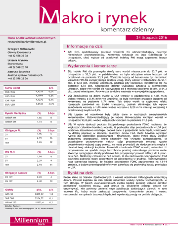 24 listopada 2016 Biuro Analiz Makroekonomicznych [email protected] Informacje na dziś Grzegorz Maliszewski Główny Ekonomista +48 22 598 22 38 Urszula Kryńska Ekonomistka +48 22 598 20 10 GE: Dziś opublikowany zostanie wskaźnik Ifo odzwierciedlający nastroje niemieckich przedsiębiorców. Konsensus wskazuje na jego stabilizację w listopadzie, choć wyższe od oczekiwań indeksy PMI mogą sugerować lepszy odczyt. Wydarzenia i komentarze Mateusz Sutowicz Analityk rynków finansowych +48 22 598 22 36 Kursy walut EU: Indeks PMI dla przemysłu strefy euro wzrósł nieznacznie do 53,7 pkt. w listopadzie z 53,5 pkt. w październiku, co było odczytem nieco lepszym od oczekiwań na poziomie 53,3 pkt. Wyraźnie lepszy od konsensusu był natomiast wskaźnik PMI dla europejskiego sektora usług, który wzrósł w listopadzie do 54,1 pkt. z 52,8 pkt. miesiąc wcześniej, podczas gdy konsensus kształtował się na poziomie 52,9 pkt. Szczególnie dobrze wyglądała sytuacja w niemieckich usługach, gdzie PMI wzrósł do najwyższego od 6 miesięcy poziomu 55 pkt. z 54,2 pkt. przed miesiącem. Potwierdza to dobre nastroje w europejskiej gospodarce. US: Zamówienia na dobra trwałe w USA wzrosły w październiku o 4,8% m/m wobec wzrostu o 0,4% m/m we wrześniu, co było wynikiem znacznie lepszym od konsensusu na poziomie 1,7% m/m. Tak dobry wynik to częściowo efekt rosnących zamówień na środki transportu, jednak eliminując ich wpływ zamówienia wzrosły o 1,0% m/m wobec wzrostu o 0,2% m/m miesiąc wcześniej i oczekiwanej zwyżki o 0,2%. US: Lepsze od oczekiwań były także dane o nastrojach amerykańskich konsumentów. Odzwierciedlający je indeks Uniwersytetu Michigan wzrósł w listopadzie 93,8 pkt. wobec wstępnych wyliczeń na poziomie 91,6 pkt. US: W opisie dyskusji podczas listopadowego posiedzenia FOMC napisano, że większość członków komitetu ocenia, iż podwyżka stóp procentowych w USA jest właściwa stosunkowo niedługo, dopóki dane z gospodarki nadal będą wskazywać na dalszą poprawę w kierunku realizacji celów Fed. Może bowiem wystąpić ryzyko dla stabilności gospodarczej i finansowej, jeżeli rynek pracy ulegnie znacznemu przegrzaniu. Wielu członków Fed wyraziło zaniepokojenie, iż przedłużone utrzymywanie niskich stóp procentowych stwarza ryzyko poszukiwania wyższej stopy zwrotu, co może prowadzić do niedoceniania ryzyka i niewłaściwej alokacji kapitału. Pozostali członkowie FOMC ocenili, natomiast iż przyzwolenie na spadek stopy bezrobocia poniżej naturalnego poziomu może stworzyć sprzyjające efekty podażowe lub przyspieszyć powrót inflacji do 2-proc. celu Fed. Niektórzy członkowie Fed ocenili, iż dla zachowania wiarygodności Fed powinien podnieść stopy procentowe na posiedzeniu w grudniu. Podtrzymujemy nasz scenariusz bazowy, że kolejne posiedzenie FOMC zaplanowane na 13-14 grudnia, z dużym prawdopodobieństwem zakończy się podwyżką kosztu pieniądza w USA. Δ% EUR/PLN 4,4219 0,0% USD/PLN 4,1994 0,5% CHF/PLN 4,1275 0,1% EUR/USD 1,0533 -0,7% Rynek Pieniężny (%) Δ bps WIBOR 1M 1,66 0 WIBOR 3M 1,73 0 Obligacje PL (%) Δ bps 2Y 1,96 6 5Y 2,99 16 10Y 3,65 12 IRS PLN (%) Δ bps 2Y 1,94 6 5Y 2,39 9 10Y 2,93 11 Obligacje bazowe (%) Δ bps DE 10Y 0,28 4 US 10Y 2,40 10 Giełdy pkt. Δ% WIG 30 2089,22 1,8 S&P 500 2204,72 0,1 Nikkei 225 18333,4 0,2 Rynki na dziś Dobre dane ze Stanów Zjednoczonych i wzrost oczekiwań inflacyjnych umacniają dolara. Powrót kapitału do USA osłabia natomiast waluty rynków wschodzących, w tym złotego. W takich uwarunkowaniach ciężko będzie polskiej walucie odrobić poniesione wcześniej straty, stąd presja na osłabienie złotego będzie się utrzymywać. Nie powinny zmienić tego publikacje dzisiejszych danych, w tym indeksu Ifo, który może zaskoczyć pozytywnie. Umocnienie dolara i wzrost rentowności na rynkach bazowych będą też wywierały presję na polskie obligacje. Źródło: Reuters Zamknięcia dnia poprzedniego godz. 16.30, zmiana dzienna `Makro i rynek komentarz dzienny str. 1 Rynek krajowy Kursy walutowe EUR/PLN i EUR/USD 4,50 1,14 4,45 1,12 4,40 1,10 4,35 1,08 4,30 1,06 4,25 1,04 EURPLN EURUSD /prawa skala/ Źródło: Reuters Początek środowej sesji przyniósł nieznaczne umocnienie złotego i spadek kursu EUR/PLN do nawet 4,4010. W stosunku do zamknięcia dnia poprzedniego oznaczało to spadek o blisko 2 grosze. Wzrostowi wyceny złotego pomogła nieznaczna zwyżka eurodolara na międzynarodowym forexie. Zwyżka złotego była jednak krótkotrwała i w popołudniowej części sesji złoty oddał osiągnięte zyski i na zamknięciu notowany był względem euro na poziomie 4,4232, co było poziomem zbliżonym do zamknięcia dnia poprzedniego. Złoty stracił na wartości w ślad za spadkiem eurodolara, po publikacji lepszych od oczekiwań danych z USA, utrwalających oczekiwania na podwyżkę stóp w grudniu. Podobny przebieg miała sesja na rynku papierów skarbowych. Po początkowym spadku rentowności, w popołudniowej części sesji nastąpiło pogorszenie nastrojów i wzrost dochodowości polskiego długu, w ślad za zwyżką rentowności obligacji amerykańskich. Najwięcej na wartości straciły obligacje 5- i 10-letnie, których rentowność w ciągu dnia wzrosła o odpowiednio 16 i 12 bps. Rynki zagraniczne Rentowności polskich obligacji [%] Po względnej stabilizacji w trakcie poprzednich dwóch sesji, w środę dolar powrócił do trendu aprecjacyjnego. W ciągu dnia kurs EUR/USD obniżył się do 1,0525, osiągając poziom najniższy od marca 2015. Gołek eurodolara z grudnia ub. roku stanowi wsparcie dla kursu EUR/USD i może powstrzymywać do przed dalszymi zniżkami. Źródłem umocnienia dolara były lepsze od oczekiwań dane z USA, które nasiliły oczekiwania na podwyżki stóp przez Fed. Z tego też powodu nastąpiły silne zwyżki amerykańskiego długu. Rentowność amerykańskiej 10-latki wzrosła wczoraj o 10 bps do 2,40%. Mniej na wartości stra