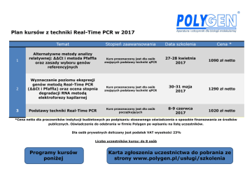 Plan kursów z techniki Real-Time PCR w 2017 Temat Stopień zaawansowania Data szkolenia Kurs przeznaczony jest dla osób znających podstawy techniki qPCR 27-28 kwietnia 2017 1090 zł netto 2 Wyznaczanie poziomu ekspresji genów metodą Real-Time PCR (ΔΔCt i Pfaffla) oraz ocena stopnia degradacji RNA metodą elektroforezy kapilarnej Kurs przeznaczony jest dla osób znających podstawy techniki qPCR 30-31 maja 2017 1290 zł netto 3 Podstawy techniki Real-Time PCR Kurs przeznaczony jest dla osób początkujących 8-9 czerwca 2017 1020 zł netto 1 Alternatywne metody analizy relatywnej: ΔΔCt i metoda Pfaffla oraz zasady wyboru genów referencyjnych Cena * *Cena netto dla pracowników instytucji budżetowych po podpisaniu stosownego oświadczenia o sposobie finansowania ze środków publicznych. Oświadczenie do odebrania w firmie Polygen po wpisaniu na listę uczestników. Dla osób prywatnych doliczany jest podatek VAT wysokości 23% Liczba uczestników kursu: do 8 osób Programy kursów poniżej Karta zgłoszenia uczestnictwa do pobrania ze strony www.polygen.pl/usługi/szkolenia Szkolenie nr 1 Alternatywne metody analizy relatywnej: ΔΔCt i metoda Pfaffla oraz zasady wyboru genów referencyjnych Termin: 27-28 kwietnia 2017 Kurs przeznaczony jest dla osób znających podstawy techniki qPCR Wykłady teoretyczne: Metody analizy relatywnej - ΔΔCt i metoda Pfaffla Metody wyznaczania wydajności reakcji PCR Zasady wyboru genów referencyjnych - technika qNorm oraz wykorzystanie gotowych paneli genów referencyjnych dla wybranych rodzajów organizmów oraz oprogramowanie qBASE Wydajność reakcji RT-PCR oraz zasady wyboru zakresu stężenia RNA Analiza typu „multiplate” – porównania wyników pochodzących z różnych eksperymentów Ćwiczenia laboratoryjne: Doświadczenia - seria I - Przygotowanie reakcji qPCR dla panelu genów referencyjnych z cDNA wyznaczanie krzywej standardowej oraz wydajności reakcji dla potencjalnych genów referencyjnych wybór właściwego genu referencyjnego z sześciogenowego panelu metodą gNorm z wykorzystaniem oprogramowania qBASE Doświadczenia - seria II - Przygotowanie reakcji qPCR dla genów badanych i genów referencyjnych z cDNA wyznaczanie krzywej standardowej oraz wydajności reakcji dla genów badanych eksperyment walidacyjny oraz wybór właściwej metody analizy Doświadczenia – seria III - wyznaczenie względnego poziomu ekspresji genów badanych • zastosowanie metody ΔΔCt i Pfaffla w praktyce oraz analiza typu „multiplate” Cena dwudniowego szkolenia: 1090 zł netto Cena netto dla pracowników instytucji budżetowych po podpisaniu stosownego oświadczenia o sposobie finansowania. Oświadczenie do odebrania po wpisaniu na listę uczestników. Dla osób prywatnych doliczany jest podatek VAT wysokości 23% Szkolenia prowadzone są na aparatach: TOptical Real-Time PCR firmy Biometra, Eco Real-Time PCR firmy PCRMax, Qsep do elektroforezy kapilarnej firmy Bioptic, NanoPhotometr firmy Implen oraz odczynnikach firmy PrimerDesign. Koszt uczestnictwa obejmuje materiały drukowane (część teoretyczną i praktyczną), lunch, kawę i napoje, certyfikat ukończenia kursu. Szkolenie nr 2 Wyznaczanie poziomu ekspresji genów metodą Real-Time PCR (ΔΔCt i Pfaffla) oraz ocena stopnia degradacji RNA metodą elektroforezy kapilarnej Termin: 30-31 maja 2017 Kurs przeznaczony jest dla osób znających podstawy techniki qPCR Wykłady teoretyczne: Przygotowanie prób do reakcji RT-qPCR – błędy związane z izolacją RNA metody oceny ilości, czystości oraz stopnia degradacji RNA – porównanie metod spektroskopowych i elektroforetycznych Metody analizy relatywnej - ΔΔCt i metoda Pfaffla – krótka powtórka ze szkolenia nr 2 Publikowanie wyników zgodnie z zasadami MIQE Ćwiczenia laboratoryjne: Doświadczenia - seria I - Przygotowanie próby do RT-qPCR Izolacja RNA w różnych warunkach – najczęściej popełniane błędy Spektrofotometryczna ocena czystości RNA w mikroobjętości Wyznaczanie stopnia degradacji RNA metodą elektroforezy kapilarnej Doświadczenia - seria II - Przygotowanie reakcji real-time PCR dla genów badanych i genów referencyjnych: Wstępna reakcja real-time PCR po odwrotnej transkrypcji oraz zaplanowanie właściwych kontroli wyznaczenia wydajności reakcji qPCR genów badanych i referencyjnych w zależności od stopnia degradacji RNA Doświadczenia – seria III - Analiza reakcji real-time PCR dla genów badanych i genów referencyjnych: • • Sprawdzenie wpływu kluczowych czynników: metod izolacji RNA, wydajności odwrotnej transkrypcji oraz stopnia degradacji RNA na wyniki badania poziomu ekspresji genów Porównanie wyników analizy relatywnej metodami ΔΔCt i Pfaffla w zależności od stopnia degradacji RNA Cena dwudniowego szkolenia: 1290 zł netto Cena netto dla pracowników instytucji budżetowych po podpisaniu stosownego oświadczenia o sposobie finansowania. Oświadczenie do odebrania po wpisaniu na listę uczestników. Dla osób prywatnych doliczany jest podatek VAT wysokości 23% Szkolenia prowadzone są na aparatach: TOptical Real-Time PCR firmy Biometra, Eco Real-Time PCR firmy PCRMax, Qsep do elektroforezy kapilarnej firmy Bioptic, NanoPhotometr firmy Implen oraz odczynnikach firmy PrimerDesign. Koszt uczestnictwa obejmuje materiały drukowane (część teoretyczną i praktyczną), lunch, kawę i napoje, certyfikat ukończenia kursu. Szkolenie nr 3 Podstawy techniki Real-Time PCR Termin: 8-9 czerwca 2017 Kurs przeznaczony jest dla osób początkujących Wykłady teoretyczne: podstawy techniki Real-Time PCR / wybór odpowiedniego systemu detekcji analiza ilościowa / metody wyznaczania wydajności reakcji PCR planowanie i optymalizacja eksperymentu / wybór metody analizy danych reakcje multipleksowe / funkcja kompensacji kolorów podstawowe błędy w analizie reakcji qPCR publikowanie wyników zgodnie z zasadami MIQE Ćwiczenia laboratoryjne: Doświadczenia - seria I - Technika przygotowania 