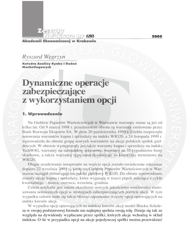 Zeszyty Naukowe nr 680 2005 Akademii Ekonomicznej w Krakowie Ryszard W´grzyn Katedra Analizy Rynku i Badaƒ Marketingowych Dynamiczne operacje zabezpieczajàce z wykorzystaniem opcji 1. Wprowadzenie Na Giełdzie Papierów Wartościowych w Warszawie warranty znane są już od kilku lat. Od 9 marca 1998 r. przedmiotem obrotu są warranty emitowane przez Bank Rozwoju Eksportu SA. W dniu 20 października 1999 r. Giełda rozpoczęła notowania warrantów kupna i sprzedaży na indeks WIG20, a 24 listopada 1999 r. wprowadziła do obrotu grupę nowych warrantów na akcje polskich spółek giełdowych. W obrocie występowały już także warranty kupna i sprzedaży na indeks TechWIG, warranty na subindeksy sektorowe, warranty na 52-tygodniowe bony skarbowe, a także warranty typu amerykańskiego na kontrakty terminowe na WIG20. Długie oczekiwanie inwestorów na wejście opcji zostało uwieńczone sukcesem dopiero 22 września 2003 r., kiedy na Giełdzie Papierów Wartościowych w Warszawie nastąpił debiut opcji na indeks giełdowy WIG20. Do obrotu wprowadzone zostały opcje kupna i sprzedaży, które wygasają w trzeci piątek miesiąca z cyklu kwartalnego – marca, czerwca, września, grudnia. Celem artykułu jest zatem określenie nowych jakościowo możliwości zastosowania notowanych opcji w strategiach zabezpieczających portfele akcji. W tym wypadku celowe stało się także bliższe zapoznanie wyceny opcji opiewających na indeks kursów akcji. W wypadku opcji opiewających na indeksy kursów akcji model Blacka-Scholesa w swojej podstawowej formule nie najlepiej spełnia swoją rolę. Dzieje się tak ze względu na dywidendy wypłacane przez spółki, których akcje wchodzą w skład indeksu. O ile w przypadku opcji na akcje pojedynczej spółki można przewidzieć Ryszard Węgrzyn 76 moment wypłaty dywidendy i ewentualnie pominąć jej wielkość, jeżeli opcja wcześniej wygasa, o tyle przy opcjach indeksowych trudno byłoby określić taki moment, gdyż spółki wypłacają dywidendę w różnych terminach. W tym przypadku zatem istotne staje się wzięcie pod uwagę wypłacanej dywidendy i jej wpływu na wartość opcji. Oznacza to w praktyce stosowanie zmodyfikowanego modelu Blacka-Scholesa uwzględniającego wypłacane dywidendy. Model ten przyjmuje postać1: C = e–δTSN(d1) – e–rTEN(d2), gdzie: – d1 = [ln(S/E)–+ (r – δ + ½σ2)T]σ√ T, d2 = d1 – σ√ T,, S – cena instrumentu bazowego, T – czas do wygaśnięcia, E – cena wykonania, r – stopa procentowa wolna od ryzyka, δ – stopa dywidendy, σ – zmienność (odchylenie standardowe), N(⋅) – dystrybuanta standaryzowanego rozkładu normalnego, 2 1 e – x /2 . Nʼ(⋅) – funkcja gęstości rozkładu normalnego: Nʼ(x) = √ 2Π Z kolei określane za jego pomocą miary ryzyka dla opcji kupna wyliczane są następująco: Delta = e–δTN(d1), – Gamma = e–δTNʼ(d1)/Sσ√ T, Vega (Kappa) = e–δTS TN ′(d1 ), Rho = e–rT TEN(d2), gdzie: delta – oznacza zmianę ceny opcji przypadającą na jednostkową zmianę ceny instrumentu bazowego, gamma – to zmiana delta przy jednostkowej zmianie ceny instrumentu bazowego, vega – zmiana ceny opcji przy zmianie zmienności (volatility) instrumentu bazowego, rho – zmiana ceny opcji przy zmianie stopy procentowej2. 1 R.M. Bookstaber, Option Replication Technology [w:] Advanced Strategies in Financial Risk Management, red. R.J. Schwartz, C.W. Smith, New York Institute of Finance, New York 1998, s. 180; R. Jarrow, S. Turnbull, Derivative Securities, South-Western College Publ., Cincinnati 2000, s. 364. 2 R. Jarrow, S. Turnbull, op. cit., s. 280. Dynamiczne operacje zabezpieczające… 77 Podane miary ryzyka opcji znajdują swoje zastosowanie w budowie portfeli zabezpieczonych odpowiednimi pozycjami w zakresie opcji. 2. Zastosowanie metody delta hedging Operacje zabezpieczające portfel akcji przed ryzykiem kursowym mogą mieć różny charakter i wykorzystywać różne opcje indeksowe. Jeśli chodzi o portfele akcji, pojawia się jednak we wszystkich przypadkach konieczność określenia tzw. skorygowanej wartości portfela, którą wylicza się na podstawie wskaźników β dla poszczególnych akcji. Zadanie to nie jest proste, ponieważ powstaje problem wyboru okresu, dla jakiego wskaźnik ten będzie wyliczany. Istotne jest również, aby wskaźniki te określały relację zmian kursów akcji do zmian indeksu giełdowego, na który opiewają wykorzystywane do zabezpieczania opcje indeksowe3. Przykładowy sposób określania skorygowanej wartości portfela został przedstawiony w tabeli 1. Portfel ten składa się z akcji trzech spółek o określonych wskaźnikach β. Aby uzyskać skorygowaną wartość portfela, pomnożono ilość akcji każdej spółki przez ich cenę, a następnie przez wskaźnik β. Otrzymane w ten sposób skorygowane wartości akcji poszczególnych spółek po ich zsumowaniu stanowią skorygowaną wartość portfela. Tabela 1. Wyliczanie skorygowanej wartości portfela akcji Akcje spółki Ilość akcji w portfelu Cena 1 akcji Wskaźnik β Skorygowana wartość portfela GOGO 3000 25 4,00 300 000 UTIL 5000 60 0,80 240 000 OIL 2000 45 2,00 180 000 – – – 720 000 Razem Źródło: opracowanie własne na podstawie: L.G. McMillan, Options as a Strategic Investment, New York Institute of Finance, New York 1993, s. 542. Tak wyliczoną skorygowaną wartość portfela można zabezpieczyć za pomocą indeksowych opcji sprzedaży, indeksowych opcji kupna, jak również wykorzystując jednocześnie obydwa typy opcji indeksowych. Przy wykorzystaniu obydwu typów opcji można mianowicie utworzyć syntetyczną pozycję sprzedaży indeksowego kontraktu futures. Pozycja ta powstanie poprzez jednoczesną sprzedaż opcji kupna i zakup opcji sprzedaży. 3 Z teoretycznego punktu widzenia problem ten można pominąć przyjmując, że struktura portfela akcji odpowiada dokładnie strukturze portfela indeksu giełdowego. Zmiany wartości portfel