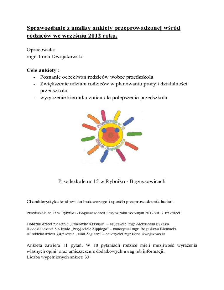 Sprawozdanie z analizy ankiety przeprowadzonej wśród rodziców we wrześniu 2012 roku. Opracowała: mgr Ilona Dwojakowska Cele ankiety : - Poznanie oczekiwań rodziców wobec przedszkola - Zwiększenie udziału rodziców w planowaniu pracy i działalności przedszkola - wytyczenie kierunku zmian dla polepszenia przedszkola. Przedszkole nr 15 w Rybniku - Boguszowicach Charakterystyka środowiska badawczego i sposób przeprowadzenia badań. Przedszkole nr 15 w Rybniku - Boguszowicach liczy w roku szkolnym 2012/2013 65 dzieci. I oddział dzieci 5,6 letnie „Pracowite Krasnale” – nauczyciel mgr Aleksandra Łukasik II oddział dzieci 5,6 letnie „Przyjaciele Zippiego” – nauczyciel mgr Bogusława Biernacka III oddział dzieci 3,4,5 letnie „Mali Żeglarze”– nauczyciel mgr Ilona Dwojakowska Ankieta zawiera 11 pytań. W 10 pytaniach rodzice mieli możliwość wyrażenia własnych opinii oraz umieszczenia dodatkowych uwag lub informacji. Liczba wypełnionych ankiet: 33 Analiza i interpretacja wyników badań Pytanie I Zadania przedszkola. Wybierz najważniejsze zdania. Zadania przedszkola Ilość odpowiedzi Rozwijanie sprawności fizycznej i ruchowej 24 Nauczenie ogólnej kultury i zasad dobrego wychowania 27 Rozwijanie samodzielności i poczucia odpowiedzialności dzieci 23 Kształtowanie nawyków higienicznych, zachowań prozdrowotnych i 22 ekologicznych Przekazywanie tradycji regionalnych i kulturowych 14 Rozwijanie umiejętności zgodnego współżycia w grupie rówieśniczej 23 Wspieranie samodzielnych działań dzieci 22 Przygotowanie dzieci do szkoły 28 Stwarzanie okazji do częstych kontaktów rodziców z przedszkolem 13 Zaproponowanie dzieciom interesujących form spędzania czasu 19 Rozwijanie poczucia solidarności i pomagania sobie nawzajem 21 Wspieranie działań wychowawczych rodziny 13 Uczenie wzajemnej tolerancji i zrozumienia 31 Jeden z rodziców napisał, że jednymi z ważniejszych zadań przedszkola są również zajęcia dodatkowe, teatrzyki i konkursy sportowe Wykres nr 1 Najważniejsze zadania przedszkola. Za najważniejsze zadania przedszkola rodzice uznali Uczenie dzieci wzajemnej tolerancji i zrozumienia (94%) oraz Przygotowanie dzieci do szkoły i Nauczenie ogólnej kultury i zasad dobrego wychowania (85%). Niezwykle ważne dla rodziców jest również Rozwijanie sprawności fizycznej i ruchowej, Wspieranie samodzielnych działań dzieci, Rozwijanie umiejętności zgodnego współżycia w grupie rówieśniczej oraz Rozwijanie samodzielności i poczucia odpowiedzialności dzieci, Kształtowanie u dzieci nawyków higienicznych, zachowań prozdrowotnych i ekologicznych. Takiej odpowiedzi udzieliło prawie 72% rodziców. Nieco ponad połowę rodziców uznało, że ważne w działaniach przedszkola jest: Rozwijanie poczucia solidarności i Pomagania sobie nawzajem, a także Proponowanie dzieciom interesujących form spędzania czasu. Mniej niż połowa ankietowanych uznało za ważne Wspieranie działań wychowawczych rodziny, Przekazywanie tradycji regionalnych i kulturowych i Stwarzanie okazji do częstych kontaktów z przedszkolem. Warto zauważyć, że aż 11 osób zakreśliło wszystkie z podanych propozycji i uznało je jako najważniejsze zadania przedszkola. Pytanie II Czy wymagania stawiane dziecku w przedszkolu, powinny być także stawiane w domu? Odpowiedź TAK NIE Nie udzieliło żadnej odpowiedzi Ilość odpowiedzi 33 0 0 Wielu rodziców wypowiedziało się w jaki sposób oraz jakie wymagania powinny być stawiane dziecku w przedszkolu i w domu. Odpowiadając na pytanie II rodzice wyrazili opinię i podali następujące odpowiedzi, które często w ankiecie powtarzały się: - nauczanie kultury i dobrego zachowania, rozwijanie samodzielności, tolerancji, przekazywanie tradycji - ćwiczenie pamięci poprzez naukę wierszy i piosenek - dobrze wychowywać, uczyć pomagania - dbać o higienę, sprzątać zabawki - kształtować zasady dobrego wychowania, kulturę osobistą, tolerancję w stosunku do innych - wzmacniać poczucie odpowiedzialności, samodzielności, odpowiedzialność dzieci - uczyć solidarności, tolerancji i zrozumienia - rozwijać postawy proekologiczne - uczyć ciekawych form spędzania wolnego czasu - ćwiczyć pisanie - rozwijać sprawność fizyczną, ruchową - nauczyć ogólnej kultury i dobrego zachowania, higieny, sprzątania zabawek i dbania o nie - przygotować do szkoły - wspierać umiejętność nawiązywania kontaktów z rówieśnikami, rozwijanie empatii, współczucia, współpracę, dbanie o te wartości Największy nacisk w tych odpowiedziach rodzice kładli na ukształtowanie w dziecku samodzielności, zasad dobrego wychowania oraz nauczenie bycia tolerancyjnym wobec innych. Pytanie III Jakie formy kontaktów najbardziej Pani odpowiadają? Odpowiedzi Rozmowy indywidualne Zajęcia otwarte dla rodziców Zebrania grupowe Udział rodziców w uroczystościach przedszkolnych Ilość odpowiedzi 26 16 21 19 Informacje umieszczane na gazetkach i tablicach ogłoszeniowych Skrzynka uwag i propozycji rodziców Wyjazdy na wycieczki dzieci i rodziców Gazetka przedszkolna Organizowanie prelekcji z udziałem pedagoga, logopedy i innych specjalistów Inne propozycje rodziców Wykres nr 2 Formy kontaktów nauczyciela z rodzicami. 21 11 15 18 15 0 Kontakty przedszkola z rodzicami są bardzo ważnym elementem we współpracy. Zaproponowano rodzicom wiele form kontaktów. Rodzice mieli możliwość podania więcej niż jedną odpowiedź. Najpopularniejszą formą kontaktów rodziców z nauczycielem są Zebrania grupowe oraz Informacje umieszczane na gazetkach i tablicach ogłoszeniowych. Taką formę preferuje aż 63% badanych rodziców. Kolejną najbardziej odpowiednią formą kontaktów jest Udział w uroczystościach przedszkolnych (57%) oraz umieszczanie informacji na Gazetce przedszkolnej (54%). Prawie połowa rodziców woli, aby odbywały się Zajęcia otwarte dla rodziców oraz 45% ankietowanych chętnie weźmie udział w