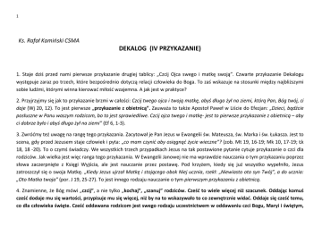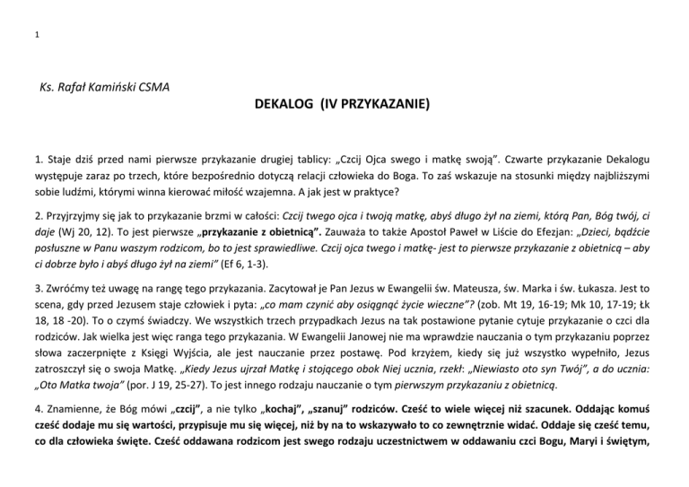 1 Ks. Rafał Kamiński CSMA DEKALOG (IV PRZYKAZANIE) 1. Staje dziś przed nami pierwsze przykazanie drugiej tablicy: „Czcij Ojca swego i matkę swoją”. Czwarte przykazanie Dekalogu występuje zaraz po trzech, które bezpośrednio dotyczą relacji człowieka do Boga. To zaś wskazuje na stosunki między najbliższymi sobie ludźmi, którymi winna kierować miłość wzajemna. A jak jest w praktyce? 2. Przyjrzyjmy się jak to przykazanie brzmi w całości: Czcij twego ojca i twoją matkę, abyś długo żył na ziemi, którą Pan, Bóg twój, ci daje (Wj 20, 12). To jest pierwsze „przykazanie z obietnicą”. Zauważa to także Apostoł Paweł w Liście do Efezjan: „Dzieci, bądźcie posłuszne w Panu waszym rodzicom, bo to jest sprawiedliwe. Czcij ojca twego i matkę- jest to pierwsze przykazanie z obietnicą – aby ci dobrze było i abyś długo żył na ziemi” (Ef 6, 1-3). 3. Zwróćmy też uwagę na rangę tego przykazania. Zacytował je Pan Jezus w Ewangelii św. Mateusza, św. Marka i św. Łukasza. Jest to scena, gdy przed Jezusem staje człowiek i pyta: „co mam czynić aby osiągnąć życie wieczne”? (zob. Mt 19, 16-19; Mk 10, 17-19; Łk 18, 18 -20). To o czymś świadczy. We wszystkich trzech przypadkach Jezus na tak postawione pytanie cytuje przykazanie o czci dla rodziców. Jak wielka jest więc ranga tego przykazania. W Ewangelii Janowej nie ma wprawdzie nauczania o tym przykazaniu poprzez słowa zaczerpnięte z Księgi Wyjścia, ale jest nauczanie przez postawę. Pod krzyżem, kiedy się już wszystko wypełniło, Jezus zatroszczył się o swoja Matkę. „Kiedy Jezus ujrzał Matkę i stojącego obok Niej ucznia, rzekł: „Niewiasto oto syn Twój”, a do ucznia: „Oto Matka twoja” (por. J 19, 25-27). To jest innego rodzaju nauczanie o tym pierwszym przykazaniu z obietnicą. 4. Znamienne, że Bóg mówi „czcij”, a nie tylko „kochaj”, „szanuj” rodziców. Cześć to wiele więcej niż szacunek. Oddając komuś cześć dodaje mu się wartości, przypisuje mu się więcej, niż by na to wskazywało to co zewnętrznie widać. Oddaje się cześć temu, co dla człowieka święte. Cześć oddawana rodzicom jest swego rodzaju uczestnictwem w oddawaniu czci Bogu, Maryi i świętym, 2 którym ta cześć jest należna. Ludzie, którzy nie oddają czci swoim rodzicom, rezygnują z „boskości” w sobie i oddalają się od podobieństwa do Boga, na które zostali uczynieni. 5. Powszechnie przyjmuje się, że czwarte przykazanie adresowane jest do dzieci, synów i córek. Może najbardziej zobowiązuje dorosłe, bądź też dorastające dzieci do zapewnienia własnym rodzicom godziwej starości. Lecz czy to wystarczy? Papież Jan Paweł II, kiedy w Kielcach wygłaszał homilię na temat IV przykazania, podkreślał z mocą: „Z równą siłą jednak [słowa czwartego przykazania] odnoszą się do rodziców: „Pamiętaj, abyś prawdziwie zasługiwał na tę cześć”. Bądź godny imienia ojca! Bądź godna imienia matki!” 6. Dochodzimy tu do sedna sprawy. Czwarte przykazanie Boże dotyczy całej rodziny! A czym ona jest w planie Bożym?: „Mężczyzna i kobieta wraz ze swymi dziećmi tworzą rodzinę. Małżeństwo jest ukierunkowane na dobro małżonków oraz zrodzenie i wychowanie dzieci”. Są to dwa główne i równorzędne cele wspólnoty małżeńskiej, która stoi u progu rodziny. Czwarte przykazanie stoi więc na straży miłości rodzinnej, a czyni to przez pielęgnowanie więzi łączących członków rodziny oraz poszerzanie zakresu wzajemnej odpowiedzialności (por. Kompendium KKK, 456). 7. Przykazanie stoi na straży rodziny, ale czy ci, którzy powołani są do wspierania rodziny, także jej strzegą? Pochodzący z 1966 roku „Międzynarodowy Pakt Praw Obywatelskich i Politycznych”, głosi szumnie w swym 23 art.: „Rodzina jest naturalną i podstawową komórką społeczeństwa i ma prawo do ochrony ze strony społeczeństwa i Państwa”. Za tym aktem, wszyscy wkoło powtarzają głośno: „rodzina to podstawowa komórka społeczna”, ale już nie wszyscy tak chętnie cytują definicję w całości, opuszczając jedno słówka, bardzo ważne słówko: „naturalną”. To nie człowiek, ale Bóg ustanowił tę podstawową strukturę – mężczyznę, kobietę i ich dzieci! Skoro opuszcza się słowo „naturalna”, nie dziwi, że powstają różne chore pomysły. Rok temu, w lutym, jak podała „Rzeczpospolita” brytyjscy nauczyciele otrzymali nowe wytyczne, jak mają się zachowywać na lekcjach. Najważniejsza z nich to zakaz używania w obecności uczniów słów „mama" i „tata". Zamiast nich mają obowiązywać „rodzice". To wszystko po to by – jak argumentowano – dzieci w wieku od czterech do siedmiu lat mogły się nauczyć, że niektórzy ich koledzy mają np. dwie mamy, by dzieci nabrały większej świadomości, że istnieje coś takiego jak pary tej samej płci. Równo rok wcześniej, takie wytyczne otrzymali pracownicy szkockiej publicznej służby zdrowia. Kto następny? Nie mówmy: „to nie u nas”, bo akcja zdejmowania krzyży też nie rozpoczęła się u nas, a dziś polskie środowiska lewicowe zachęcają naszych licealistów do upominania się o swoje prawa, jako osób 3 niewierzących. Jeśli natomiast nie przekonują nas przykłady z zagranicy, mamy rodzime przykłady braku instytucjonalnego wsparcia rodziny. Dla przykładu: - dla lepszej sytuacji podatkowej bardziej „opłaca się” być rozwiedzionym lub samotnym rodzicem niż pełną rodziną, wielodzietność jest uznawana za patologię, a Główny Urząd Statystyczny uznaje za wielodzietne rodziny już z 3 dzieci. - podobnie by uzyskać miejsce dla dziecka w przedszkolu, warto na temat swojej sytuacji rodzinnej nakłamać, stwarzając pozór rodziny rozbitej, wtedy ma się większe szanse. - wciąż zmienia się wiek emerytalny, każąc pracować ludziom do starości, w której chcieliby się na przykład zaopiekować wnukami, uruchamiaj