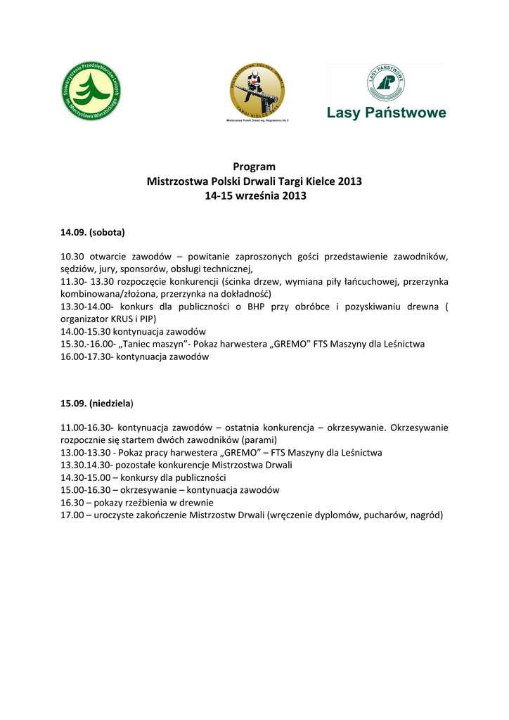 Program Mistrzostwa Polski Drwali Targi Kielce 2013 14-15 września 2013 14.09. (sobota) 10.30 otwarcie zawodów – powitanie zaproszonych gości przedstawienie zawodników, sędziów, jury, sponsorów, obsługi technicznej, 11.30- 13.30 rozpoczęcie konkurencji (ścinka drzew, wymiana piły łańcuchowej, przerzynka kombinowana/złożona, przerzynka na dokładność) 13.30-14.00- konkurs dla publiczności o BHP przy obróbce i pozyskiwaniu drewna ( organizator KRUS i PIP) 14.00-15.30 kontynuacja zawodów 15.30.-16.00- „Taniec maszyn”- Pokaz harwestera „GREMO” FTS Maszyny dla Leśnictwa 16.00-17.30- kontynuacja zawodów 15.09. (niedziela) 11.00-16.30- kontynuacja zawodów – ostatnia konkurencja – okrzesywanie. Okrzesywanie rozpocznie się startem dwóch zawodników (parami) 13.00-13.30 - Pokaz pracy harwestera „GREMO” – FTS Maszyny dla Leśnictwa 13.30.14.30- pozostałe konkurencje Mistrzostwa Drwali 14.30-15.00 – konkursy dla publiczności 15.00-16.30 – okrzesywanie – kontynuacja zawodów 16.30 – pokazy rzeźbienia w drewnie 17.00 – uroczyste zakończenie Mistrzostw Drwali (wręczenie dyplomów, pucharów, nagród)