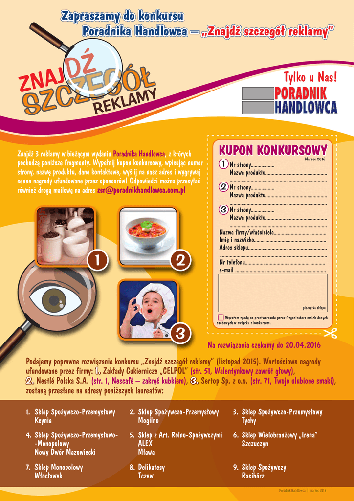 Zapraszamy do konkursu Poradnika Handlowca – „Znajdź szczegół reklamy” Tylko u Nas! Znajdź 3 reklamy w bieżącym wydaniu Poradnika Handlowca, z których pochodzą poniższe fragmenty. Wypełnij kupon konkursowy, wpisując numer strony, nazwę produktu, dane kontaktowe, wyślij na nasz adres i wygrywaj cenne nagrody ufundowane przez sponsorów! Odpowiedzi można przesyłać również drogą mailową na adres [email protected] KUPON KONKURSOWY Nazwa produktu............................................... .......................................................................... 2 Nr strony.................. Nazwa produktu............................................... .......................................................................... 3 Nr strony.................. Nazwa produktu............................................... .......................................................................... Nazwa firmy/właściciela........................................ Imię i nazwisko....................................................... Adres sklepu............................................................ .................................................................................. Nr telefonu............................................................. e-mail ..................................................................... 2 1 Marzec2016 2011 Marzec 1 Nr strony.................. pieczątka sklepu 3 Wyrażam zgodę na przetwarzanie przez Organizatora moich danych osobowych w związku z konkursem. Na rozwiązania czekamy do 20.04.2016 Podajemy poprawne rozwiązanie konkursu „Znajdź szczegół reklamy” (listopad 2015). Wartościowe nagrody ufundowane przez firmy: 1. Zakłady Cukiernicze „CELPOL” (str. 51, Walentynkowy zawrót głowy), 2. Nestlé Polska S.A. (str. 1, Nescafé – zakręć kubkiem), 3. Sertop Sp. z o.o. (str. 71, Twoje ulubione smaki), zostaną przesłane na adresy poniższych laureatów: 1. Sklep Spożywczo-Przemysłowy Kcynia 2.Sklep Spożywczo-Przemysłowy Mogilno 3. Sklep Spożywczo-Przemysłowy Tychy 4.Sklep Spożywczo-Przemysłowo -Monopolowy Nowy Dwór Mazowiecki 5. Sklep z Art. Rolno-Spożywczymi 6.Sklep Wielobranżowy„Irena” ALEX Szczuczyn Mława 7. Sklep Monopolowy Włocławek 8.Delikatesy Tczew 9. Sklep Spożywczy Racibórz Poradnik Handlowca | marzec 2016
