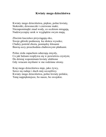 Kwiaty mego dzieciństwa Kwiaty mego dzieciństwa, piękne, polne kwiaty, Stokrotki, dzwoneczki i czerwone maki; Niezapominajki znad wody, co oczkiem mrugają, Nadzwyczajny urok w wyglądzie swym mają; Złociste kaczeńce przyciągają oko, Swoje główki podnoszą ku słońcu wysoko; Chabry pośród zboża, pomiędzy kłosami Bawią oczy przechodnia chabrowymi płatkami. Polne zioła zapachem odurzają zmysły, Co jak balsam rozpływa się w powietrzu czystym; Do dzisiaj wspominam kwiaty ulubione Gdy wracam myślami w me rodzinne strony. Kraj mego dzieciństwa staje, jako żywy, Serce się raduje i duch mój szczęśliwy. Kwiaty mego dzieciństwa, polne kwiaty polskie, Tutaj najpiękniejsze, bo nasze, bo swojskie.