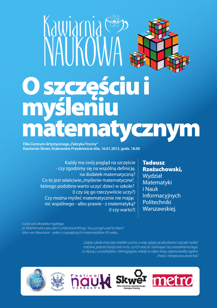 Kawiarnia NAUKOWA O szczęściu i myśleniu matematycznym Filia Centrum Artystycznego „Fabryka Trzciny” Kawiarnia Skwer, Krakowskie Przedmieście 60a, 16.01.2012. godz. 18.00 Każdy ma swój pogląd na szczęście - czy zgodzimy się na wspólną definicję, na dodatek matematyczną? Co to jest właściwie „myślenie matematyczne”, którego podobno warto uczyć dzieci w szkole? (I czy się go rzeczywiście uczy?) Czy można myśleć matematycznie nie mając nic wspólnego - albo prawie - z matematyką? (I czy warto?) Tadeusz Rzeżuchowski, Wydział Matematyki i Nauk Informacyjnych Politechniki Warszawskiej. I cytat od człowieka mądrego: „In Mathematics you don't understand things. You just get used to them.” John von Neumann - jeden z największych matematyków XX wieku. „Gdyby szkoła ćwiczyła intelekt ucznia, a więc gdyby jej absolwenci zaczęli myśleć trzeźwo, patrzeć krytycznie na to, co ich otacza i domagać się uzasadnienia tego, co słyszą z ust polityków i demagogów, wtedy w całym kraju zapanowałby ogólny chaos i nieopisana anarchia.”