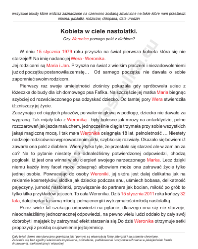 wszystkie teksty które widzisz zaznaczone na czerwono zostan¹ zmienione na takie które nam przeœlesz: imiona: jubilatki, rodziców, ch³opaka, data urodzin Kobieta w ciele nastolatki. u Czy Weronice pomaga pakt z diab³em? ww w. tw oja ko sz ulk a .e W dniu 15 stycznia 1979 roku przysz³a na œwiat pierwsza kobieta która siê nie starzeje!!! Na imiê nadano jej Wera - Weronika. Jej rodzicami s¹ Maria i Jan. Przysz³a na œwiat z wielkim p³aczem i niezadowoleniemi ju¿ od pocz¹tku postanowi³a zemstê… Od samego pocz¹tku nie dawa³a o sobie zapomnieæ swoim rodzicom. Pierwszy raz swoje umiejêtnoœci z³oœnicy pokaza³a gdy spróbowa³a uciec z ³ó¿eczka do budy dla ich domowego psa Fafika. Na szczêœcie jej matka Maria biegn¹c szybciej od rozwœcieczonego psa odzyskaæ dziecko. Od tamtej pory Wera stwierdzi³a i¿ zniszczy jej ¿ycie. Zaczynaj¹c od ci¹g³ych p³aczów, po walenie g³ow¹ w pod³ogê, dziecko nie dawa³o za wygran¹. Tak mija³y lata z Weronik¹ - by³y bolesne jak mrozy na antarktydzie, pe³ne rozczarowañ jak jazda maluchem, jednoczeœnie ci¹gle trzyma³a przy sobie wszystkich jak¹œ magiczn¹ moc¹. I tak ma³a Weronika osi¹gnê³a 18 lat, pe³noletnoœæ … Niestety nadzieje rodziców na wyprowadzenie córki, szybko siê rozwia³y. Okaza³o siê bowiem i¿ zawar³a ona pakt z diab³em. Wiemy tylko tyle, ¿e przesta³a siê starzeæ ale w zamian za co? Na to pytanie niestety nie odnaleŸliœmy potwierdzonej odpowiedzi, chodz¹ pog³oski, i¿ jest ona winna wielu cierpieñ swojego narzeczonego Marka. Lecz dziêki niemu ka¿dy inny facet mo¿e odsapn¹æ albowiem mo¿e ona zatruwaæ ¿ycie tylko jednej osobie. Powracaj¹c do osoby Weroniki, jej skóra jest dalej delikatna jak na reklamie kosmetyków, s³odka jak dziecko podczas snu, uœmiech bobasa, delikatnoœæ pajêczyny, jurnoœæ nastolatki, przywi¹zanie do partnera jak bocian, mi³oœæ po grób to tylko kilka przyk³adów jej cech. To ca³a Weronika. Dziœ 15 stycznia 2011 roku koñczy 32 lata, dalej bêd¹c t¹ sam¹ m³od¹, pe³n¹ energii i wytrzyma³oœci m³od¹ nastolatk¹. Przez wiele lat szukaj¹c odpowiedzi na pytanie, dlaczego ona siê nie starzeje, nieodnaleŸliœmy jednoznacznej odpowiedzi, na pewno wielu ludzi odda³o by ca³y swój dobrobyt i maj¹tek by zatrzymaæ efekt starzenia siê.Do dziœ Weronika otrzymuje setki propozycji z proœb¹ o ujawnienie jej tajemnicy. Ca³y tekst, forma merytoryczna graniczna jak i pomys³ s¹ w³asnoœci¹ firmy Intergraf i s¹ prawnie chronione. Zabrania siê bez zgodny w³aœciciela kopiowane, powielanie, publikowanie i rozpowszechnianie w jakiejkolwiek formie drukowanej, elektronicznej i wizualnej
