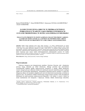 E C O LO GIC AL C H E M IS T R Y AN D E N GIN E E R IN G S Vol. 17, No. 2 2010 Żaneta POLKOWSKA1*, Ilona DEMKOWSKA1, Katarzyna CICHAŁA-KAMROWSKA1 i Jacek NAMIEŚNIK1 ZANIECZYSZCZENIA OBECNE W PRÓBKACH ŚNIEGU POBRANEGO Z WARSTW JAKO ŹRÓDŁO INFORMACJI O STANIE ŚRODOWISKA W DUŻEJ AGLOMERACJI MIEJSKIEJ POLLUTANTS PRESENT IN SNOW SAMPLES COLLECTED FROM VARIOUS LAYERS OF SNOW COVER AS A SOURCE OF INFORMATION ABOUT THE STATE OF ENVIRONMENT IN A BIG URBAN AGGLOMERATION Abstrakt: Próbki śniegu pobierano przez okres około miesiąca z 12 miejsc zlokalizowanych na terenie Trójmiasta. Sześć z nich znajdowało się w pobliżu dróg komunikacyjnych o różnym natężeniu ruchu. Każde z nich miało swój punkt odniesienia oddalony od niego o około 200 m. W próbkach śniegu oznaczano pH, przewodność, zawartość wybranych anionów i kationów. Wartości pH wyznaczono przy użyciu elektrody szklanej połączonej z pH/tlenomierzem mikrokomputerowym, a przewodność konduktometrycznie. Zawartość wybranych jonów oznaczano przy użyciu metod chromatograficznych (chromatografia jonowa). W wyniku przeprowadzonych badań stwierdzono obecność ww. związków w próbkach śniegu na różnych poziomach stężeń, zależnie od czasu oraz miejsca pobierania próbek i warstwy. Słowa kluczowe: śnieg, zanieczyszczenia, warstwy śniegu, korelacje Wprowadzenie Pokrywa śniegowa jest dynamicznym medium. Zarówno fizyczne, jak i chemiczne procesy mogą zmieniać jej skład chemiczny, dlatego powinny być prowadzone wszechstronne badania składu zanieczyszczeń zawartych w śniegu. Skład chemiczny warstw śniegowych jest odbiciem składu ich rodzimych aerozoli atmosferycznych, suchego opadu oraz powierzchni adsorbującej. Akumulacja atmosferycznych zasobów w pokrywie śniegowej zależy od warunków pogodowych oraz od właściwości powierzchni, na której ta pokrywa leży. Na podstawie składu chemicznego śniegu można uzyskać wiele przydatnych informacji na temat poziomu zanieczyszczeń atmosfery i ich zmian w czasie, a także na temat mechanizmu ich transportu i depozycji. Zmiany składu chemicznego atmosfery 1 Katedra Chemii Analitycznej, Wydział Chemiczny, Politechnika Gdańska, ul. G. Narutowicza 11/12, 80-233 Gdańsk, tel. 58 347 21 10, fax 58 347 26 94 * Corresponding author: [email protected] 204 Żaneta Polkowska, Ilona Demkowska, Katarzyna Cichała-Kamrowska i Jacek Namieśnik znajdują odbicie w zmianach składu chemicznego śniegu i należy powiązać je z różnymi źródłami i ścieżkami transportu. W ostatnich latach bardzo często prowadzi się monitoring jakości powietrza na podstawie badań opadów atmosferycznych, w tym także śniegu. Literatura poświęcona temu zagadnieniu jest bardzo obszerna. Powstawanie śniegu i formy jego występowania Śnieg jest to opad atmosferyczny w postaci kryształków lodu. Może on przybierać różne formy. Różnorodność płatków śniegu jest bardzo duża i zależy przede wszystkim od dwóch czynników: temperatury i wilgotności. Podstawową postacią kryształków jest gwiazdka sześcioramienna. Średnice padających śnieżynek mają na ogół kilka milimetrów. Jeśli temperatura powietrza jest wyższa niż –5°C, pojedyncze śnieżynki często łączą się w duże płaty. Przy temperaturach zbliżonych do zera i wyższych od zera śnieg jest określany terminem „mokrego śniegu” lub stanowi mieszaninę śniegu z deszczem. Śnieg nie pada, jeśli temperatura jest wyższa niż +3°C. Śnieg ziarnisty ma postać małych białych, nieprzeświecających ziarenek lodu o średnicy mniejszej od 1 mm. Śnieg ziarnisty przypomina kaszę mannę. Jest to odpowiednik mżawki występującej w ciepłej porze roku. Podczas bardzo silnych mrozów powstają słupki lodowe. Są to kryształki lodu w postaci sześciokątnych prostopadłościanów. Słupki lodowe są doskonale widoczne podczas słonecznej pogody, gdy ścianki ich lśnią, odbijając promienie słoneczne. Ze słupków lodowych zbudowane są chmury pierzaste (cirrus). Krupa śnieżna ma wygląd kulistych ziarenek o średnicy powyżej 1 mm. Ziarenka krupy śnieżnej mają budowę podobną do cząstek śniegu ziarnistego (ziarenka krupy łatwo ulegają zgnieceniu). Jeżeli takie ziarenko jest otoczone warstwą lodu - mówimy o krupie lodowej. Skorupka lodu jest na tyle twarda, że nie ulega zniszczeniu przy zderzeniu z ziemią, ziarna krupy odbijają się. Dlatego czasami krupa lodowa jest mylona z gradem. Deszcz lodowy ma postać przezroczystych ziaren lodu o średnicy od 1 do 3 mm. Interesujący jest sposób powstawania deszczu lodowego. Są to krople deszczu, które zamarzły w powietrzu, zanim dotarły do powierzchni ziemi. Dzieje się to wtedy, gdy przy powierzchni ziemi mamy ujemne temperatury, a na pewnej wysokości występuje ciepła warstwa powietrza o temperaturze dodatniej. Badania śnieżynek dowiodły, że są one dużymi kryształkami lodu lub zrostami kryształków. Proces ich powstawania nazywany jest również procesem zlodzenia chmur. Ponieważ jest on spowodowany współistnieniem kryształków lodu i kropelek przechłodzonej wody, przy temperaturze ujemnej kryształki rosną, kropelki zaś parują. Prężność pary nasyconej nad wodą jest większa niż nad lodem przy tej samej temperaturze ujemnej. Wskutek tego występuje siła ciśnienia przenosząca molekuły pary wodnej z kropelek na kryształki. W atmosferze chmury przechłodzone występują dość często. Pojawienie się w takiej chmurze kryształków lodu gwałtownie narusza stabilność chmury. Kryształki lodu szybko rosną, a kropelki parują. Duże kryształki po osiągnięciu odpowiednich rozmiarów zaczynają wypadać z chmur, zderzając się z przechłodzonymi kropelkami i innymi kryształkami. Przez zetknięciu się z lodem kropelki mogą zamarzać, a kryształki zlepiać się. W ten sposób tworzą się płatki śniegu. Zanieczyszczenia obecne w próbkach śniegu pobranego z warstw jako źród