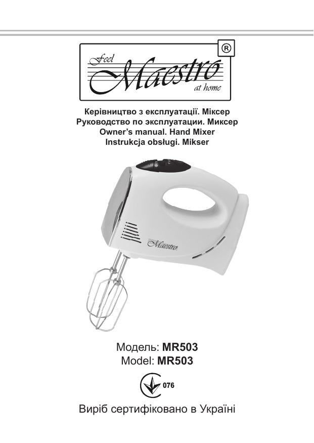 Керівництво з експлуатації. Міксер Руководство по эксплуатации. Миксер Owner’s manual. Hand Mixer Instrukcja obsługi. Mikser Модель: MR503 Model: MR503 076 Виріб сертифіковано в Україні Дякуємо Вам за покупку техніки компанії Функціональність, дизайн і відповідність стандартам якості гарантують Вам надійність і зручність у використанні даного приладу. Будь ласка, уважно прочитайте даний посібник з експлуатації та зберігайте його в якості довідкового посібника протягом усього терміну використання приладу. Міксер призначен тільки для обробки рідких і нетвердих продуктів в побутових (домашніх) умовах. За умови дотримання правил експлуатації та цільового призначення, частини виробу не містять шкідливих для здоров’я речовин. 2 Комплектація виробу Найменування Міксер Вінчик для збивання Вінчик для перемішування (замісу) Керівництво з експлуатації Кіл-сть, шт 1 2 2 1 Технічні характеристики Модель: MR 503 Электроживлення: Рід струму - змінний; Номінальна частота 50Гц; Номінальна напруга (діапазон) 220-240В; Споживча потужність (номінальна): 200 Вт; Клас захисту від ураження електрострумом II; Виконання захисту корпусу електроприводу від проникнення вологи: звичайне, відповідає IPХ0; Кількість швидкостей: 4, плюс режим «Turbo»; Режим роботи: безперервне включення не більше 5 хвилин, пауза від 5 хвилин. 3 Склад приладу Малюнок 1 1. Вінчики для збивання 2. Насадки для перемішування (замісу тіста) 3. Корпус 4. Вимикач / перемикач швидкостей 5. Кнопка виштовхування насадок 6. Кнопка включення режиму «Turbo» Заходи безпеки Шановний користувач, дотримання загальноприйнятих правил безпеки і правил викладених у даному керівництві робить використання даного приладу виключно безпечним. 4 УВАГА! -Ніколи не занурюйте корпус міксера, його мережевий шнур і вилку у воду або інші рідини. -Не допускайте потрапляння води і вологи на електричні частини приладу. -Не беріть прилад мокрими руками. При недотриманні правил виникає небезпека ураження електрострумом! -Ніколи не залишайте увімкнений електроприлад без нагляду! -Завжди виймайте вилку з розетки, якщо Ви закінчили використовувати прилад, а також перед зміною насадок, очищенням і зберіганням. -Забороняється відключати прилад від мережі висмикуванням мережевої вилки з розетки за кабель. -Перед використанням приладу переконайтеся, що напруга живлення зазначена на приладі відповідає напрузі електромережі у Вашому домі. -Використання електричних подовжувачів або перехідників мережевої вилки може стати причиною пошкодження електроприладу. -Якщо ваш прилад внесений з холоду в тепле приміщення, не включайте прилад протягом 2-х годин, щоб уникнути поломки через утворення конденсату на внутрішніх частинах приладу. - Ніколи не використовуйте прилад, якщо пошкоджений шнур або вилка, якщо прилад не працює належним чином, якщо прилад пошкоджений або потрапив у воду. Не використовуйте пошкоджені насадки. Не ремонтуйте прилад самостійно, зверніться в найближчий сервісний центр. -Цей пристрій не призначено для використання дітьми та людь 5 ми з обмеженими фізичними чи розумовими можливостями, а також людьми, що не мають знань і досвіду використання побутових приладів, якщо вони не знаходяться під контролем, або не проінструктовані особою відповідальною за їхню безпеку. -При використанні приладу поблизу дітей, необхідний постійний контроль дорослих. -Н