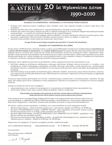 KSIĄŻKA NA ZAMÓWIENIE - WSPÓŁPRACA Z WYDAWNICTWEM ASTRUM • Szukamy firm zainteresowanych współpracą, które chciałyby zlecić nam napisanie książki na temat swojej firmy oraz produktów. • Szukamy też firm, które chcą zareklamować swoje przedsiębiorstwo, kierunki rozwoju, badań. • Szukamy firm, które chcą opisać i pokazać nie tylko w ulotkach i katalogach, ale w produkcie długotrwałym jakim jest książka swoje produkty – w naszych, już wydanych lub gotowych do wydania książkach. • Nasze książki dotyczą tematu szeroko pojętego zdrowia (dbałości o leczenie określonych schorzeń za pomocą grup medy kamentów, suplementów diety) żywienia, kierunków preferowanych w diecie czy ogólnie w medycynie. • opiszemy każdy produkt i sprzęt medyczny podnoszący zdrowotność. Uwaga: Każdą naszą książkę przygotowują specjaliści w branży lub konsultanci. KSIĄŻKA NA ZAMÓWIENIA DLA FIRM! Wydawnictwo Astrum, firma z 20 letnim stażem, wydawca ponad 800 tytułów książkowych i multimedialnych specjalizuje się w pisaniu dla firm książek na zamówienie, tzw. książek dedykowanych. Pracujemy dla firm, których produkty dotyczą szeroko pojętego zdrowia, żywienia, diet, medycyny itp. Swoją ofertę kierujemy również do producentów leków, suplementów diety, sprzętów medycznych itp. Koncentrujemy się na budowie pozytywnego wizerunku firmy i efektywności sprzedaży przez profe sjonalną informację, nie w ulotce, katalogu, ale czymś bardziej trwałym, w tym wypadku w książce. W książkach na zamówienie, w zależności od zlecenia, opisujemy konkretny produkt lub grupę produktów. Zajmujemy się też ogólnymi procesami czy produktami, w które zaangażowany jest nasz zleceniodawca, np.: • Jeśli firma zajmuje się problemem odchudzania, zdrowego odżywiania, ekologią, zdrową żywnością i w związku z tym produkuje np. środki wspomagające odchudzanie, produkty zdrowego odżywiania, wyroby mleczne, itp. z przyjemnością przyjmiemy zlecenie na opisanie tych produktów czy też pozytywnych procesów, które te produkty dla pożądanego efektu powodują. • Jeśli firma kieruje swoje produkty do konkretnej grupy odbiorców (kobiety, mężczyźni), grup wiekowych (dzieci, seniorzy), grup zagrożonych chorobą (dla dietetyków itp.), takie zlecenie też wykonamy i napiszemy na zlecenie książkę, uwzględniając wszystkie te kryteria. Tworzymy indywidualny tekst książki od A do Zet, z możliwością jej wydrukowania w dowolnej urodzie i nakładzie. Do tego służy nam zdobyta przez 20 lat działalności wiedza poligraficzna. Możemy też przygotować i wydrukować stosowne katalogi, ulotki itp. Istnieje też możliwość innych form współpracy: • zakup książek już u nas wydanych, nawiązujących w swej tematyce do działalności firmy, jej produktów itp., • różne formy reklamy (wpis, logo, rozdział, zdjęcia produktów, ulotka w środku itp.). Taką książkę już istniejącą lub napisaną na zlecenie, można oferować firmom, kontrahentom, podwykonawcom lub po prostu wręczać pracownikom jako prezent. Nasze propozycje nie wymagają dużego nakładu finansowego, za to mogą przynieść spore korzyści, gdyż nasze po zycje sprzedają się w nakładach od 2 000 do 100 000 egzemplarzy, dystrybuujemy je w hurtowniach, sklepach specja listycznych i księgarniach w całej Polsce. Ponadto nasze produkty są również w znanych sieciach handlowych. Do tej pory, między innymi napisaliśmy, wydaliśmy oraz wprowadziliśmy na rynek następujące książki: − dla firmy Super Express – około 25 tytułów książkowych – różne tematy, nakłady od 40 000 egz. do 90 000 egz. − dla firmy HANDSOMEMAN książkę „ZDROWE WŁOSY”, gdzie opisaliśmy nowoczesne metody leczenia łysienia prowadzone przez w/w firmę, a także produkty tam stosowane. − dla firmy BIELMAR książkę „TŁUSZCZE ROŚLINNE CZYLI ZDROWIE NA CO DZIEŃ”, opisaliśmy w niej tłuszcze roślinne oraz produkty tej firmy. − Dla koncernu farmaceutycznego napisaliśmy książkę – poradnik dla odchudzających się o suplemencie diety reklamowanym w mediach – nakład od 20 000 egz. do 100 000 egz. Zapraszamy do współpracy. W sprawie szczegółów prosimy o telefon lub maila. www.wydawnictwo-astrum.pl Z poważaniem Prezes Wydawnictwa Astrum Lech Tkaczyk [email protected] tel. 71 328-61-31 tel. kom. 530 746 419