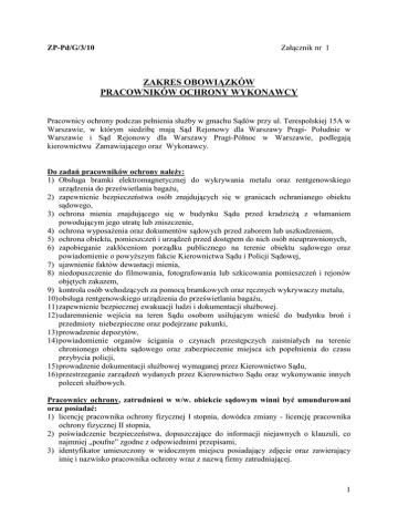 ZP-Pd/G/3/10 Załącznik nr 1 ZAKRES OBOWIĄZKÓW PRACOWNIKÓW OCHRONY WYKONAWCY Pracownicy ochrony podczas pełnienia słuŜby w gmachu Sądów przy ul. Terespolskiej 15A w Warszawie, w którym siedzibę mają Sąd Rejonowy dla Warszawy Pragi- Południe w Warszawie i Sąd Rejonowy dla Warszawy Pragi-Północ w Warszawie, podlegają kierownictwu Zamawiającego oraz Wykonawcy. Do zadań pracowników ochrony naleŜy: 1) Obsługa bramki elektromagnetycznej do wykrywania metalu oraz rentgenowskiego urządzenia do prześwietlania bagaŜu, 2) zapewnienie bezpieczeństwa osób znajdujących się w granicach ochranianego obiektu sądowego, 3) ochrona mienia znajdującego się w budynku Sądu przed kradzieŜą z włamaniem powodującym jego utratę lub zniszczenie, 4) ochrona wyposaŜenia oraz dokumentów sądowych przed zaborem lub uszkodzeniem, 5) ochrona obiektu, pomieszczeń i urządzeń przed dostępem do nich osób nieuprawnionych, 6) zapobieganie zakłóceniom porządku publicznego na terenie obiektu sądowego oraz powiadomienie o powyŜszym fakcie Kierownictwa Sądu i Policji Sądowej, 7) ujawnienie faktów dewastacji mienia, 8) niedopuszczenie do filmowania, fotografowania lub szkicowania pomieszczeń i rejonów objętych zakazem, 9) kontrola osób wchodzących za pomocą bramkowych oraz ręcznych wykrywaczy metalu, 10) obsługa rentgenowskiego urządzenia do prześwietlania bagaŜu, 11) zapewnienie bezpiecznej ewakuacji ludzi i dokumentacji słuŜbowej. 12) udaremnienie wejścia na teren Sądu osobom usiłującym wnieść do budynku broń i przedmioty niebezpieczne oraz podejrzane pakunki, 13) prowadzenie depozytów, 14) powiadomienie organów ścigania o czynach przestępczych zaistniałych na terenie chronionego obiektu sądowego oraz zabezpieczenie miejsca ich popełnienia do czasu przybycia policji, 15) prowadzenie dokumentacji słuŜbowej wymaganej przez Kierownictwo Sądu, 16) przestrzeganie zarządzeń wydanych przez Kierownictwo Sądu oraz wykonywanie innych poleceń słuŜbowych. Pracownicy ochrony, zatrudnieni w w/w. obiekcie sądowym winni być umundurowani oraz posiadać: 1) licencję pracownika ochrony fizycznej I stopnia, dowódca zmiany - licencję pracownika ochrony fizycznej II stopnia, 2) poświadczenie bezpieczeństwa, dopuszczające do informacji niejawnych o klauzuli, co najmniej „poufne” zgodne z odpowiednimi przepisami, 3) identyfikator umieszczony w widocznym miejscu posiadający zdjęcie oraz zawierający imię i nazwisko pracownika ochrony wraz z nazwą firmy zatrudniającej. 1 Pracownicy ochrony, powinni być wyposaŜenie w środki przymusu bezpośredniego: 1) kajdanki, 2) ręczny miotacz gazu w Ŝelu, 3) pałkę wielofunkcyjną typu TONFA, 4) paralizator elektryczny nie wymagający zezwolenia, 5) ręczny wykrywacz metalu (wejścia do obiektu). Ochrona obiektu sądowego winna być sprawowana przez całą dobę przez wszystkie dni tygodnia, w tym w dni ustawowo i urzędowo wolne od pracy. Do zakresu działania i obowiązków dowódcy zmiany, naleŜy: 1) nadzorowanie i kierowanie wykonywaniem zadań przez pracowników podległej zmiany, zgodnie z dokumentacją ochronną i wytycznymi Zamawiającego, 2) planowanie i kontrola wykonywania zadań przez pracowników ochrony, 3) informowanie na bieŜąco Zamawiającego (kierownictwa sądu) o wszelkich wydarzeniach zaistniałych na ochranianym obiekcie, 4) wykonywanie innych zadań związanych z zapewnieniem bezpieczeństwem chronionego obiektu, zlecanych przez Zamawiającego 5) współpraca z Sekcją Policji Sądowej Wydziału Konwojowego Komendy Stołecznej Policji 6) dokonywanie obchodów ochranianego obiektu sądowego oraz kontrola toku pełnienia słuŜby na posterunkach, 7) przeprowadzanie interwencji w związku z zaistniałymi zagroŜeniami i powiadamianie o tym przełoŜonych, 8) wydawanie środków przymusu bezpośredniego i prowadzenie dokumentacji słuŜbowej, 9) nadzorowanie, przyjmowania i wydawania z depozytu niebezpiecznych narzędzi oraz prowadzenie związanej z tym ewidencji, 10) nadzorowanie, przyjmowania i wydawania kluczy od pomieszczeń szczególnie chronionych oraz prowadzonej związanej z tym ewidencji, 11) w określonym czasie załączanie i wyłączanie systemu alarmowego, 12) prowadzenie obserwacji technicznych systemów zabezpieczeń w tym systemu monitorowania obiektu, 13) nadzór i obsługa urządzeń i systemów alarmowych, 14) przeprowadzanie interwencji związanych z zagroŜeniem bezpieczeństwa oraz powiadamianie słuŜb ratunkowych w sytuacji zaistnienia zagroŜenia, 15) wykonywanie obchodów gmachów sądowych celem ustalenia sytuacji, stanu zagroŜenia i ochrony szczególnie waŜnych pomieszczeń, urządzeń i punktów newralgicznych, 16) dokonywanie kontroli sprawności technicznej środków zabezpieczenia i urządzeń alarmowych oraz podejmowanie przedsięwzięć zmierzających do usunięcia wykrytych niesprawności, 17) rzetelne prowadzenie dokumentacji dotyczącej toku pełnienia słuŜby, 18) sprawdzanie wyglądu zewnętrznego wartowników przed objęciem przez nich słuŜby i w czasie jej pełnienia, 19) sprawdzanie zakresu wiedzy, dotyczącej zadań na wyznaczonym posterunku i udzielanie instruktaŜy wartownikom przed objęciem słuŜby, 2 20) nadzór nad przestrzeganiem zasad naleŜytego i kulturalnego zachowania się pracowników ochrony w stosunku do wszystkich osób znajdujących się w obiekcie, 21) organizowanie słuŜby pracowników ochrony, w taki sposób, aby okresowo następowała rotacja osobowa na posterunkach (celem eliminacji zjawiska tzw. monotonnej pracy), 22) wykonywanie innych poleceń przełoŜonych słuŜbowych. Do zakresu działania i obowiązków pracownika ochrony ( w tym patrolu ) naleŜy: 1) utrzymanie w gotowości do natychmiastowego uŜycia przydzielonych środków przymusu bezpośredniego oraz innego wyposaŜenia, 2) wykonywanie zadań wynikających z tabeli słuŜby i innej dokumentacji ochronnej, 3) dokładna znajomość obowiązków na kaŜdym