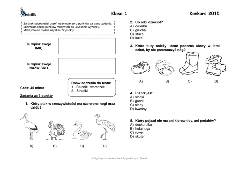 Klasa 1 Za brak odpowiedzi uczeń otrzymuje zero punktów za dane zadanie. Minimalna liczba punktów możliwych do uzyskania wynosi 0. Maksymalnie można uzyskać 72 punkty. Tu wpisz swoje IMIĘ Konkurs 2015 2. A) B) C) D) Co robi dzięcioł? ćwierka grucha stuka kuka 3. Które buty należy ubrać podczas ulewy w letni dzień, by nie przemoczyć nóg? Tu wpisz swoje NAZWISKO Doświadczenia do testu: 1. Balonik i woreczek 2. Strzałki Czas: 45 minut Zadania za 3 punkty 1. Który ptak w rzeczywistości ma czerwone nogi oraz dziób? A) B) C) A) B) C) D) 4. A) B) C) D) Pieprz jest: słodki gorzki słony kwaśny 5. A) B) C) D) Który pojazd nie ma ani kierownicy, ani pedałów? deskorolka hulajnoga rower skuter D) © Ogólnopolski Konkurs Nauk Przyrodniczych „Świetlik” Klasa 1 6. Podczas pocierania nadmuchanego o włosy: A) balonik naelektryzuje się B) balonik się powiększy C) balonik się ochłodzi D) balonik namagnesuje się balonika Konkurs 2015 9. A) B) C) D) Które zwierzę nigdy nie korzysta z dziupli drzew? wiewiórka kret puszczyk nietoperz 10. Który rysunek przedstawia narzędzie żniwiarza? Zadania za 4 punkty 7. Który obrazek przedstawia tyranozaura? A) A) B) C) D) 8. Na kartce narysowano strzałkę zwróconą w prawo: A) B) C) D) Możesz ujrzeć ją zwróconą popatrzysz na nią przez: pustą szklankę szklankę z wodą gładką, płaską szybę woreczek śniadaniowy w lewo, jeżeli B) C) D) 11. Wenus była w mitologii boginią miłości. Tę samą nazwę nosi jeszcze: A) galaktyka B) gwiazda C) księżyc D) planeta 12. Którego przyrządu użyjesz, aby w powiększeniu obrazek w książce? A) lunety B) teleskopu C) lupy D) kawałka gładkiej szyby © Ogólnopolski Konkurs Nauk Przyrodniczych „Świetlik” zobaczyć Klasa 1 Zadania za 5 punktów 13. Julka potarła nadmuchanym balonikiem i małym woreczkiem o swoje włosy. Co się stanie, gdy Julka umieści woreczek tuż nad balonikiem? A) woreczek spadnie na podłogę B) woreczek spadnie na balonik C) woreczek odleci do sufitu D) woreczek zawiśnie w powietrzu Konkurs 2015 16. Podczas burzy powstają pioruny. Wówczas: A) nigdy nie widzimy błysków ani grzmotów B) zawsze jednocześnie widzimy błysk i słyszymy grzmot C) najpierw widzimy błysk, a potem słyszymy grzmot D) najpierw słyszymy grzmot, a potem widzimy błysk 17. Ile dni tygodnia ma w swojej nazwie literkę „o”? A) dwa B) trzy C) cztery D) pięć 14. Postaw znak X obok każdego prawdziwego zdania: Ocean jest większy od morza. Pustynie są tylko w Afryce. Aby żarówka świeciła, musi przez nią płynąć prąd. Na Antarktydzie jest bardzo zimno. 18. Michał usłyszał w telewizji: „Już za dziewięć godzin, wraz z nadejściem świtu możemy spodziewać się obfitych opadów śniegu. W ciągu dnia przewidywane są lokalne rozpogodzenia, a w godzinach popołudniowych – deszcz ze śniegiem”. Ile zdań jest prawdziwych? A) 1 B) 2 C) 3 D) 4 O jakiej porze Michał wysłuchał tych słów? A) rano B) w południe C) po południu D) późnym wieczorem 15. Zamiast kropek wstaw wyraz pasujący do zdania: „Byk jest ojcem ………………..” A) jagnięcia B) jałówki C) szczenięcia D) źrebięcia © Ogólnopolski Konkurs Nauk Przyrodniczych „Świetlik”