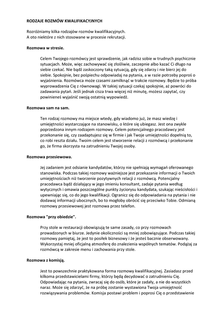 RODZAJE ROZMÓW KWALIFIKACYJNYCH Rozróżniamy kilka rodzajów rozmów kwalifikacyjnych. A oto niektóre z nich stosowane w procesie rekrutacji. Rozmowa w stresie. Celem Twojego rozmówcy jest sprawdzenie, jak radzisz sobie w trudnych psychicznie sytuacjach. Może, więc zachowywać się złośliwie, zaczepnie albo kazać Ci długo na siebie czekać. Nie bądź zaskoczony taką sytuacją, gdy się zdarzy i nie bierz jej do siebie. Spokojnie, bez pośpiechu odpowiadaj na pytania, a w razie potrzeby poproś o wyjaśnienia. Rozmówca może czasami zamilknąć w trakcie rozmowy. Będzie to próba wyprowadzenia Cię z równowagi. W takiej sytuacji czekaj spokojnie, aż powróci do zadawania pytań. Jeśli jednak cisza trwa więcej niż minutę, możesz zapytać, czy powinieneś wyjaśnić swoją ostatnią wypowiedź. Rozmowa sam na sam. Ten rodzaj rozmowy ma miejsce wtedy, gdy wiadomo już, że masz wiedzę i umiejętności wystarczające na stanowisku, o które się ubiegasz. Jest ona zwykle poprzedzona innym rodzajem rozmowy. Celem potencjalnego pracodawcy jest przekonanie się, czy zaadaptujesz się w firmie i jak Twoje umiejętności dopełnią to, co robi reszta działu. Twoim celem jest stworzenie relacji z rozmówcą i przekonanie go, że firma skorzysta na zatrudnieniu Twojej osoby. Rozmowa przesiewowa. Jej zadaniem jest odsianie kandydatów, którzy nie spełniają wymagań oferowanego stanowiska. Podczas takiej rozmowy ważniejsze jest przekazanie informacji o Twoich umiejętnościach niż tworzenie pozytywnych relacji z rozmówcą. Potencjalny pracodawca bądź działający w jego imieniu konsultant, zadaje pytania według wytycznych i omawia poszczególne punkty życiorysu kandydata, szukając nieścisłości i upewniając się, co do jego kwalifikacji. Ogranicz się do odpowiadania na pytania i nie dodawaj informacji ubocznych, bo to mogłoby obrócić się przeciwko Tobie. Odmianą rozmowy przesiewowej jest rozmowa przez telefon. Rozmowa "przy obiedzie". Przy stole w restauracji obowiązują te same zasady, co przy rozmowach prowadzonych w biurze. Jedynie okoliczności są mniej zobowiązujące. Podczas takiej rozmowy pamiętaj, że jest to posiłek biznesowy i że jesteś bacznie obserwowany. Wykorzystaj mniej oficjalną atmosferę do znalezienia wspólnych tematów. Podążaj za rozmówcą w zakresie menu i zachowania przy stole. Rozmowa z komisją. Jest to powszechnie praktykowana forma rozmowy kwalifikacyjnej. Zasiadasz przed kilkoma przedstawicielami firmy, którzy będą decydować o zatrudnieniu Cię. Odpowiadając na pytania, zwracaj się do osób, które je zadały, a nie do wszystkich naraz. Może się zdarzyć, że na próbę zostanie wystawiona Twoja umiejętność rozwiązywania problemów. Komisja postawi problem i poprosi Cię o przedstawienie propozycji rozwiązania go. Nie musisz szukać odpowiedzi perfekcyjnych - zresztą takie zwykle naprawdę nie istnieją. Rozmówcy chcą jedynie poznać Twój sposób rozumowania i wykorzystywania umiejętności w sytuacjach z życia wziętych. Rozmowa grupowa. Najczęściej celem takiej rozmowy jest wykrycie umiejętności przywódczych przyszłych menedżerów i pracowników obsługi klienta. Najlepszych kandydatów zbiera się w nieformalnej atmosferze. Rozmówca przedstawia temat i rozpoczyna dyskusję. Celem jest sprawdzenie, jak zachowujesz się wśród ludzi i jak używasz swej wiedzy i umiejętności przekonywania do zdobycia poparcia innych osób. Jeśli dobrze wypadniesz, zapewne zostaniesz zaproszony na rozmowę indywidualną. Rozmowa przez telefon. Rozmowy przez telefon mają z reguły charakter rozmów przesiewowych i mają na celu eliminację słabszych kandydatów. Telefon z firmy może być zupełnie nieoczekiwany, a zwykła rozmowa o Twoim życiorysie może przekształcić się w rozmowę kwalifikacyjną. Twoim celem jest doprowadzenie do spotkania twarzą w twarz.