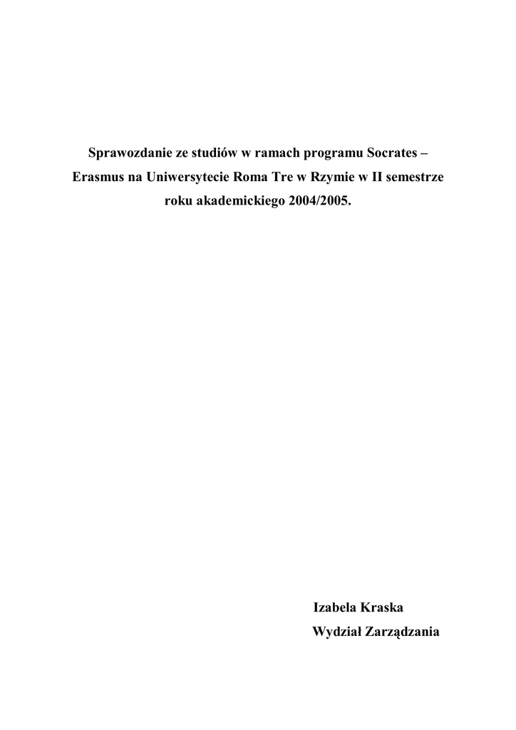 Sprawozdanie ze studiów w ramach programu Socrates – Erasmus na Uniwersytecie Roma Tre w Rzymie w II semestrze roku akademickiego 2004/2005. Izabela Kraska Wydział Zarządzania 1. Geneza wyjazdu na wymianę. Rozpoczynając studia na Wydziale Zarządzania Politechniki Częstochowskiej miałam w planach skorzystanie z wymiany studenckiej między tą uczelnią a innym ośrodkiem zagranicznym. W obecnych czasach, kiedy sam dyplom wyższej uczelni jest niewystarczający aby znaleźć dobrą pracę, jakakolwiek dodatkowa aktywność jest bardzo cenna. Uczestnicy wymian międzynarodowych, ciekawych praktyk i stażów oraz osoby angażujące się w działalność różnych organizacji np. AIESEC mają większe szanse na zatrudnienie po studiach niż Ci, którzy nic nie robią poza studiowaniem. Bardzo chciałam pojechać do Włoch, ponieważ oprócz angielskiego, uczyłam się tego języka. Jednak brałam pod uwagę także inne ośrodki, gdybym nie zakwalifikowała się na wyjazd do Rzymu lub Perugii. Wykorzystałam wszystkie możliwości jakie oferuje Politechnika Częstochowska w zakresie uzyskania informacji na temat Programu Sokrates – Erasmus. Szczególnie cenne były spotkania informacyjne organizowane dla studentów zainteresowanych programem oraz indywidualne konsultacje z koordynatorami uczelnianym i wydziałowym. W wyniku postępowania kwalifikacyjnego, które obejmowało m. in. egzamin z języka obcego, zakwalifikowałam się na wyjazd do Rzymu na Uniwersytet Roma Tre. 2. Formalności przed wyjazdem. W związku z tym, że studia we Włoszech w II semestrze rozpoczynają się na początku lutego, musiałam przyjechać do Rzymu co najmniej miesiąc wcześniej, aby załatwić wszelkie niezbędne formalności. Przyjazd w styczniu wiązał się z koniecznością wcześniejszego zaliczenia wszystkich przedmiotów na Politechnice Częstochowskiej i zdania egzaminów w ramach Indywidualnej Organizacji Studiów. Ponadto musiałam wysłać do Rzymu niezbędne dokumenty ( Learning Agrement, Transcript of Records) oraz zgłoszenie na kurs języka włoskiego, organizowany na Uniwersytecie Roma Tre. Po uzyskaniu akceptacji strony włoskiej ( mail od koordynatora Wydziału Ekonomii – Facolta di Ekonomia) miałam pewność, że dopełniłam wszystkie niezbędne obowiązki wobec uczelni partnerskiej. Pozostawała tylko kwestia znalezienia mieszkania w Rzymie. Bardzo pomocna okazała się organizacja CTS ( pomagająca znaleźć kwatery). Adres mailowy do tej organizacji: [email protected] uzyskałam od kolegi, który studiował w Rzymie rok wcześniej. Dzięki rozmowom z tym kolegą uzyskałam bardzo dużo cennych informacji i praktycznych porad. CTS przesłał mi mail do właścicielki mieszkania. Za pośrednictwem internetu i telefonu uzyskałam informacje n/t mieszkania, okolicy, ceny wynajmu itp. Zdecydowałam się wynająć to mieszkanie na okres studiów za granicą i umówiłam się z właścicielką na dzień mojego przyjazdu. 3. Podróż do Rzymu. Najszybszy i chyba najtańszy sposób dotarcia do Rzymu to obecnie samolot. Cena przelotu w obie strony na trasie Katowice Pyrzowice – Roma Ciampino waha się między 330 PLN – 650 PLN ( 165 PLN – 325 PLN w jedną stronę) w zależności od terminu podróży. Przelot trwa ok. 1,5 godziny. Dla porównania podróż autokarem, trwająca ok. 24 godzin kosztuje nie mniej niż 500 zł w obie strony ( 250 PLN w jedną stronę). Do Rzymu latają z Polski trzy tanie linie lotnicze: Wizz Air (z Katowic), Centralwings i Sky Europe ( z Warszawy). Ja korzystałam z usług linii Wizz Air. Na stronie internetowej www.wizzair.com można sprawdzić ceny dostępnych połączeń, a także dokonać rezerwacji ( jeśli posiada się kartę kredytową, tzw. kartę wypukłą). W przypadku braku karty kredytowej można skorzystać z usług infolinii: 022 351 94 99, gdzie operator pomoże zarezerwować lot i poda numer konta bankowego, na który należy dokonać przelewu środków za przelot. Należy zwracać uwagę na to, że ceny biletów bardzo się wahają w zależności od terminu podróży. Np. w jeden dzień cena jest bardzo niska, zaś przelot następnego dnia jest już dwa razy droższy. Dlatego najlepiej zaplanować podróż w ten dzień, kiedy cena będzie najniższa. Można poszukać tych informacji na stronie internetowej lub po prostu zapytać operatora infolinii. Adresy internetowe pozostałych tanich linii lotniczych: www.centralwings.pl www.skyeurope.com 4. Pierwsze dni w nowym mieście. Przed przyjazdem do Rzymu należy zaopatrzyć się w dokładną mapę ( obejmująca nie tylko centrum, ale całe miasto) oraz kupić dobry przewodnik. Bez mapy trudno byłoby mi trafić z lotniska na ulicę, gdzie wynajmowałam mieszkanie. Dzięki przewodnikowi dowiedziałam się, że zamiast brać drogą taksówkę mogę bez problemu dojechać na miejsce autobusem Cotral ( kursuje z lotniska co pół godziny), a potem metrem – łączny koszt 3 Euro zamiast prawdopodobnie minimum 50 Euro. Wynajmując mieszkanie ważne jest, aby dokładnie czytać umowę. Wyszczególniona jest tam miesięczna cena wynajmu, a także kaucja zwrotna. Umowa może zawierać dodatkowe rzeczy, najczęściej zobowiązania wynajmującego do zachowania porządku, przestrzegania ciszy nocnej itp. Kategorycznie zabronione jest tzw. „nocowanie” znajomych lub członków rodziny. W przypadku wykrycia tego faktu niektórzy właściciele mogą zadzwonić po policję, rozwiązać umowę, a w najlepszym wypadku nie zwrócić kaucji. Ja przyjechałam do Rzymu z bratem, który pomógł mi przewieźć bagaże. Jednak wcześniej poinformowałam właścicielkę i uzyskałam jej zgodę na to, aby brat mógł spędzić ze mną w Rzymie 4 dni. Przed rozpoczęciem studiów musiałam załatwić wszystkie niezbędne formalności, a także poświęciłam czas na poznawanie miasta. Do najważniejszych spraw należały: rejestracja w Biurze Spraw Międzynarodowych Uniwersytetu ( Uffizio Relazioni Internazi