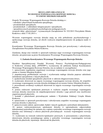 REGULAMIN ORGANIZACJI WCZESNEGO WSPOMAGANIA ROZWOJU DZIECKA W GMINIE MIEJSKIEJ KRAKÓW Zespoły Wczesnego Wspomagania Rozwoju Dziecka działają w : - szkołach i placówkach kształcenia specjalnego, - przedszkolach specjalnych, - przedszkolach z oddziałami integracyjnymi i specjalnymi, - specjalistycznych poradniach psychologiczno-pedagogicznych, zwanych dalej „placówkami”, wyznaczonych Zarządzeniem Nr 352/2015 Prezydenta Miasta Krakowa z dnia 17.02.2015 r. Wczesne wspomaganie rozwoju dziecka mają na celu pobudzenie psychoruchowego i społecznego rozwoju dziecka, od chwili wykrycia niepełnosprawności do podjęcia nauki w szkole. Koordynator Wczesnego Wspomagania Rozwoju Dziecka jest powoływany i odwoływany Zarządzeniem Prezydenta Miasta Krakowa. Zażalenia, skargi oraz wnioski w sprawach realizacji zajęć wczesnego wspomagania rozwoju dziecka przyjmowane są przez Koordynatora Wczesnego Wspomagania Rozwoju Dziecka. I. Zadania Koordynatora Wczesnego Wspomagania Rozwoju Dziecka Dyrektor Specjalistycznej Poradni Wczesnej Pomocy Psychologiczno-Pedagogicznej w Krakowie (zwanej dalej „SPWPPP”), wyznaczony do pełnienia funkcji Koordynatora Wczesnego Wspomagania Rozwoju Dziecka, ma za zadanie w szczególności: 1. opracowanie regulaminu organizacji wczesnego wspomagania rozwoju dziecka oraz jego zmian w Gminie Miejskiej Kraków, 2. popularyzację problematyki rozwoju i wychowania małego dziecka poprzez udzielenie instruktażu specjalistom z innych placówek, 3. ujednolicenie działań specjalistów placówek w zakresie diagnozowania dzieci, 4. wydawanie skierowań na zajęcia wczesnego wspomagania rozwoju dziecka, do zespołów wczesnego wspomagania rozwoju dziecka działających na terenie Gminy Miejskiej Kraków, 5. prowadzenie ewidencji wydanych skierowań na zajęcia wczesnego wspomagania rozwoju dziecka, 6. pomoc rodzicom/ opiekunom prawnym w wyborze zespołu wczesnego wspomagania rozwoju dziecka stosownie do niepełnosprawności dziecka i jego potrzeb oraz możliwości organizacyjnych placówki, 7. kontakt z placówkami prowadzącymi zadanie i Wydziałem Edukacji Urzędu Miasta Krakowa, 8. opiniowanie w sprawach powoływania i odwoływania zespołów wczesnego wspomagania rozwoju dziecka w placówce, 9. opracowywanie ankiet, sprawozdań, badań i innych zgodnych z potrzebami dokumentów, 10. pomoc rodzicom/prawnym opiekunom dziecka w zgromadzeniu odpowiedniej dokumentacji potrzebnej do starania się o opinię o potrzebie wczesnego wspomagania rozwoju dziecka oraz informacji o ofercie placówek prowadzących wczesne wspomaganie rozwoju dziecka, 11. wydawanie na wniosek rodziców/opiekunów prawnych, w porozumieniu z placówkami, skierowania dziecka posiadającego opinię o potrzebie wczesnego wspomagania rozwoju dziecka do placówek, rejestracja skierowań do placówki, 1 13. pomoc w organizowaniu szkoleń, konferencji o tematyce pomocy dzieciom niepełnosprawnym, 14. przygotowywanie materiałów informacyjnych na temat wczesnego wspomagania rozwoju dziecka, 15. występowanie w sprawach spornych, mediacjach placówek, rodziców, dzieci z zakresu wczesnego wspomagania rozwoju dziecka, 16. inne zadania wynikające z bieżących potrzeb. II. Realizacja wczesnego wspomagania rozwoju dziecka 1. Wczesne wspomaganie rozwoju dziecka /WWRD/ organizuje się dla dzieci, u których stwierdzono niepełnosprawności. Z zajęć zorganizowanych na podstawie opinii o potrzebie wczesnego wspomagania rozwoju dziecka, korzystają dzieci od stwierdzenia niepełnosprawności do rozpoczęcia nauki w szkole. 2. Opinię o potrzebie wczesnego wspomagania rozwoju dziecka wydaje się na wniosek rodziców lub prawnych opiekunów dziecka. Do wniosku rodzice dołączają: a) zaświadczenie lekarskie ze stwierdzoną niepełnosprawnością i dokładną diagnozą, b) orzeczenie o niepełnosprawności (jeśli dziecko posiada), c) wyniki badań psychologicznych, pedagogicznych, lekarskich, d) opinię o funkcjonowaniu dziecka z placówki (jeżeli dziecko uczęszcza). 3. Opinie o potrzebie wczesnego wspomagania rozwoju dziecka wydają poradnie psychologiczno – pedagogiczne, w tym poradnie specjalistyczne, na posiedzeniach Zespołu Orzekającego. 4. Dla dzieci zamieszkałych na terenie Gminy Miejskiej Kraków, nie uczęszczających do placówek oświatowych i dla dzieci, które uczęszczają do przedszkoli, opinie o potrzebie wczesnego wspomagania rozwoju dziecka wydają rejonowe poradnie psychologicznopedagogiczne, właściwe ze względu na miejsce zamieszkania dziecka. 5. Dla dzieci będących pod opieką SPWPPP oraz dla dzieci autystycznych, z uszkodzeniami słuchu i wzroku, opinie o potrzebie wczesnego wspomagania rozwoju dziecka wydaje SPWPPP. 6. Opinia o potrzebie wczesnego wspomagania rozwoju dziecka, wydana przez zespół orzekający poradni, obowiązuje od momentu wydania do rozpoczęcia przez dziecko nauki w szkole. 7. Urząd Miasta Krakowa podaje wykaz placówek, które zostały wyznaczone do realizacji zajęć wczesnego wspomagania rozwoju dziecka. 9. Po uzyskaniu opinii o potrzebie wczesnego wspomagania rozwoju dziecka rodzic/prawny opiekun składa w SPWPPP wniosek o wydanie skierowania dziecka do odpowiedniej placówki. 10. SPWPPP wydaje skierowanie do placówki, która będzie organizowała dla dziecka zajęcia wczesnego wspomagania rozwoju dziecka. 11. Rodzic/opiekun prawny dziecka może wskazać wybraną placówkę i ustalić z nią możliwość realizacji zajęć. Jeżeli nie będzie uzgodnienia między placówką a rodzicem/opiekunem prawnym, wówczas wskazanie placówki pozostaje w kompetencji koordynatora wczesnego wspomagania rozwoju dziecka, w porozumieniu z placówką prowadzącą WWRD. Przy wskazaniu placówki bierze się pod uwagę możliwości organizacyjne i specjalistyczne udzielania pomocy, zgodnie z potrzebami dziecka oraz możliwości organizacyjne rodziców/opiekunów prawnych w zakresie dowozu dziecka na zajęcia. 12. SPWPPP wydaje skierowanie do placówki w terminie do 1