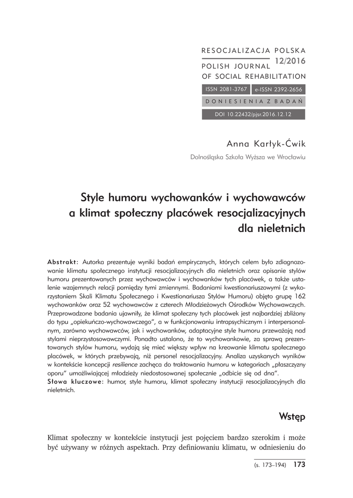 R E S O C J A L I Z A C J A P O L SK A POLISH JOURNAL 12/2016 OF SOCIAL REHABILITATION ISSN 2081-3767 e-ISSN 2392-2656 D O N I E S I E N I A Z B A D A Ń DOI 10.22432/pjsr.2016.12.12 Anna Karłyk- Ćwik Dolnośląska Szkoła Wyższa we Wrocławiu Style humoru wychowanków i wychowawców a klimat społeczny placówek resocjalizacyjnych dla nieletnich Abstrakt: Autorka prezentuje wyniki badań empirycznych, których celem było zdiagnozowanie klimatu społecznego instytucji resocjalizacyjnych dla nieletnich oraz opisanie stylów humoru prezentowanych przez wychowawców i wychowanków tych placówek, a także ustalenie wzajemnych relacji pomiędzy tymi zmiennymi. Badaniami kwestionariuszowymi (z wykorzystaniem Skali Klimatu Społecznego i Kwestionariusza Stylów Humoru) objęto grupę 162 wychowanków oraz 52 wychowawców z czterech Młodzieżowych Ośrodków Wychowawczych. Przeprowadzone badania ujawniły, że klimat społeczny tych placówek jest najbardziej zbliżony do typu „opiekuńczo-wychowawczego”, a w funkcjonowaniu intrapsychicznym i interpersonalnym, zarówno wychowawców, jak i wychowanków, adaptacyjne style humoru przeważają nad stylami nieprzystosowawczymi. Ponadto ustalono, że to wychowankowie, za sprawą prezentowanych stylów humoru, wydają się mieć większy wpływ na kreowanie klimatu społecznego placówek, w których przebywają, niż personel resocjalizacyjny. Analiza uzyskanych wyników w kontekście koncepcji resilience zachęca do traktowania humoru w kategoriach „płaszczyzny oporu” umożliwiającej młodzieży niedostosowanej społecznie „odbicie się od dna”. Słowa kluczowe: humor, style humoru, klimat społeczny instytucji resocjalizacyjnych dla nieletnich. Wstęp Klimat społeczny w kontekście instytucji jest pojęciem bardzo szerokim i może być używany w różnych aspektach. Przy definiowaniu klimatu, w odniesieniu do (s. 173–194) 173 Anna Karłyk-Ćwik instytucji, często używa się takich pojęć, jak: atmosfera, nastrój, zbiór wartości, norm i poglądów, subiektywny obraz zjawisk, osobowość instytucji, zbiór cech organizacji czy też zachowania będące funkcją osobowości i środowiska, wreszcie – „coś”, co tworzy warunki sprzyjające pewnym postawom i wzorcom zachowań (Adrjan 2008, s. 610). Zdaniem wielu autorów (Dudzikowa 1996; Grzybowski 2015; Holmes, Marra 2002, s. 1683–1710; Miller 1996, s. 16–21) tym „czymś”, co tworzy określone warunki i atmosferę panujące w instytucji jest humor, który z jednej strony odzwierciedla rzeczywistość tego miejsca, z drugiej zaś – miejsce to kształtuje i wnosi do niego nową jakość, bowiem „Wspólny śmiech jest czynnikiem poprawy jakości życia i atmosfery w relacjach międzyludzkich w sferze publicznej oraz prywatnej” (Grzybowski 2015, s. 9). Teoretyczne podstawy badań własnych Klimat społeczny instytucji resocjalizacyjnej z perspektywy teorii i wybranych badań Instytucja resocjalizacyjna, traktowana jako środowisko wychowawcze, czyli swoiście powiązany układ warunków i cech zróżnicowanych jakościowo i pełniących funkcję wychowawczo-resocjalizacyjną, wyznaczających przebieg i efekty procesu resocjalizacji, charakteryzowana jest w kategoriach: funkcji, ról społecznych, warunków, typu oddziaływań wychowawczych, ukierunkowania działań oraz warunków strukturalnych funkcjonowania instytucji. Współcześnie przyjmuje się, że największe znaczenie wychowawczo-resocjalizacyjne mają tu czynniki społeczne, relacyjne, które wiążą się z mechanizmami przekazu (transmisji) elementów kulturowych, co koncepcyjnie można opisać w kategoriach klimatu społecznego instytucji (Wysocka 2008, s. 295). We współczesnej pedagogice resocjalizacyjnej przyjmuje się, jako wiodące, teoretyczne ujęcie klimatu społecznego Rudolfa H. Moosa (1975, 1974/1987, 1994/2003), opisujące tę zmienną w terminach psychologicznych. Moos traktuje klimat społeczny jako swoistą osobowość instytucji (osobowość organizacyjna), której proces tworzenia się jest analogiczny do kształtowania się osobowości jednostki, czyli jest on efektem rozwoju danej instytucji, w której wykształca się określony katalog zachowań jej członków, różnie charakteryzowanych, stanowiąc złożone i strukturalnie zróżnicowane zjawisko (wymiary, dymensje, kategorie). Klimat społeczny to złożona sfera mająca własną strukturę, na którą składają się: relacje interpersonalne w obrębie instytucji (Relationship Dimension), rozwój osobisty podopiecznych instytucji (Personal Development Dimension) oraz system organizacyjny instytucji (System Maintenance and System Changedimension) (Moos 1975, s. 19–25). To zjawisko, jest równocześnie procesem, ponieważ wbrew jego względnej stabilności, uczestnicy (wychowankowie, wychowawcy, inni pracowni174 (s. 173–194) Style humoru wychowanków i wychowawców… cy instytucji) znajdują się we wzajemnych kontaktach, które mają wpływ na ich zachowanie. Dla Mossa (1975, s. 81–96) ów klimat to społeczna atmosfera środowiska edukacyjnego/wychowawczego, która nadaje temu środowisku jedność i spójność, pomimo posiadania przez jego uczestników różnych doświadczeń życiowych. Tylko tak rozumiany klimat instytucji edukacyjnej, wychowawczej i resocjalizacyjnej pozwala wszystkim uczestniczyć w jej życiu, rozwijać wzajemne kontakty, współpracować w osiąganiu celów, wspierać się w pokonywaniu trudności, przyjmować odpowiedzialność za teraźniejszość i przyszłość danej placówki (Skuza, Pierścińska-Maruszewska 2014, s. 95). Opierając się na koncepcji Moosa, Lesław Pytka (2008, s. 164) zaproponował następującą, obejmującą istotę i funkcję zjawiska, definicję klimatu społecznego instytucjonalnego środowiska wychowawczego: „zbiór subiektywnie postrzeganych przez wychowanków i wychowawców charakterystycznych cech, sytuacji i zdarzeń, będących względnie trwałymi skut