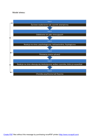 Model stresu: Faza 1 Życiowe wydarzenie lub czynnik zewnętrzny Faza 2 Odebranie ich jako stresujących Faza 3 Reakcja na stres: psychologiczna, behawioralna, fizjologiczna Faza 4 Ponowna ocena sytuacji Faza 5 Reakcje na stres okazują się nieskuteczne wobec czynnika, który je wywołuje Faza 6 Choroba psychiczna lub fizyczna Create PDF files without this message by purchasing novaPDF printer (http://www.novapdf.com)