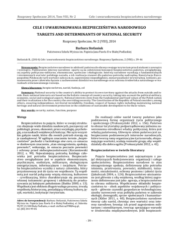 Ï ʹͲͳͶǡǡʹ Ñ CELE I UWARUNKOWANIA BEZPIECZEQSTWA NARODOWEGO TARGETS AND DETERMINANTS OF NATIONAL SECURITY Ï ǡʹȋȌǡʹͲͳͶ Barbara Stefaniuk ÑÏĂǤĂÏÏ ǤǡȋʹͲͳͶȌCele i uwarunkowania bezpieczeÑstwa narodowego. Ï ǡʹȋȌǤ͵ͻǦͶ Streszczenie: Ñä©Ñ¦ ¦Ǥ ¦ Ïä ÑÑǡ¸¦Ǧ Ǧǡ ǡÏ Ǥ¦ ä ǡ Ѹ¸¦Ǥ Ǧ ä ǤǤÏä ǡä ǡä ǡǦ ÏϦ äǦ ×ĂǤ SÏowa kluczowe: Ñǡ×ǡ ǡ Summary: ǯ Ǧ Ǥ ǡ Ǧǡ ǡ Ǥϐ Ǥ ǡ ǡ ǡǡǡ Ǥ Key words: ǡǡ ǡ Wst¸p Ѹ ǡ×Ǧ ǡ ¦ ǡǡǡ ¸ǡ Ǧ ¸ǡ Ñ ¦ Ǥ¦Ǧ ϸǡ× ¦¸ ©Ǥ× ǷbezpieczeÑstwodz Ï Ñsine cura, Ï ǷĂǡǡ ä dzǡ ¦ ǡ Ă ä Ñ ȋ ʹͲͳʹǡ Ǥ ͻͻȌǤ æ ¦ Ă ÏǦ ÑǤ ÑǦ ¸ ǡ ǡ ǡ ǡ ǡ Ǥ Ǧ Ñ Ïǡ × Ă × Ǥ¦×Ǧ ¦×Ϧ ¸¦ ¦ǡ Ȃ ¦ǡ × ¸ Ï Ăä ä ¦ Ǧ ȋÑʹͲͲͲǡǤͳ͵ȌǤ ×ÏÏ ǡϦ צ ¦ǡ¦ ¦Ï¦¸ǡ¸Ǧ ǡä ǡ Ǥ Adres do korespondencji:ǡÑÏ ĂǤĂÏÏǡǤ ͻͷȀͻǡʹͳǦͷͲͲÏǡǦǣϐͻͻͺ̷Ǥǡ Ǥȋͺ͵Ȍ͵ͶͶǦͻͻǦͲͷ × × Ñ ¦ ¸ Ă Ï ȋÑ ʹͲͳʹǡ Ǥ ͳͷȌǤ Ñ ¦Ǧ äÏ ǡ× Ï¦Ñ¦Ǥ Ï× ÑǦ × ǡ צ Ă ǡǦ ¦ä ǡ ¦ǡ×ÏǦ ÏÏ×ÏȋÑʹͲͳʹǡǤͶͳȌǤ BezpieczeÑstwo w äwietle literatury ¸ Ñ ¸ Ǧ ¸© ¦ Ï Ï ÑǤ Ñ Ă ǡ ϐ ǡ ǡ ä ǡ ä ǡ ĂǦ ä ǡĂä ǡ ä Ă ȋ ʹͲͲͶǡǤͳʹͶȌǤ ÑĂǦ Ï×Ϧ¦ǡÏ×Ǧ Ăϐǡ Ñ Ǥ ×Ï Ï Ǧ ÑǦ× Ǧ ǦÏ× ǡ Ñ ǡϐǡÏ Ǧ ȋ ʹͲͳͳǡ Ǥ ͶͲȌǤ Ñ Ï ×ǡ ¦ ä Ǧ ǡ ¦ Ă Ǧ ǡ¦ ¦ ä ¸Ǥ ä ÑǦ Ǧ͵ͻǦ Ï ʹͲͳͶǡǡʹ Ñ Ă¦ ä ¦ ¦ ǦÏ× ÏÑÑǡ ¦ ¦ǡ ¦ ¦ ø¸Ǥ ¦Ïä ¦ÑǦ Ă × ȋ ʹͲͲͶǡ͵ȌǤ Ǧ ¸ Ñ Ï Ǥ¸ ×Ï Ă¦Ǧ ÑǤÏǡÏĂ ǡ Ï ǡ ÏĂ ǡ Ă ǡ Ă Ăǡ × Ǧ ǡ äǡÏĂ ǡǦ ¦¸ǤǦ ǡÑǡÑǡ ¸ǡ ¸ȋʹͲͳͳǡǤͳͳʹǦͳͳͷȌǤ c¦ä Ǧ ǡ ǡ ǡǡǦ Ñ ǡ ǡ ǡ ǡ Ǧ ȋʹͲͳͳͳͲͺǦͳͲͻȌǤ ÑǦ ǡ Ă ǡ ¦ä Ăä Ï×Ǧ ȋʹͲͳͳǡǤͶͷȌǤ × ǡ ÑǦ ¦ ä ǡ ä©ǡ Ïä©ǡ Ă ä ǡ Ï ǡ Ă ¸ǡ ¸ǡ ÏǦ ¦ǡ¸ Ă Ǥ Ñ ǡ × Ñ Ǧ ¦Ǧ ÏÑ × Ñ ȋÏ ¸ʹͲͳ͵ǡǤͶȌǤϐ ÑĂǦ ¦¦ Ï Ï ȋ Ï ʹͲͲͶǡǤʹȌǤ Ï× Ǧ Ï ××ǡǡǡ ¸ǡĂ Ǧ ¦ ¸ää Ï× ȋʹͲͳͳǡǤͺͻȌǤǦ Ñ ǡĂ Ï ×ǡǦ ÑǤ Ǧ ä ×ǡǡĂ ¦×Ă Ǧ ǡ×Ϧ ÑǤ Funkcja paÑstwa w dziedzinie bezpieczeÑstwa Ñ Ñ Ă © ¸¦ǡ ǦǦ ¦ǡ ¦ǡ Ǧ ¦ ¸¦ ȋ ʹͲͲͶǡ Ǥ ͻȌǤ Ǧ ¸ Ñ ¦ Ǧ Ñ ¦ ǡ ¦ǡÏ ÑäǦ Ïä ¸ Ȃ Ïä × Ï Ǥ ÑǦ Ă × Ïä ǡ Ǧ Ǧ Ñ ȋ ʹͲͲͶǡ ǤͻȌǤ Ñ Ï Ñ Ï ǡ Ǧ ǡ Ï ǡ Ñ Ǧ × Ǥ Ǧ ǡǦ ǡ Ǧ ä Ï ȋ ʹͲͳ͵ǡǤͷͳǦͷʹȌǤ ¸ Ñ ¸ Ǧ ÑѦǡǦ × ǡ ÑǡĂ׸Ǧ ȋ ʹͲͲͶǡǤͲȌǤ Cel i istota bezpieczeÑstwa narodowego Rysunek 1. }×Ïǣ Ǥ ǡ Psychologia bezpieczeÑstwaǡ ǡ ʹͲͲͶǡǤʹǤ Ñ Ă ¸ Ăä ¦ ǡ × Ǧ Ϧ ¸ Ăä Ǥ ×Ï ¸ Ñ ¦ ¸ǡ × ǡÏ ä ǡ× ÑǤ Ï ¸ × Ǧ Ă ä × Ǧ Ñ ǡ Ï× ä©ǡ× Ăä ǡ Ï × Ǧ ǡ ä ¦ ǡ Ñ ¸ Ï Ă×ȋʹͲͳͲǡǤʹȌǤ ÑǡÏĂÏ ǡǦ ǡ × ¸ ä ¸ Ï Ǥ Ǧ ×Ñ ǤÑ ¦Ǧ ÏÏ×Ï ÑǦ ¸ǡĂÏǦ ׸ Ǥ ǦͶͲǦ Ï ʹͲͳͶǡǡʹ Ñ Klasyfikacja bezpieczeÑstwa narodowego Ï ÑǦ ¸ Ï ¸¦ × ȋʹͲͳͳǡǤͳͷǦͳȌǣ Ȉ Ǥ Ñ Ǧ ǡ¸ǡǤ Ȉ Ǥ Ñ Ǧ ǡ ǡ ǡ Ï ǡ ǡ ǡ ǡ Ǧ Ǥ Ȉ Ǥ Ñ Ǧ ¦ ¸ Ǧ ǡǤǡǡǦ ǡǡǡ Ȉ Ǥ Ñ Ñǡ Ȉ ǤǦǦ ǡ ǡ Ǧ ä©ǡ Ăǡ ǡ Ñ ǡ Ǧ ÑǤ ¦ ϐ ¦ Ǧ Ǥ ÑǦ æ Ǥ Ñǡ ĂÑǡ Ïä Ǥ Ñ©Ǧ Ï ×Ǥǡ Ǥ Ǧ ¦ ¦ Ñǡ × ǡä×Ǧ ǡ ǡ ÑǤ ÑǤǡ×ĂǦ ǡ Ï ǡ Ǧ Ǥ×ĂÏ ¦ ǡ ¸ä ¸Ă Ǥ ¦ĂϐǤ ×ø¸¦Ǧ ÑȋʹͲͳͳǡǤͳǦʹ͵Ȍǣ Ȉ ¸ǤǦ Ñ ǡ Ñ ¸Ǧ ǡ Ñ ǡ Ñǡ Ȉ ¸ ÑǦ Ȃ ѸǦ Ñ ¸Ǥ Ñ ¸¸¸Ǥ Ñ ǡ ǡ ǡ ϐ ǡ ǡ Ǧ ǡǡ Ǥ Zakres bezpieczeÑstwa narodowego ǡ ¸ Ï Ā×Ï Ï Ǧ ǡ Ñ ×Ă ǡ Ǥ Ăä© Ăä©ǡ ä© ǡ × Ǧ ¦×Ă Ǧ ä Ǥ¸ Ñǡ ¸¦ Ñǡ ©¦ Ǥ Ǧ Ñ ¸ ¸Ǥ Ñ ¸ © Ñä©Ă ÑǡǦ Ï Ǥ Zakres podmiotowy bezpieczeÑstwa narodowego Ñ×ĂĂ Ǧ Ï ǡ× ä Ǧ ǤĂä ǡ×Ă ¦ øǦ ¸ǡ ×Ă ¸ Ñ ¸ǡ×Ï × ȋÑʹͲͳʹǡǤͶͺȌǣ Ȉ ¸ǡ × ä ¸ Ǧ Ñǡ Ȉ ¸ǡ× ÏǦ øǤ ¦ Ï ¦ Ǧ ÑǦ ǡ ǡ ×ǡ ä × ÑǤ Ă Ï ǡ ¸ Ñ ¸ ¸ǡĂÑǡ ¸ǡ Ǧ ǡ ©ĀäĀ×ÏǤǡ ϸ©Ă Ǧ ǤǦ ϐ© ä Ǧ ¦ Ñ ¸Ǥ × ä ǡ Ă Ǧ Ñ ¸ ¦ ǡǡøǤ × Ñ ¸ Ă ¦© ǡ ×Ï ×Ă Ǧ × ÑǤĂ Ñ¸ Ǥ ¦ ¦ Ǧ ä×Ǧ × ÑǦ ѸǤ × Ñ Ă¦ Ǧ ¦ǡĂä ÏÏ Ñ¸Ǧ ¸ǡÏ ͳͳäʹͲͲͳǤĂ© ¸¦ǡǦ Ǥ Ñ×Ǧ ĂĂǡĂĂǦ ¦ǡ ¦ǡצ ¸¸Ǥ ǦͶͳǦ Ï ʹͲͳͶǡǡʹ Ñ Definicja bezpieczeÑstwa narodowego i mi¸dzynarodowego Ñ Ă ÑÑǡø Ï ä ÑǤ Ǧ Ñ Ñǡ ä Ñ ÑǦ Ï ÑøǦ ¸ ȋ ʹͲͲͶǡ Ǥ ͳʹ͵ȌǤ ÑǦ ¸ ä ǡĂÏ ǡÑ × Ñ ¦ ä Ǥ © ǤǤ ¸ ä ǡǤĂ ä ǡ ǡ Ă Ñ ä ¸ǡ Ï ¦ǡ¸ Ă Ǧ ä ȋ ÑǡǤͶȌǤ ä× ä ¸ä© Ǧ ×Ă ä Ǧ ǣ ǡ ä© ¦ǡ ä© ä© Ă Ǥ × Ñ ¦ Ǧ ä ǡ × © Ǧ Ñǡ ¦ Ǧ äǤ × Ă ĂÑĂä Ñǡ Ñ Ǥ Ñǡ ¦ ×ÏĂä© × × ¸Ǧ Ñǡ × ¦ ¸Ï Ïǡ × ȋ ʹͲͳʹǡ Ǥ ͻͻȌǤ × ¦ Ă©Ï ÑǦ Ñ ×ÑǤ ¸ ä ǡ × ¸ä × ÑǤ ǡ ¦ Ñ ¸ä ϸ Ă ¦ Ñǡ ä ä × ¸Ǧ Ǧ Ñ ¦ ×Ï ¸Ǧ ÑǤ Ñ ¸ Ǧ Ă ÑǡĂÏǦ Ñǡ Ă Ǥ ¦Ǧ Ѹ Ǥ ¸Ǥ Ï Ñ¸ ĂÏĂ©¸Ă ׸Ǧ ǡ¸ Ǧ ¦ Ǧ ÑǤ Ï × ¦ ¸×Ï ¦Ǥ Ǧ ×ÏĂ ä Ñ ¸ǡ Ǧ ä ¦ Ñ ÏÑ ĂǦ ÑǤ×ĂǦ Ï ÑǤ Ǧ ϐ Ñ ¸Ǥ ¦ צ ÑϐǦ Ñä ¦ ä Ï×Ï Ǧ 䩸¦ǡ¦Ǧ ÑǦ ȋǡ ʹͲͳʹǡ Ǥ ͳͲͲȌǤ Ă ¦© ׸ ϐ Ñ ¸ǡ × ¸ ĂǦ ¦ǡ ¦ǡ ϐ ǡ ¦ × Ñ ¸ǡ × ¦ Ï Ǧ ĂÑǡ Ï ä© ¸¦ Ï ¸ Ǥ Klasyfikacja przedmiotowa bezpieczeÑstwa Ï Ñ Ă × Ǧ Ñ ¦ Ï ×Ă ĂÑǡ × ¦ Ï × Ñǡ ¦ ×Ă Ïä ǡ× ¦¸ ĂǤ Ï ϐ Ă ǡĂ ÑǦ Ǥ ǡ Ă ϐ ǡ Ïǡ äǡ Ă ¦¸ ÑäǦ × ÑǤʹ ÑǤ Rysunek 2. Ñ }×ÏǣǤǡBezpieczeÑstwo narodowe RPǤǦ ǤǤǡǡʹͲͳͳǡǤͶͲǤ Ñ ¸ ¸Ă × ǡÏ ÑÑ Ăä Ï Ïä ǡ Ă ¸Ǧ ¸ÑȋʹͲͳ͵ǡǤͻͶȌǤ ǦͶʹǦ Ï ʹͲͳͶǡǡʹ Ñ Ñ ä Ǧ ѦĀÑÑǤ¸Ǧ ä©Ï ¦¦ Ñǡ ä© ¸¦ǡ ¦Ǧ ¦ ¦¦ä Ï Ǥ Ǧ Ñ ÑǡøǦ Ǥ ¦ ÑǦ Ăä©Ǧ Ă ¸ ¦×ÑǦ ȋÑʹͲͳʹǡǤͶ͵ȌǤ BezpieczeÑstwo militarne ǡ ǡ ¸¦ × Ǥ Ñ ǡ Ï ǡ ǡ Ǧ Ï Ǥ Ñ ©ä©Ñ Ñ ä ¦ ĂÑ ǡ Ǧ ¦Ǧ ¸ä Ă Ï Ï Ǥ ¦¦ Ñ¦Ă¦¸¸ Ǥ ×Ïǡǡä Ñǡǡ ĂǤ ÑǦ Ă Ï× Ï ǡ ǡ Ă Ñ Ǧ ÏÑ Ǧ