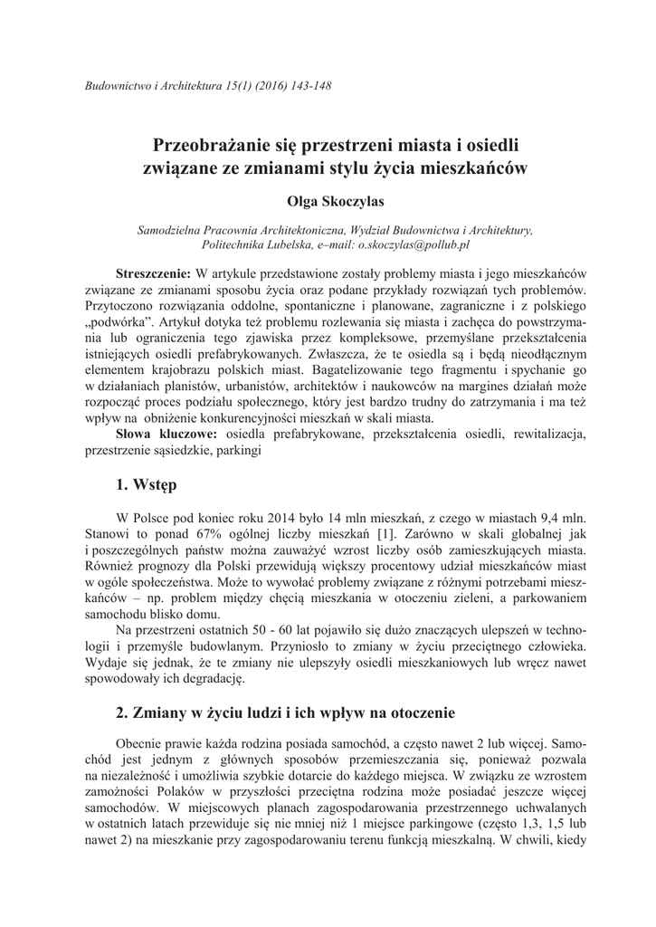 Budownictwo i Architektura 15(1) (2016) 143-148 Przeobrażanie się przestrzeni miasta i osiedli związane ze zmianami stylu życia mieszkańców Olga Skoczylas Samodzielna Pracownia Architektoniczna, Wydział Budownictwa i Architektury, Politechnika Lubelska, e–mail: [email protected] Streszczenie: W artykule przedstawione zostały problemy miasta i jego mieszkańców związane ze zmianami sposobu życia oraz podane przykłady rozwiązań tych problemów. Przytoczono rozwiązania oddolne, spontaniczne i planowane, zagraniczne i z polskiego „podwórka”. Artykuł dotyka też problemu rozlewania się miasta i zachęca do powstrzymania lub ograniczenia tego zjawiska przez kompleksowe, przemyślane przekształcenia istniejących osiedli prefabrykowanych. Zwłaszcza, że te osiedla są i będą nieodłącznym elementem krajobrazu polskich miast. Bagatelizowanie tego fragmentu i spychanie go w działaniach planistów, urbanistów, architektów i naukowców na margines działań może rozpocząć proces podziału społecznego, który jest bardzo trudny do zatrzymania i ma też wpływ na obniżenie konkurencyjności mieszkań w skali miasta. Słowa kluczowe: osiedla prefabrykowane, przekształcenia osiedli, rewitalizacja, przestrzenie sąsiedzkie, parkingi 1. Wstęp W Polsce pod koniec roku 2014 było 14 mln mieszkań, z czego w miastach 9,4 mln. Stanowi to ponad 67% ogólnej liczby mieszkań [1]. Zarówno w skali globalnej jak i poszczególnych państw można zauważyć wzrost liczby osób zamieszkujących miasta. Również prognozy dla Polski przewidują większy procentowy udział mieszkańców miast w ogóle społeczeństwa. Może to wywołać problemy związane z różnymi potrzebami mieszkańców – np. problem między chęcią mieszkania w otoczeniu zieleni, a parkowaniem samochodu blisko domu. Na przestrzeni ostatnich 50 - 60 lat pojawiło się dużo znaczących ulepszeń w technologii i przemyśle budowlanym. Przyniosło to zmiany w życiu przeciętnego człowieka. Wydaje się jednak, że te zmiany nie ulepszyły osiedli mieszkaniowych lub wręcz nawet spowodowały ich degradację. 2. Zmiany w życiu ludzi i ich wpływ na otoczenie Obecnie prawie każda rodzina posiada samochód, a często nawet 2 lub więcej. Samochód jest jednym z głównych sposobów przemieszczania się, ponieważ pozwala na niezależność i umożliwia szybkie dotarcie do każdego miejsca. W związku ze wzrostem zamożności Polaków w przyszłości przeciętna rodzina może posiadać jeszcze więcej samochodów. W miejscowych planach zagospodarowania przestrzennego uchwalanych w ostatnich latach przewiduje się nie mniej niż 1 miejsce parkingowe (często 1,3, 1,5 lub nawet 2) na mieszkanie przy zagospodarowaniu terenu funkcją mieszkalną. W chwili, kiedy 144 Olga Skoczylas budowane były osiedla prefabrykowane przewidywano jeden samochód na 2 rodziny i na taką liczbę pojazdów projektowano miejsca parkingowe na osiedlach. Wzrost ilości samochodów jest widoczny w każdej przestrzeni sąsiedzkiej. Mieszkańcy chcą parkować jak najbliżej domu [2], by jak najszybciej móc dostać się do innego miejsca. Wynikiem tego jest wzrost liczby samochodów w pobliżu bloków, zdegradowana lub zniszczona zieleń, tworzenie nowych dróg wewnątrz osiedla. Kolejna zmiana widoczna jest w warstwie społecznej i zaczęła się już po II wojnie światowej. Obecnie najbardziej pożądane jest mieszkanie rodziców wspólnie z dziećmi, bez innych członków rodziny (np. rodziców któregoś z małżonków czy ich rodzeństwo). Dzięki temu wzrasta zapotrzebowanie na mieszkania, szczególnie w wyposażonych w różne funkcje osiedlach lub dobrze skomunikowanych z innymi częściami miasta. Jednak nadal bardzo często podstawowym czynnikiem warunkującym wybór mieszkania jest jego cena, a w zasadzie zdolność kredytowa ustalona przez bank. Mieszkania położone bliżej centrum miasta są droższe, niż te położone na obrzeżach. Często kupujący decydują się na lokal usytuowany dalej, ale o trochę większym metrażu za tę samą cenę. Średnia cena mieszkania z rynku wtórnego o powierzchni 60 m2 (+/- 5 m2) położonego na osiedlu Skarpa w dzielnicy Czuby w Lublinie wynosi 299 163 zł, czyli 4 986 zł/m2 [7], a cena mieszkania z rynku pierwotnego o podobnym metrażu, ale położonego na obrzeżach Lublina (Węglinek, 63 m2) wynosi 292 000, czyli 4 619 zł/m2 [6], to jest 7,36% powierzchni więcej za taką samą kwotę. Jednak nie tylko samo mieszkanie jest ważne, ale również infrastruktura osiedla, bliskość przedszkola, szkoły, poczty, sklepów, przychodni, kościoła, czy przystanków komunikacji miejskiej. 3. Rozwiązania spontaniczne Wymienione wyżej zmiany rodzą problemy, z którymi architekci, urbaniści i mieszkańcy musza się mierzyć w dzisiejszych czasach. Wzrost liczby samochodów w istniejących osiedlach wymusza znalezienie dodatkowych miejsc parkingowych. Niestety często odbywa się to kosztem terenów rekreacji i odpoczynku, boisk sportowych, placów zabaw dla dzieci lub pieszych ścieżek. Tereny wcześniej użytkowane przez ludzi zostają zajęte przez czterokołowe maszyny, a powierzchnia biologicznie czynna zostaje zabetonowana. Przykłady takich działań są w każdym osiedlu. Nie jest to tylko polski problem. Podczas rewitalizacji osiedla Grotte-Rolland we Francji i dogęszczeniu osiedla prawie zupełnie zniknęły tereny zielone między budynkami na rzecz parkingów. [4] Budowanie obiektów wielorodzinnych przez deweloperów na obrzeżach miast w zasadzie pozbawia mieszkańców tych budynków bliskiego dostępu do publicznych przedszkoli, szkół podstawowych, gimnazjów, liceów, kościołów, domów kultury czy świetlic przez przynajmniej kilka – kilkanaście kolejnych lat. Powoduje to też „rozlewanie się” miasta podczas, gdy zostaje jeszcze dużo niewykorzystanych przestrzeni wewnątrz. Napędza to spiralę wzrostu liczby samochodów, braku miejsc parkingowych, tworz