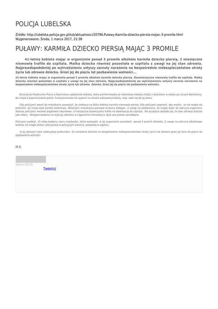 POLICJA LUBELSKA Źródło: http://lubelska.policja.gov.pl/lub/aktualnosci/20796,Pulawy-Karmila-dziecko-piersia-majac-3-promile.html Wygenerowano: Środa, 1 marca 2017, 21:38 PUŁAWY: KARMIŁA DZIECKO PIERSIĄ MAJĄC 3 PROMILE 41-letnia kobieta mając w organizmie ponad 3 promile alkoholu karmiła dziecko piersią. 2 miesięczne niemowlę trafiło do szpitala. Matka dziecka również pozostała w szpitalu z uwagi na jej stan zdrowia. Najprawdopodobniej po wytrzeźwieniu usłyszy zarzuty narażenia na bezpośrednie niebezpieczeństwo utraty życia lub zdrowia dziecka. Grozi jej do pięciu lat pozbawienia wolności... 41-letnia kobieta mając w organizmie ponad 3 promile alkoholu karmiła dziecko piersią. Dwumiesięczne niemowlę trafiło do szpitala. Matka dziecka również pozostała w szpitalu z uwagi na jej stan zdrowia. Najprawdopodobniej po wytrzeźwieniu usłyszy zarzuty narażenia na bezpośrednie niebezpieczeństwo utraty życia lub zdrowia dziecka. Grozi jej do pięciu lat pozbawienia wolności. Wczoraj do Posterunku Policji w Kazimierzu zadzwoniła kobieta, która poinformowała że nietrzeźwa kobieta chodzi z dzieckiem w wózku po ulicach Bochotnicy. Na miejsce pojechał patrol policji. Funkcjonariusze nie ujawnili na ulicach wskazanej kobiety, więc udali się do jej domu. Gdy policjanci weszli do mieszkania zauważyli, że siedząca na łóżku kobieta karmiła niemowlę piersią. Gdy policjanci poprosili, aby wstała, ta nie mogła się podnieść. Jej mowa była bardzo bełkotliwa. Wewnątrz mieszkania panował straszny bałagan. Z uwagi na podejrzenie, że mogło dojść do zatrucia organizmu dziecka policjanci wezwali pogotowie ratunkowe. 2-miesięczna dziewczynka trafiła na obserwację do szpitala. Na szczęście okazało się, że stan zdrowia dziecka jako dobry. Wstępne badania nie wykryły alkoholu w organizmie niemowlęcia. Było ono jednak zaniedbane. Policjanci poddali 41-latkę badaniu stanu trzeźwości, które wykazało w jej organizmie zawartość ponad 3 promili alkoholu. Z uwagi na zatrucie alkoholowe kobieta nie mogła zostać zatrzymana w policyjnym areszcie, pozostała w szpitalu. O jej dalszym losie zadecyduje prokurator. Za narażenie dziecka na bezpośrednie niebezpieczeństwo utraty życia lub zdrowia grozi jej kara do pięciu lat pozbawienia wolności. M.K. Ocena: 0/5 (0) Tweetnij