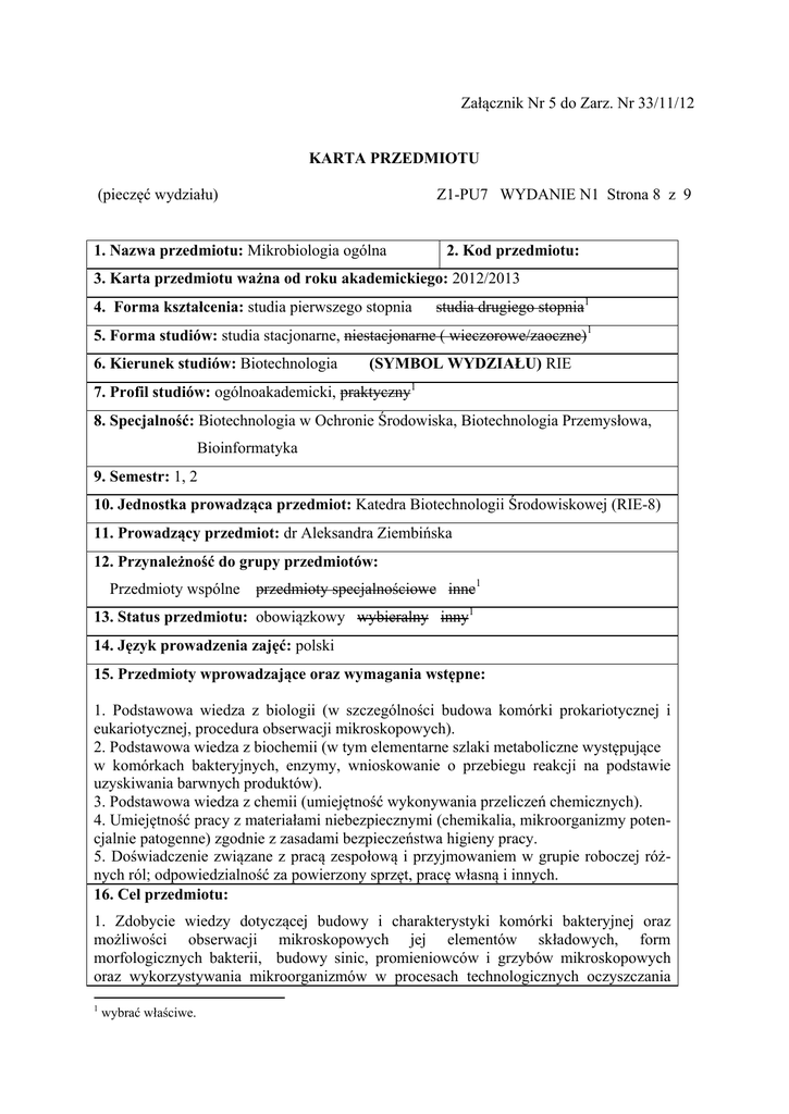 Załącznik Nr 5 do Zarz. Nr 33/11/12 KARTA PRZEDMIOTU (pieczęć wydziału) Z1-PU7 WYDANIE N1 Strona 8 z 9 1. Nazwa przedmiotu: Mikrobiologia ogólna 2. Kod przedmiotu: 3. Karta przedmiotu ważna od roku akademickiego: 2012/2013 4. Forma kształcenia: studia pierwszego stopnia studia drugiego stopnia1 5. Forma studiów: studia stacjonarne, niestacjonarne ( wieczorowe/zaoczne)1 6. Kierunek studiów: Biotechnologia (SYMBOL WYDZIAŁU) RIE 7. Profil studiów: ogólnoakademicki, praktyczny1 8. Specjalność: Biotechnologia w Ochronie Środowiska, Biotechnologia Przemysłowa, Bioinformatyka 9. Semestr: 1, 2 10. Jednostka prowadząca przedmiot: Katedra Biotechnologii Środowiskowej (RIE-8) 11. Prowadzący przedmiot: dr Aleksandra Ziembińska 12. Przynależność do grupy przedmiotów: Przedmioty wspólne przedmioty specjalnościowe inne1 13. Status przedmiotu: obowiązkowy wybieralny inny1 14. Język prowadzenia zajęć: polski 15. Przedmioty wprowadzające oraz wymagania wstępne: 1. Podstawowa wiedza z biologii (w szczególności budowa komórki prokariotycznej i eukariotycznej, procedura obserwacji mikroskopowych). 2. Podstawowa wiedza z biochemii (w tym elementarne szlaki metaboliczne występujące w komórkach bakteryjnych, enzymy, wnioskowanie o przebiegu reakcji na podstawie uzyskiwania barwnych produktów). 3. Podstawowa wiedza z chemii (umiejętność wykonywania przeliczeń chemicznych). 4. Umiejętność pracy z materiałami niebezpiecznymi (chemikalia, mikroorganizmy potencjalnie patogenne) zgodnie z zasadami bezpieczeństwa higieny pracy. 5. Doświadczenie związane z pracą zespołową i przyjmowaniem w grupie roboczej różnych ról; odpowiedzialność za powierzony sprzęt, pracę własną i innych. 16. Cel przedmiotu: 1. Zdobycie wiedzy dotyczącej budowy i charakterystyki komórki bakteryjnej oraz możliwości obserwacji mikroskopowych jej elementów składowych, form morfologicznych bakterii, budowy sinic, promieniowców i grzybów mikroskopowych oraz wykorzystywania mikroorganizmów w procesach technologicznych oczyszczania 1 wybrać właściwe. ścieków (charakterystyka osadu czynnego) 2. Poznanie charakterystyki pracy w laboratorium mikrobiologicznym, metod sterylizacji i dezynfekcji, typów podłoży bakteriologicznych, podstawowych technik posiewów mikroorganizmów, metod oznaczania liczebności drobnoustrojów w środowisku wodnym, glebowym i w powietrzu, mechanizmów działania bakteriobójczego metali ciężkich, detergentów, promieniowania UV, antybiotyków i fitoncydów. 17. Efekty kształcenia:2 Nr Opis efektu kształcenia 1. Umiejętność wykonania różnych typów posiewów bakteriologicznych 2. Umiejętność przeprowadzenia barwień mikroorganizmów oraz obserwacji preparatów mikroskopowych przyżyciowych i barwionych 3. Umiejętność rozróżnienia podstawowych kształtów morfologicznych bakterii, sinic, grzybów mikroskopowych, promieniowców i organizmów osadu czynnego Metoda sprawdzenia efektu kształcenia Raport (na podstawie eksperymentu) Obserwacja prowadzącego Kolokwium Egzamin Raport (na podstawie eksperymentu) Obserwacja prowadzącego Kolokwium Egzamin Raport (na podstawie eksperymentu) Kolokwium Egzamin Dyskusja w trakcie wycieczki dydaktycznej Zdolność przeprowadzenia procedury identyfikacji bakterii metodami mikroskopowymi i makroskopowymi Kolokwium Egzamin 5. Zdolność wyjaśnienia mechanizmów działania substancji bakteriobójczych (metali ciężkich, UV, antybiotyków, fitoncydów) Raport (na podstawie eksperymentu) Kolokwium Egzamin 6. Umiejętność określenia liczebności mikroorganizmów w środowisku wodnym, glebowym i powietrzu 4. 7. 2 Doświadczenie związane z pracą zespołową i przyjmowaniem w grupie roboczej różnych ról, podziałem pracy w swojej sekcji w trakcie należy wskazać ok. 5 – 8 efektów kształcenia. Raport (na podstawie eksperymentu) Kolokwium Egzamin Eksperymenty – obserwacja prowadzącego Forma prowadzenia zajęć Odniesienie do efektów dla kierunku studiów Wykład Laboratorium K_W06-W09 K_U17 Wykład Laboratorium K_W09 K_W15 K_KW17 Wykład Laboratorium K_U01 K_U14 K_U04 K_W15 Wykład Laboratorium K_W13 K_U01 K_U17 K_U19 Wykład Laboratorium K_W17 K_U01 K_U09-12 K_U14 K_U17 K_U19 Wykład Laboratorium K_W15 K_U01 K_U17 K_U19 Laboratorium K_K02-04 eksperymentów i sporządzania raportów, wyznaczaniem działań priorytetowych, dotrzymywaniem ustalonych terminów Świadomość nieustannego rozwoju mikrobiologii, udoskonalania technik i metod stosowanych w izolacji i identyfikacji drobnoustrojów, rozumienie potrzeby samokształcenia się i rozszerzania swojej wiedzy i umiejętności poprzez uczestnictwo w różnych kursach, szkoleniach 8. Raport Egzamin Wykład K_U04 K_K01 K_K05-K06 18. Formy zajęć dydaktycznych i ich wymiar (liczba godzin) W. 30 Ćw. L. 30 P. Sem. 19. Treści kształcenia: (oddzielnie dla każdej z form zajęć dydaktycznych W ./Ćw./L./P./Sem.) Wykład: Budowa komórki Prokaryota; porównanie Pro- i Eukaryota Budowa ściany bakterii gramdodatnich i gramujemnych; mechanizm barwienia metoda Grama Podstawy mikroskopowania, typy barwień, preparaty trwałe i przyżyciowe Morfologia bakterii Charakterystyka Archaea, promieniowców, grzybów mikroskopowych, sinic, osadu czynnego Charakterystyka wirusów, cykl lityczny i lizogenny Wybrane przemiany metaboliczne bakterii: nitryfikacja, denitryfikacja, obieg fosforu i siarki, rozkład materii bezazotowej, fermentacja a oddychanie Horyzontalny transfer genów (koniugacja, transformacja, transdukcja) Wpływ różnych czynników fizycznych i chemicznych na bakterie (temperatura, UV, metale ciężkie, antybiotyki, fitoncydy, detergenty) Podstawowe pojęcia laboratoryjne (sterylizacja, pasteryzacja, tyndalizacja, konserwacja) metody posiewów, typy podłoży, szereg rozcieńczeń Oznaczanie liczebność mikroorganizmów w różnych środowiskach Cechy uniwersalnego wskaźnika bakteryjnego w analizie sanitarnej, pojęcie miana, indeksu (NPL) 