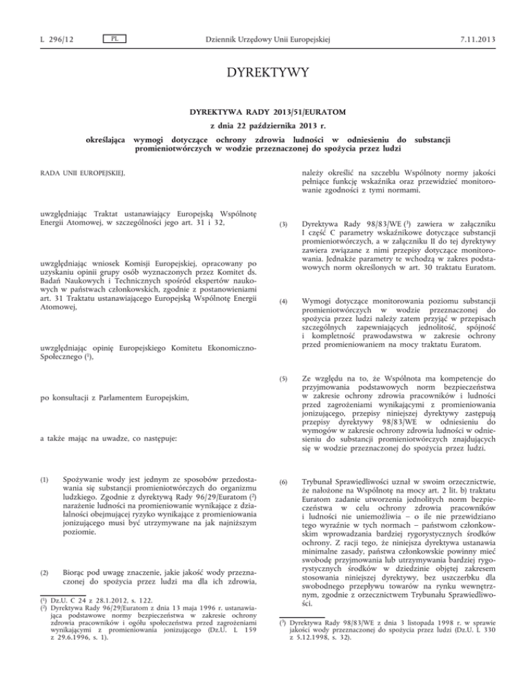 L 296/12 PL Dziennik Urzędowy Unii Europejskiej 7.11.2013 DYREKTYWY DYREKTYWA RADY 2013/51/EURATOM z dnia 22 października 2013 r. określająca wymogi dotyczące ochrony zdrowia ludności w odniesieniu do substancji promieniotwórczych w wodzie przeznaczonej do spożycia przez ludzi należy określić na szczeblu Wspólnoty normy jakości pełniące funkcję wskaźnika oraz przewidzieć monitoro wanie zgodności z tymi normami. RADA UNII EUROPEJSKIEJ, uwzględniając Traktat ustanawiający Europejską Wspólnotę Energii Atomowej, w szczególności jego art. 31 i 32, uwzględniając wniosek Komisji Europejskiej, opracowany po uzyskaniu opinii grupy osób wyznaczonych przez Komitet ds. Badań Naukowych i Technicznych spośród ekspertów nauko wych w państwach członkowskich, zgodnie z postanowieniami art. 31 Traktatu ustanawiającego Europejską Wspólnotę Energii Atomowej, (3) Dyrektywa Rady 98/83/WE (3) zawiera w załączniku I część C parametry wskaźnikowe dotyczące substancji promieniotwórczych, a w załączniku II do tej dyrektywy zawiera związane z nimi przepisy dotyczące monitoro wania. Jednakże parametry te wchodzą w zakres podsta wowych norm określonych w art. 30 traktatu Euratom. (4) Wymogi dotyczące monitorowania poziomu substancji promieniotwórczych w wodzie przeznaczonej do spożycia przez ludzi należy zatem przyjąć w przepisach szczególnych zapewniających jednolitość, spójność i kompletność prawodawstwa w zakresie ochrony przed promieniowaniem na mocy traktatu Euratom. (5) Ze względu na to, że Wspólnota ma kompetencje do przyjmowania podstawowych norm bezpieczeństwa w zakresie ochrony zdrowia pracowników i ludności przed zagrożeniami wynikającymi z promieniowania jonizującego, przepisy niniejszej dyrektywy zastępują przepisy dyrektywy 98/83/WE w odniesieniu do wymogów w zakresie ochrony zdrowia ludności w odnie sieniu do substancji promieniotwórczych znajdujących się w wodzie przeznaczonej do spożycia przez ludzi. (6) Trybunał Sprawiedliwości uznał w swoim orzecznictwie, że nałożone na Wspólnotę na mocy art. 2 lit. b) traktatu Euratom zadanie utworzenia jednolitych norm bezpie czeństwa w celu ochrony zdrowia pracowników i ludności nie uniemożliwia – o ile nie przewidziano tego wyraźnie w tych normach – państwom członkow skim wprowadzania bardziej rygorystycznych środków ochrony. Z racji tego, że niniejsza dyrektywa ustanawia minimalne zasady, państwa członkowskie powinny mieć swobodę przyjmowania lub utrzymywania bardziej rygo rystycznych środków w dziedzinie objętej zakresem stosowania niniejszej dyrektywy, bez uszczerbku dla swobodnego przepływu towarów na rynku wewnętrz nym, zgodnie z orzecznictwem Trybunału Sprawiedliwo ści. uwzględniając opinię Europejskiego Komitetu EkonomicznoSpołecznego (1), po konsultacji z Parlamentem Europejskim, a także mając na uwadze, co następuje: (1) Spożywanie wody jest jednym ze sposobów przedosta wania się substancji promieniotwórczych do organizmu ludzkiego. Zgodnie z dyrektywą Rady 96/29/Euratom (2) narażenie ludności na promieniowanie wynikające z dzia łalności obejmującej ryzyko wynikające z promieniowania jonizującego musi być utrzymywane na jak najniższym poziomie. (2) Biorąc pod uwagę znaczenie, jakie jakość wody przezna czonej do spożycia przez ludzi ma dla ich zdrowia, (1) Dz.U. C 24 z 28.1.2012, s. 122. (2) Dyrektywa Rady 96/29/Euratom z dnia 13 maja 1996 r. ustanawia jąca podstawowe normy bezpieczeństwa w zakresie ochrony zdrowia pracowników i ogółu społeczeństwa przed zagrożeniami wynikającymi z promieniowania jonizującego (Dz.U. L 159 z 29.6.1996, s. 1). (3) Dyrektywa Rady 98/83/WE z dnia 3 listopada 1998 r. w sprawie jakości wody przeznaczonej do spożycia przez ludzi (Dz.U. L 330 z 5.12.1998, s. 32). 7.11.2013 (7) (8) (9) (10) PL Dziennik Urzędowy Unii Europejskiej Wartości parametryczne nie powinny być traktowane jako wartości graniczne. W przypadku gdy monitoro wanie wody przeznaczonej do spożycia przez ludzi wykaże niezgodność z wartością parametryczną, zainte resowane państwo członkowskie powinno rozważyć, czy stanowi to zagrożenie dla zdrowia ludzkiego wymagające działania oraz – w razie konieczności – podjąć działanie naprawcze służące poprawie jakości wody do poziomu zgodnego z wymogami dotyczącymi ochrony zdrowia ludzi przed promieniowaniem. Monitorowanie wód przeznaczonych do spożycia przez ludzi, umieszczanych w butelkach lub pojemnikach prze znaczonych do sprzedaży, innych niż naturalne wody mineralne – w celu sprawdzania czy poziomy substancji promieniotwórczych są zgodne z wartościami paramet rycznymi określonymi w niniejszej dyrektywie – powinno być prowadzone zgodnie z zasadami analizy zagrożeń i krytycznych punktów kontroli (HACCP) w myśl wymogów rozporządzenia (WE) nr 852/2004 Parlamentu Europejskiego i Rady (1) oraz bez uszczerbku dla zasad urzędowych kontroli ustanowionych w rozporządzeniu (WE) nr 882/2004 Parlamentu Euro pejskiego i Rady (2). Ludność należy informować w należyty i odpowiedni sposób o jakości wody przeznaczonej do spożycia przez ludzi. Z zakresu niniejszej dyrektywy należy wyłączyć naturalne wody mineralne i wody stanowiące produkty lecznicze, ponieważ przepisy szczególne dotyczące tego typu wód ustanowiono dyrektywą Parlamentu Europejskiego i Rady 2009/54/WE (3) oraz dyrektywą 2001/83/WE Parla mentu Europejskiego i Rady (4). (11) Każde państwo członkowskie powinno ustanowić programy monitorowania w celu sprawdzenia, czy woda przeznaczona do spożycia przez ludzi spełnia wymogi niniejszej dyrektywy. (12) Metody stosowane do analizy jakości wody przezna czonej do spożycia przez ludzi powinny zapewniać wiarygodność i porównywalność otrzymywanych wyni ków. L 296/13 (13) Zważywszy na dużą różnorodność geograficzną natural nego występowania radonu, Komisja przyjęła zalecenie 2001/928