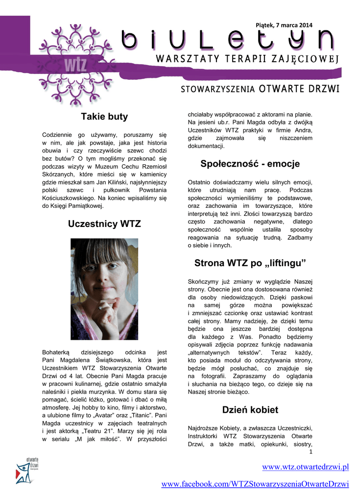 Piątek, 7 marca 2014 Takie buty Codziennie go używamy, poruszamy się w nim, ale jak powstaje, jaka jest historia obuwia i czy rzeczywiście szewc chodzi bez butów? O tym mogliśmy przekonać się podczas wizyty w Muzeum Cechu Rzemiosł Skórzanych, które mieści się w kamienicy gdzie mieszkał sam Jan Kiliński, najsłynniejszy polski szewc i pułkownik Powstania Kościuszkowskiego. Na koniec wpisaliśmy się do Księgi Pamiątkowej. Uczestnicy WTZ chciałaby współpracować z aktorami na planie. Na jesieni ub.r. Pani Magda odbyła z dwójką Uczestników WTZ praktyki w firmie Andra, gdzie zajmowała się niszczeniem dokumentacji. Społeczność - emocje Ostatnio doświadczamy wielu silnych emocji, które utrudniają nam pracę. Podczas społeczności wymieniliśmy te podstawowe, oraz zachowania im towarzyszące, które interpretują też inni. Złości towarzyszą bardzo często zachowania negatywne, dlatego społeczność wspólnie ustaliła sposoby reagowania na sytuację trudną. Zadbamy o siebie i innych. Strona WTZ po „liftingu” Bohaterką dzisiejszego odcinka jest Pani Magdalena Świątkowska, która jest Uczestnikiem WTZ Stowarzyszenia Otwarte Drzwi od 4 lat. Obecnie Pani Magda pracuje w pracowni kulinarnej, gdzie ostatnio smażyła naleśniki i piekła murzynka. W domu stara się pomagać, ścielić łóżko, gotować i dbać o miłą atmosferę. Jej hobby to kino, filmy i aktorstwo, a ulubione filmy to „Avatar” oraz „Titanic”. Pani Magda uczestnicy w zajęciach teatralnych i jest aktorką „Teatru 21”. Marzy się jej rola w serialu „M jak miłość”. W przyszłości Skończymy już zmiany w wyglądzie Naszej strony. Obecnie jest ona dostosowana również dla osoby niedowidzących. Dzięki paskowi na samej górze można powiększać i zmniejszać czcionkę oraz ustawiać kontrast całej strony. Mamy nadzieję, że dzięki temu będzie ona jeszcze bardziej dostępna dla każdego z Was. Ponadto będziemy opisywali zdjęcia poprzez funkcję nadawania „alternatywnych tekstów”. Teraz każdy, kto posiada moduł do odczytywania strony, będzie mógł posłuchać, co znajduje się na fotografii. Zapraszamy do oglądania i słuchania na bieżąco tego, co dzieje się na Naszej stronie bieżąco. Dzień kobiet Najdroższe Kobiety, a zwłaszcza Uczestniczki, Instruktorki WTZ Stowarzyszenia Otwarte Drzwi, a także matki, opiekunki, siostry, 1 www.wtz.otwartedrzwi.pl www.facebook.com/WTZStowarzyszeniaOtwarteDrzwi Piątek, 7 marca 2014 przyjaciółki Uczestników!!! W dniu Waszego święta męska część WTZ pragnie Wam złożyć najlepsze życzenia. Dzięki Wam Nasze życie jest pełniejsze, piękniejsze i niezwykle zaskakujące. W związku z tym, że jutro (w sobotę) przypada 8 marca, szykujemy niespodziankę, o której dowiecie się w następnym biuletynie. Dlatego zachęcamy do śledzenia Naszej strony i fanpage. Zasady, Prawa i Obowiązki Zasady i normy, którymi kierujemy się na co dzień w ramach WTZ Stowarzyszenia Otwarte Drzwi spisaliśmy w formie 3 odrębnych dokumentów: „Zasady współżycia i pracy w Zespole”, „Prawa Uczestnika” oraz „Obowiązki Uczestnika”. W każdej chwili są one dostępne dla każdego we wszystkich pracowniach. „Zasady współżycia i pracy w Zespole” (przyjęte na Sesji Społeczności w dn. 5.09.2012): 2) Okazujemy sobie przyjaźń i sympatię, pamiętamy o ważnych dla nas uroczystościach. zachowania indywidualnie oraz w grupie na miejscu wypadku samochodowego. Każdy mógł wiele się nauczyć i przekonać na własnej skórze jak się zachować. Dziękujemy Panu Tomkowi z Centrum Szkoleń i Ratownictwa sosmedyk.pl za zajęcia i mamy nadzieję do zobaczenia wkrótce! Motto na dziś „Życie widziane z bliska jest tragedią, widziane z daleka - komedią.” Codziennie możecie znaleźć nowe motto na Naszej stronie. KONTAKT: Warsztaty Terapii Zajęciowej Stowarzyszenia Otwarte Drzwi ul. Równa 10/3 03-418 Warszawa tel: (22) 670-21-23 tel/fax: (22) 619-07-04 [email protected] www.wtz.otwartedrzwi.pl www.facebook.com/WTZStowarzyszeniaOtwar teDrzwi Pierwsza pomoc Życie lub zaskakiwać, dlatego warto być przygotowanym na losowe wypadki. Tydzień temu grupa m.in. instruktorów z różnych ośrodków Stowarzyszenia Otwarte Drzwi, w tym Kierownik WTZ Stowarzyszenia Otwarte Drzwi Maciej Grudzień oraz Instruktor Pracowni Komputerowej Bartosz Król, odbyli szkolenie z zakresu udzielania pierwszej pomocy. Oprócz pomocy osobom nieprzytomnym i właściwego postępowania w różnych sytuacjach bezpośredniego zagrożenia życia mieliśmy symulację 2 www.wtz.otwartedrzwi.pl www.facebook.com/WTZStowarzyszeniaOtwarteDrzwi