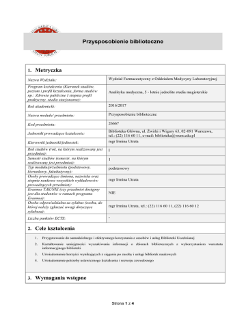 Przysposobienie biblioteczne 1. Metryczka Nazwa Wydziału: Wydział Farmaceutyczny z Oddziałem Medycyny Laboratoryjnej Program kształcenia (Kierunek studiów, poziom i profil kształcenia, forma studiów np.: Zdrowie publiczne I stopnia profil praktyczny, studia stacjonarne): Analityka medyczna, 5 - letnie jednolite studia magisterskie Rok akademicki: 2016/2017 Nazwa modułu/ przedmiotu: Przysposobienie biblioteczne Kod przedmiotu: 26667 Jednostki prowadzące kształcenie: Biblioteka Główna, ul. Żwirki i Wigury 63, 02-091 Warszawa, tel.: (22) 116 60 11, e-mail: [email protected] Kierownik jednostki/jednostek: mgr Irmina Utrata Rok studiów (rok, na którym realizowany jest przedmiot): Semestr studiów (semestr, na którym realizowany jest przedmiot): Typ modułu/przedmiotu (podstawowy, kierunkowy, fakultatywny): Osoby prowadzące (imiona, nazwiska oraz stopnie naukowe wszystkich wykładowców prowadzących przedmiot): Erasmus TAK/NIE (czy przedmiot dostępny jest dla studentów w ramach programu Erasmus): Osoba odpowiedzialna za sylabus (osoba, do której należy zgłaszać uwagi dotyczące sylabusa): I Liczba punktów ECTS: - 1 podstawowy mgr Irmina Utrata NIE mgr Irmina Utrata, tel.: (22) 116 60 11, (22) 116 60 12 2. Cele kształcenia 1. Przygotowanie do samodzielnego i efektywnego korzystania z zasobów i usług Biblioteki Uczelnianej 2. Kształtowanie umiejętności wyszukiwania informacji o zbiorach bibliotecznych z wykorzystaniem warsztatu informacyjnego biblioteki 3. Uświadomienie korzyści wynikających z sięgania po zasoby i usługi bibliotek naukowych 4. Uświadomienie potrzeby ustawicznego kształcenia i rozwoju zawodowego 3. Wymagania wstępne Strona 1 z 4 1. Podstawy obsługi komputera 4. Przedmiotowe efekty kształcenia Lista efektów kształcenia Symbol przedmiotowego efektu kształcenia W1 W2 W3 W4 W5 U1 U2 U3 U4 K1 K2 K3 Treść przedmiotowego efektu kształcenia Zna organizację i zasady funkcjonowania systemu biblioteczno-informacyjnego Uczelni Zna tradycyjne i elektroniczne źródła informacji dostępne w bibliotece Zna metodykę przeszukiwania katalogu online oraz katalogów tradycyjnych biblioteki Zna stronę www biblioteki - główne źródło informacji o zasobach, usługach i zasadach korzystania z oferty biblioteki Zna wybrane biblioteki naukowe w Warszawie, z uwzględnieniem bibliotek o profilu medycznym Określa własne potrzeby informacyjne i zna możliwości ich zaspakajania Korzysta z zasobów bibliotecznych i usług oferowanych przez biblioteki systemu bibliotecznoinformacyjnego WUM Posługuje się warsztatem informacyjnym biblioteki, wyszukuje literaturę na określony temat Korzysta z zasobów bibliotek naukowych Warszawy Wykazuje samodzielność w poszukiwaniu źródeł wiedzy Jest świadomy znaczenia systematycznej aktualizacji wiedzy z wykorzystaniem specjalistycznych źródeł informacji medycznej Interesuje się nowościami biblioteki w zakresie zasobów, narzędzi informacyjno-wyszukiwawczych, usług Odniesienie do efektu kierunkowego (numer) - - D.U15 D.U15 D.U15 D.U15 - - - 5. Formy prowadzonych zajęć Forma Liczba godzin Liczba grup Minimalna liczba osób w grupie Wykład - - - Seminarium - - - Ćwiczenia - - - e-learning TAK - - 6. Tematy zajęć i treści kształcenia 1. 2. 3. 4. 5. Organizacja i struktura systemu biblioteczno-informacyjnego Uczelni – W1, U2, K1, K3 Wybrane biblioteki naukowe w Warszawie – W5, U4, K3 Charakterystyka zbiorów Biblioteki Głównej i sieci biblioteczno-informacyjnej WUM – W2, U1, U2, K1, K2 Podstawowe rodzaje gromadzonych dokumentów – W2, U1, U2, K1, K2 Jednostki usługowe Biblioteki – W4, U1, U2, U3, K1, K2, K3 Strona 2 z 4 6. 7. Charakterystyka i zasady korzystania z katalogów bibliotecznych – W3, U1, U3, K1, K2, K3 Strona www biblioteki – serwis informacyjny do prezentacji zasobów i usług – W4, U1, U2, U3, K1, K2, K3 7. Sposoby weryfikacji efektów kształcenia Symbol przedmiotowego efektu kształcenia Symbole form prowadzonych zajęć Sposoby weryfikacji efektu kształcenia W1 e-learning Test online W2 e-learning Test online W3 e-learning Test online W4 e-learning Test online W5 e-learning Test online U1 e-learning Test online U2 e-learning Test online U3 e-learning Test online U4 e-learning Test online K1 e-learning Test online K2 e-learning Test online K3 e-learning Test online Kryterium zaliczenia Uzyskanie 67 % prawidłowych odpowiedzi na 30 pytań testu 8. Kryteria oceniania Forma zaliczenia przedmiotu: uzyskanie 67% prawidłowych odpowiedzi na 30 pytań testu ocena kryteria 2,0 (ndst) 0% - 66% 3,0 (dost.) 67% - 76% 3,5 (ddb) 77% - 82% 4,0 (db) 83% - 89% 4,5 (pdb) 90% - 96% 5,0 (bdb) 97% - 100% 9. Literatura Literatura obowiązkowa: 1. Materiały zamieszczone w szkoleniu z Przysposobienia bibliotecznego, dostępne ze strony www Biblioteki Głównej WUM Strona 3 z 4 10. Kalkulacja punktów ECTS Forma aktywności Liczba godzin Liczba punktów ECTS Godziny kontaktowe z nauczycielem akademickim: Wykład - - Seminarium 2 - Ćwiczenia - - Forma aktywności Liczba godzin Liczba punktów ECTS Samodzielna praca studenta (przykładowe formy pracy): Przygotowanie studenta do seminarium - - Przygotowanie studenta do prowadzenia zajęć - - Przygotowanie do zaliczeń - - Inne (jakie?) - - Razem - - 11. Informacje dodatkowe (Np. informacje o kole naukowym działającym przy jednostce, informacje o dojeździe na zajęcia itp.) Podpis Kierownika Jednostki Podpis Osoby odpowiedzialnej za sylabus Podpisy Osób prowadzących zajęcia Strona 4 z 4
