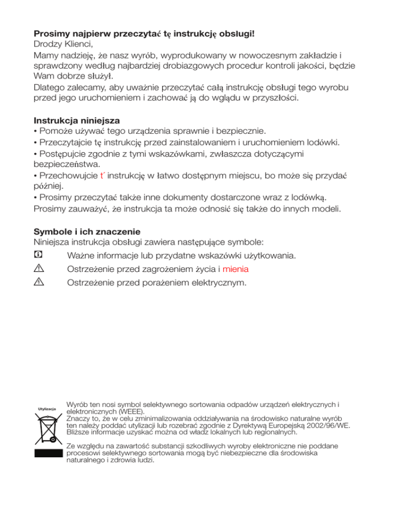Prosimy najpierw przeczytać tę instrukcję obsługi! Drodzy Klienci, Mamy nadzieję, że nasz wyrób, wyprodukowany w nowoczesnym zakładzie i sprawdzony według najbardziej drobiazgowych procedur kontroli jakości, będzie Wam dobrze służył. Dlatego zalecamy, aby uważnie przeczytać całą instrukcję obsługi tego wyrobu przed jego uruchomieniem i zachować ją do wglądu w przyszłości. Instrukcja niniejsza • Pomoże używać tego urządzenia sprawnie i bezpiecznie. • Przeczytajcie tę instrukcję przed zainstalowaniem i uruchomieniem lodówki. • Postępujcie zgodnie z tymi wskazówkami, zwłaszcza dotyczącymi bezpieczeństwa. • Przechowujcie t´ instrukcję w łatwo dostępnym miejscu, bo może się przydać później. • Prosimy przeczytać także inne dokumenty dostarczone wraz z lodówką. Prosimy zauważyć, że instrukcja ta może odnosić się także do innych modeli. Symbole i ich znaczenie Niniejsza instrukcja obsługi zawiera następujące symbole: C A B Utylizacja Ważne informacje lub przydatne wskazówki użytkowania. Ostrzeżenie przed zagrożeniem życia i mienia Ostrzeżenie przed porażeniem elektrycznym. Wyrób ten nosi symbol selektywnego sortowania odpadów urządzeń elektrycznych i elektronicznych (WEEE). Znaczy to, że w celu zminimalizowania oddziaływania na środowisko naturalne wyrób ten należy poddać utylizacji lub rozebrać zgodnie z Dyrektywą Europejską 2002/96/WE. Bliższe informacje uzyskać można od władz lokalnych lub regionalnych. Ze względu na zawartość substancji szkodliwych wyroby elektroniczne nie poddane procesowi selektywnego sortowania mogą być niebezpieczne dla środowiska naturalnego i zdrowia ludzi. 1 Oto Wasza chłodziarka 3 2 Ważne ostrzeżenia dot. bezpieczeństwa 4 Zamierzone przeznaczenie................. 4 Ogólne zasady bezpieczeństwa.......... 4 Bezpieczeństwo dzieci....................... 7 Ostrzeżenie HCA................................ 7 Co robić, aby oszczędzać energię...... 7 3 Instalacja 8 W razie potrzeby ponownego transportu chłodziarki należy przestrzegać następujących wskazówek:....................................... 8 Przed uruchomieniem chłodziarki....... 8 Usuwanie opakowania........................ 9 Utylizacja starej chłodziarki................. 9 Ustawienie i instalacja......................... 9 Regulacja nóżek............................... 10 2 4 Przygotowanie 11 Przekładanie drzwi............................ 12 5 Użytkowanie chłodziarki13 Nastawianie temperatury roboczej.... 13 Lampki wskaźników......................... 13 Zamrażanie....................................... 14 Jak robić lód?................................... 16 6 Konserwacja i czyszczenie 17 Zabezpieczenia powierzchni plastykowych .................................. 17 7 Zalecane rozwiązania problemów PL 18 1 Oto Wasza chłodziarka 1 3 1 4 2 1 MAX. 3 4 2 1 MAX. 2 2 2 2 3 3 4 4 4 4 4 4 4 4 4 5 1 3 1 4 2 1 MAX. 5 3 4 2 1 MAX. 2 2 2 2 3 3 4 4 4 4 4 4 4 4 4 5 5 FS 127320 FS 130920 1. Panel sterowania 2. Klapa (komora szybkiego zamrażania) 3.Tacka na kostki lodu & zapas kosteklodu 4. Szuflady 5. Nastawiane nóżki przednie C Rysunki w niniejszej instrukcji to tylko schematy i nie muszą ściśle odpowiadać Waszemu modelowi chłodziarki. Jeśli pewnych części nie ma w Waszej chłodziarce, to znaczy, że odnoszą się do innych modeli. 3 PL 2 Ważne ostrzeżenia dot. bezpieczeństwa Prosimy przeczytać następujące ostrzeżenia. Ich nieprzestrzeganie grozi obrażeniami lub uszkodzeniem mienia. W takim przypadku tracą ważność wszelkie gwarancje i zapewnienia niezawodności. Czas użytkowania nabytego urządzenia wynosi 10 lat. Przez ten czas utrzymujemy części zamienne potrzebne do jego zgodnego z opisem funkcjonowania. Zamierzone przeznaczenie • Urządzenie można używać wyłącznie w gospodarstwie domowym oraz: – na zapleczu kuchennych personelu w sklepach, biurach i w innych miejscach pracy; – w kuchniach wiejskich i przez gości hotelowych, w motelach i innych tego rodzaju miejscach; – w pensjonatach serwujących nocleg ze śniadaniem; – cateringu i w innych tego rodzajach zastosowaniach niedetalicznych. • Nie należy używać jej na dworze. Nie nadaje się do użytkowania na dworze, nawet w miejscach zadaszonych. • • • • • • • Ogólne zasady bezpieczeństwa • Gdy zechcecie pozbyć się tego urządzenia/ złomować je, zalecamy skonsultowanie się z autoryzowanym serwisem, aby uzyskać potrzebne informacje i poznać kompetentne organa. • Konsultujcie się z Waszym autoryzowanym serwisem w sprawach wszelkich pytań i problemów związanych z tą lodówką. Bez powiadomienia autoryzowanego 4 • • PL serwisu nie wolno samemu ani innym osobom naprawiać chłodziarki. Nie jedzcie lodów ani lodu bezpośrednio po wyjęciu ich z zamrażalnika! (Może to spowodować odmrożenia w ustach). Nie wkładajcie do zamrażalnika napojów w puszkach ani w butelkach. Mogą wybuchnąć. Nie dotykajcie palcami mrożonej żywności, bo może do nich przylgnąć. Do czyszczenia i rozmrażania lodówki nie wolno stosować pary ani środków czyszczących w tej postaci. W takich przypadkach para może zetknąć się z częściami urządzeń elektrycznych i spowodować zwarcie albo porażenie elektryczne. Nie wolno używać żadnych części lodówki, takich jak drzwiczki, jako podpory ani stopnia. Wewnątrz lodówki nie wolno używać urządzeń elektrycznych. Nie wolno uszkadzać obwodu chłodzącego, w którym krąży środek chłodzący, narzędziami do wiercenia i cięcia. Środek chłodzący, który może wybuchnąć skutkiem przedziurawienia przewodów gazowych parownika, przedłużeń rur lub powłok powierzchni, może spowodować podrażnienia skóry lub obrażenia oczu. Nie przykrywajcie żadnym materiałem ani nie blokujcie otworów wentylacyjnych w lodówce. Urządzenia elektryczne naprawiać mogą tylko wykwalifikowani fachowcy. Naprawy wykonywane przez osoby nie