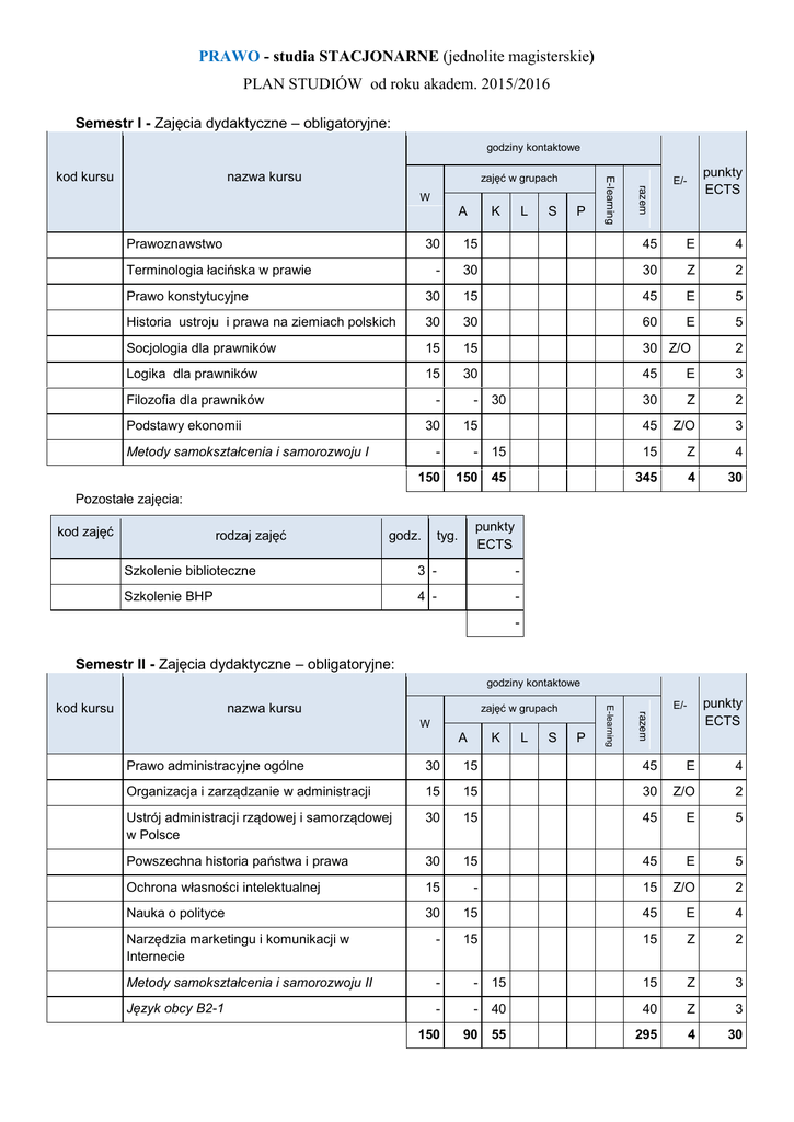 PRAWO - studia STACJONARNE (jednolite magisterskie) PLAN STUDIÓW od roku akadem. 2015/2016 Semestr I - Zajęcia dydaktyczne – obligatoryjne: godziny kontaktowe zajęć w grupach nazwa kursu A Prawoznawstwo K L S P razem W E-learning kod kursu punkty ECTS E/- 30 15 45 E 4 - 30 30 Z 2 Prawo konstytucyjne 30 15 45 E 5 Historia ustroju i prawa na ziemiach polskich 30 30 60 E 5 Socjologia dla prawników 15 15 30 Z/O 2 Logika dla prawników 15 30 45 E 3 - - 30 Z 2 30 15 45 Z/O 3 - - 15 15 Z 4 150 150 45 345 4 30 Terminologia łacińska w prawie Filozofia dla prawników Podstawy ekonomii Metody samokształcenia i samorozwoju I 30 Pozostałe zajęcia: kod zajęć rodzaj zajęć godz. punkty ECTS tyg. Szkolenie biblioteczne 3 - - Szkolenie BHP 4 - - Semestr II - Zajęcia dydaktyczne – obligatoryjne: godziny kontaktowe W A K L S P punkty ECTS E/razem zajęć w grupach nazwa kursu E-learning kod kursu Prawo administracyjne ogólne 30 15 45 E 4 Organizacja i zarządzanie w administracji 15 15 30 Z/O 2 Ustrój administracji rządowej i samorządowej w Polsce 30 15 45 E 5 Powszechna historia państwa i prawa 30 15 45 E 5 Ochrona własności intelektualnej 15 - 15 Z/O 2 Nauka o polityce 30 15 45 E 4 Narzędzia marketingu i komunikacji w Internecie - 15 15 Z 2 Metody samokształcenia i samorozwoju II - - 15 15 Z 3 Język obcy B2-1 - - 40 40 Z 3 150 90 55 295 4 30 PRAWO - studia STACJONARNE (jednolite magisterskie) PLAN STUDIÓW od roku akadem. 2015/2016 Semestr III - Zajęcia dydaktyczne – obligatoryjne: godziny kontaktowe nazwa kursu E/- W A K L S P razem zajęć w grupach E-learning kod kursu punkty ECTS Publiczne prawo gospodarcze 30 15 45 E 4 Prawo administracyjne materialne 30 15 45 E 5 Prawo karne 30 30 60 E 5 Historia doktryn politycznych i prawnych 15 15 30 Z/O 3 Prawo rzymskie 30 15 45 E 5 Systemy wyborcze 15 15 30 Z/O 3 - - 40 Z 3 15 - 15 Z 2 165 105 310 4 30 Język obcy B2-2 Kurs fakultatywny – koszyk ZIMOWY (w języku polskim lub języku obcym) * 40 40 Semestr IV - Zajęcia dydaktyczne – obligatoryjne: godziny kontaktowe kod kursu nazwa kursu E/- A K L S P razem W E-learning zajęć w grupach punkty ECTS Prawo instytucjonalne Unii Europejskiej 30 15 45 E 4 Postępowanie administracyjne i sądowo administracyjne 30 15 45 E 4 Administracja publiczna w państwach UE 30 15 45 E 4 Finanse publiczne 30 15 45 E 4 Prawo karne skarbowe 15 15 30 Z/O 3 - - 30 30 Z 2 - - 30 30 E 4 30 - 30 Z 4 - 30 30 Z 1 165 105 330 5 30 Kultura prawna i społeczna Język obcy B2-3 * Kurs fakultatywny – koszyk LETNI (w języku polskim lub języku obcym) Kultura fizyczna 60 PRAWO - studia STACJONARNE (jednolite magisterskie) PLAN STUDIÓW od roku akadem. 2015/2016 Semestr V - Zajęcia dydaktyczne – obligatoryjne: godziny kontaktowe nazwa kursu E/- W A K L S P razem zajęć w grupach E-learning kod kursu punkty ECTS Prawo cywilne ogólne, rzeczowe i spadkowe 30 30 60 E 5 Prawo gospodarcze Unii Europejskiej 30 30 60 E 5 Postępowanie egzekucyjne w administracji 15 15 30 Z/O 2 Pozaeuropejskie systemy administracji 15 15 30 Z/O 2 Postępowanie karne 30 30 60 E 5 Prawo penitencjarne i postpenitencjarne 30 15 45 Z/O 2 Podstawy negocjacji i mediacji 15 15 30 Z/O 2 Prawo międzynarodowe publiczne 30 15 45 E 3 - - 15 Z 1 30 - 30 Z 3 225 165 405 4 30 Akademicki język obcy dla prawników Kurs fakultatywny – koszyk ZIMOWY (w języku polskim lub języku obcym) * 15 15 Semestr VI - Zajęcia dydaktyczne – obligatoryjne: godziny kontaktowe nazwa kursu E/- W A K L S P razem zajęć w grupach E-learning kod kursu punkty ECTS Prawo cywilne zobowiązaniowe 30 30 60 E 5 Prawo rodzinne 30 15 45 E 5 Prawo ochrony konkurencji 30 15 45 Z/O 4 Polityka regionalna i fundusze strukturalne UE 30 15 45 E 5 Prawo zamówień publicznych 15 15 30 Z/O 3 Metodologia badań w naukach prawnych 15 15 30 E 3 - - 15 Z/O 1 30 - 30 Z 3 - - 15 15 Z 1 105 30 315 4 30 Akademicki język obcy dla prawników Kursy fakultatywne – koszyk LETNI (w języku polskim) Kurs fakultatywny – koszyk LETNI (w języku obcym) * * 180 15 PRAWO - studia STACJONARNE (jednolite magisterskie) PLAN STUDIÓW od roku akadem. 2015/2016 Semestr VII - Zajęcia dydaktyczne – obligatoryjne godziny kontaktowe nazwa kursu E/- W A K L S P razem zajęć w grupach E-learning kod kursu punkty ECTS Prawo finansowe i podatkowe 30 30 60 E 5 Reprezentacja organów państwa 15 15 30 Z/O 2 Prawo handlowe 30 30 60 E 5 System organów bezpieczeństwa państwa 30 15 45 Z/O 3 Prawo prywatne międzynarodowe 30 15 45 Z/O 2 Prawo upadłościowe i naprawcze 30 15 45 E 4 - 30 30 Z/O 2 45 - 45 Z 5 - - 15 15 Z 2 210 150 15 375 3 30 Legislacja i technika prawodawcza Kurs fakultatywny – koszyk ZIMOWY (w języku polskim lub języku obcym) * Proseminarium magisterskie - - Semestr VIII - Zajęcia dydaktyczne – obligatoryjne: godziny kontaktowe nazwa kursu E/- W A K L S P razem zajęć w grupach E-learning kod kursu punkty ECTS Postępowanie cywilne 30 30 60 E 3 Prawo pracy 30 15 45 E 2 Kryminalistyka i kryminologia 30 15 45 Z/O 2 Międzynarodowe stosunki gospodarcze 30 15 45 E 2 30 - 30 Z 3 - - 15 15 Z 1 - - - 15 15 Z 2 150 75 15 15 255 3 15 Kursy fakultatywne – koszyk LETNI (w języku polskim) Kurs fakultatywny – koszyk LETNI (w języku obcym) * * Proseminarium magisterskie - Pozostałe zajęcia: kod zajęć rodzaj zajęć Praktyka zawodowa godz. 360 tygodnie 12 punkty ECTS 15 PRAWO - studia STACJONARNE (jednolite magisterskie) PLAN STUDIÓW od roku akadem. 2015/2016 Semestr IX - Zajęcia dydaktyczne – obligatoryjne: godziny kontaktowe nazwa kursu E/- W A K L S P punkty ECTS razem zajęć w grupach E-learning kod kursu System ubezpieczeń społecznych 30 15 45 E 4 Wywiad gospodarczy i walka informacyjna 15 15 30 Z/O 2 Prawo celne 15 15 30 Z/O 2 Teoria państwa i prawa 30 15 45 E 4 Prawo oświatowe i szkolnictwa wyższego 30 15 45 Z/O 4 Prawo bankowe 30 15 45 Z/O 3 30 15 45 Z 4 45 - 45 Z 5 - - 15 15 Z 2 225 105 15 345 2 30 Prawo socjalne Kurs fakultatywny – koszyk ZIMOWY (w języku pols