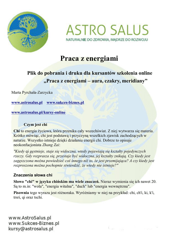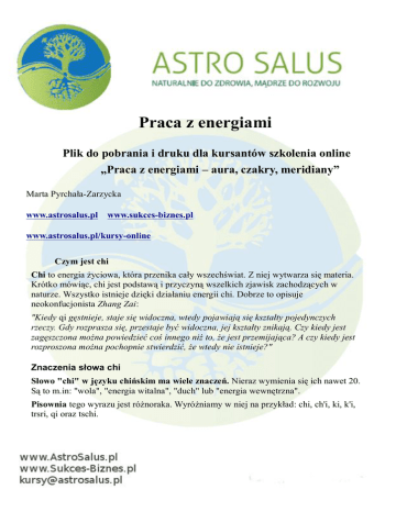 Praca z energiami Plik do pobrania i druku dla kursantów szkolenia online „Praca z energiami – aura, czakry, meridiany” Marta Pyrchała-Zarzycka www.astrosalus.pl www.sukces-biznes.pl www.astrosalus.pl/kursy-online Czym jest chi Chi to energia życiowa, która przenika cały wszechświat. Z niej wytwarza się materia. Krótko mówiąc, chi jest podstawą i przyczyną wszelkich zjawisk zachodzących w naturze. Wszystko istnieje dzięki działaniu energii chi. Dobrze to opisuje neokonfucjonista Zhang Zai: "Kiedy qi gęstnieje, staje się widoczna, wtedy pojawiają się kształty pojedynczych rzeczy. Gdy rozprasza się, przestaje być widoczna, jej kształty znikają. Czy kiedy jest zagęszczona można powiedzieć coś innego niż to, że jest przemijająca? A czy kiedy jest rozproszona można pochopnie stwierdzić, że wtedy nie istnieje?" Znaczenia słowa chi Słowo "chi" w języku chińskim ma wiele znaczeń. Nieraz wymienia się ich nawet 20. Są to m.in: "wola", "energia witalna", "duch" lub "energia wewnętrzna". Pisownia tego wyrazu jest różnoraka. Wyróżniamy w niej na przykład: chi, ch'i, ki, k'i, trsri, qi oraz tschi. Ideogram chi Ideogram chi składa się z kilku części. Środkową stanowi symbol snopka ryżu. Jest on zawarty w symbolu naczynia, na którym z kolei można zobaczyć symbol pary wodnej. Próby wyjaśnienia ideogramu chi Snopek zboża może być symbolem energii pochodzącej z materii, a para wodna energii bardziej subtelnej i nieuchwytnej. Jak wiadomo, para wodna ulatuje z garnka, pod którym jest ogień - źródło energii. Ryż w postaci naturalnej jest bogaty w węglowodany złożone, które przynoszą siłę. Spożycie pokarmów pełnoziarnistych podwyższa poziom energii. Można powiedzieć więc, że ideogram chi oznacza energię pochodzącą z pożywienia lub wytwarzanie się energii w ciele poprzez spożycie bogatego w węglowodany złożone, gotowanego posiłku. Rodzaje chi Jest około 30 rodzajów chi. Między innymi wyróżniamy: chi chi chi chi powietrza, pożywienia, wszechświata, wrodzoną. Chi powietrza znajduje się w powietrzu, chi pożywienia w spożywanych posiłkach, wrodzoną dziedziczymy po przodkach, a chi wszechświata otacza nas. Chi wypełnia i przenika wszystko. Istniejemy w morzu energii chi. Chi w medycynie chińskiej Chi to pojęcie, które jest podstawą całej medycyny chińskiej. W tym rodzaju terapii chorobę rozpatruje się, jak nadmiar, brak, zablokowanie lub nieprawidłowy przepływ chi. Wszelkie medyczne działania mają na celu przywrócenie harmonijnego przepływu chi. Dokonuje się tego za pomocą specjalnych masaży, ćwiczeń fizycznych, właściwego doboru pożywienia i stosowania ziół. Gromadzenie i wydatkowanie energii chi Człowiek w procesie życia pobiera i wydatkuje energię chi. Od jej poziomu zależy jego żywotność i odporność na stres i choroby. Gromadzenie chi zaczyna się już w momencie poczęcia. Część chi jest dziedziczona po przodkach. Gromadzenie chi odbywa się poprzez jej pobieranie. Jak można pobierać energię chi? za pomocą oddychania, poprzez jedzenie, wykonując różnego rodzaju ćwiczenia energetyzujące, z kosmosu (chi kosmosu, wszechświata). W przypadku oddychania pobieram chi powietrza. Im głębiej i wolniej oddychasz, tym więcej pobierasz energii z powietrza. Tlen zawarty w powietrzu służy do spalania składników pokarmowych w ciele. Spalanie to wyzwala duże ilości energii. Zadanie. Jeśli chcesz pobierać więcej energii z powietrza, zwróć uwagę na to, jak o oddychasz. Płytkie oddychanie nie da Ci wystarczającej ilości energii. Bądź świadomy swojego oddechu i oddychaj głęboko i spokojnie. Nie bez powodu słowa w różnych językach, które oznaczają energię, mają często jeszcze jedne znaczenie - "oddech" lub "tchnienie". Bardzo ważne jest też chi pożywienia. Im lepszej jakości jedzenie, tym więcej dostarcza ono energii chi. Stąd niezwykle istotną sprawą jest właściwe odżywianie się. Zgodnie z ideogramem chi, dużo energii przynosi spożywanie potraw z pełnego ziarna. Chińczycy natomiast twierdzą, że posiłki mrożone lub przygotowywane w mikrofalówce, są pozbawione energii chi. Zadanie. Zwróć uwagę na to, co jesz. Wybieraj zdrowe, dobrej jakości potrawy. Wtedy dostarczysz swojemu ciału wystarczająco energii z pożywienia. Bardzo ważny według chińskiego podejścia do zdrowia jest ruch. Ruch niewłaściwy może powodować zmniejszenie się ilości chi w organizmie. Są jednak takie rodzaje aktywności fizycznej, które przyczyniają się do wzrostu energii chi w ciele. To chi gong oraz tai chi. Chi Wszechświata pobieramy całą powierzchnią ciała. Szczególnie dużo wpływa jej przez czakry, w tym małe punkty akupunkturowe. Chi Wszechświata prawdopodobnie pobieramy także w większej ilości podczas snu, kiedy struktura energetyczna unosi się nad ciałem. Jak wyczerpujemy energię chi? zażywając narkotyki, nadużywając alkoholu, przeżywając negatywne emocje takie, jak poczucie winy i nienawiść, poprzez nadmierne uprawianie seksu. Chińczycy zwykli mawiać: ”Kiedy Chi gromadzi się – formuje się fizyczna postać ciała. Kiedy Chi ulega zanikowi – ciało obumiera”. Należy więc dbać o to, by stale uzupełniać zapas energii chi.