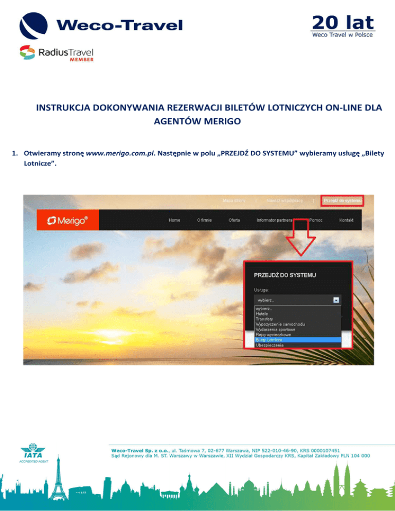 INSTRUKCJA DOKONYWANIA REZERWACJI BILETÓW LOTNICZYCH ON-LINE DLA AGENTÓW MERIGO 1. Otwieramy stronę www.merigo.com.pl. Następnie w polu „PRZEJDŹ DO SYSTEMU” wybieramy usługę „Bilety Lotnicze”. 2. Po wybraniu zakładki „Bilety Lotnicze” ukazuje się strona główna systemu rezerwacji biletów lotniczych on-line. 3. W celu rozpoczęcia wyszukiwania wypełniamy wszystkie pola modułu wyszukiwarki - lot w obie strony – system wyświetli połączenia w obie strony - lot w jedną stronę - system wyświetli wyłącznie połączenia w jedną stronę (okno z datą powrotu stanie się nieaktywne) - multi city – opcja umożliwia wyszukanie połączeń na wylot i powrót z różnych miast - wylot/przylot - trakcie wpisywania kolejnych liter system będzie podpowiadał lokalizację - data wylotu/data powrotu – datę wybieramy z kalendarza - pasażerowie – określamy liczbę pasażerów tj. liczbę osób dorosłych/dzieci/niemowląt/seniorów 4. Po prawidłowym wprowadzeniu wszystkich potrzebnych danych należy kliknąć przycisk „szukaj” 5. Zostanie wyświetlona lista z wynikami wyszukiwania, które spełniają wcześniej wybrane kryteria - system wyszuka połączeń na tradycyjne oraz tanie linie lotnicze - automatycznie zostanie zainicjowane wyszukiwanie +/- 3 dni a jego wyniki (ceny) będą widoczne w górnej części strony. Wystarczy kliknąć na daną cenę aby wyświetlić dane połączenie. - wyświetloną listę dostępnych połączeń możemy dodatkowo selekcjonować za pomocą filtrów znajdujących się po lewej stronie systemu. Filtrować możemy według kryteriów: przesiadki, cena, całkowity czas podróży, godzina wylotu, godzina powrotu czy linie lotnicze. 6. Wybieramy opcję, która spełnia nasze kryteria - klikając „zobacz szczegóły” możemy sprawdzić dokładne informacje dotyczące wybranego połączenia - wybieramy interesującą nas opcje klikają przycisk „wybierz lot” 7. Szczegóły rezerwacji - zostaniemy przekierowani na kolejny krok ścieżki rezerwacji biletu lotniczego - na tym etapie widzimy dokładne szczegóły wybranej przez nas opcji, takie jak daty podróży oraz godziny, linie lotnicze, numery lotów, czas lotów, czas oczekiwania na przesiadkę czy typ samolotu. - wyszczególniona została też cena za bilet (taryfa + opłaty lotniskowe), opłata transakcyjna, łączna kwota za bilet oraz informacja dotycząca ostatecznego terminu wykupu biletu - na tym etapie należy zapoznać się z warunkami i szczegółami taryfy zastosowanej w wybranej przez nas opcji - jeżeli sprawdzone informacje odpowiadają naszym wymaganiom klikamy przy wybranej przez nas opcji przycisk „dalej” 8. Przechodzimy do etapu, w którym należy podać dane pasażerów - pola oznaczone „*” są polami obowiązkowymi - jeżeli chcemy otrzymać fakturę zaznaczamy pole „chcę otrzymać fakturę” i podajemy niezbędne dane - na tym etapie możemy również podać kartę jednego z programów lojalnościowych linii lotniczych oraz zamówić posiłek specjalny (uwaga: dostępność posiłków zawsze jest potwierdzana przez linie lotnicze. Wybranie posiłku nie oznacza, że zostanie on podany pasażerowi) - jeżeli wszystkie pole zostały uzupełnione klikamy przycisk „dalej” 9. W następnej kolejności wybieramy formę płatności. Do wyboru mamy: - przelew bankowy – w tym przypadku należy zwrócić szczególną uwagę na informacje o ostatecznym terminie wykupu biletów - karta kredytowa – w przypadku wybrania tej opcji należy wypełnić wszystkie wymagane pola. Uwaga: - w przypadku płatności przelewem należy pamiętać o tym, iż ostateczna cena biletu może różnić się nieznacznie od tej podanej na rezerwacji (np. z powodu różnic kursowych) - w przypadku płatności kartą kredytową niektórzy przewoźnicy, na niektórych trasach mogą doliczać dodatkowe opłaty 10. Po uzupełnieniu, dokładnym sprawdzeniu wszystkich w/w danych i zaakceptowaniu regulaminu korzystania z systemu rezerwacji klikamy przycisk „rezerwuj”. Skutkuje to założeniem wiążącej rezerwacji biletu lotniczego w systemie. 11. Na ekranie pojawi się potwierdzenie rezerwacji wraz z jej numerem oraz wszystkimi, wprowadzonymi wcześniej danymi. Podobne potwierdzenie zostanie automatycznie wysłane na adres e-mail podany na etapie wypełniania danych kontaktowych. Uwaga: Jeżeli chcecie Państwo otrzymać bilet w trybie pilnym, prosimy o kontakt telefoniczny z naszym biurem 22 568 09 58 Uwaga: Jeżeli nie jesteście Państwo w stanie samodzielnie dokonać rezerwacji w systemie z uwagi na specyfikę i złożoność trasy przelotu istnieje możliwość zlecenia dokonania rezerwacji call center Weco-Travel. Zlecenia można dokonać: telefonicznie 22 568 09 58 lub pocztą elektroniczną [email protected] Usługa taka jest dodatkowo płatna.