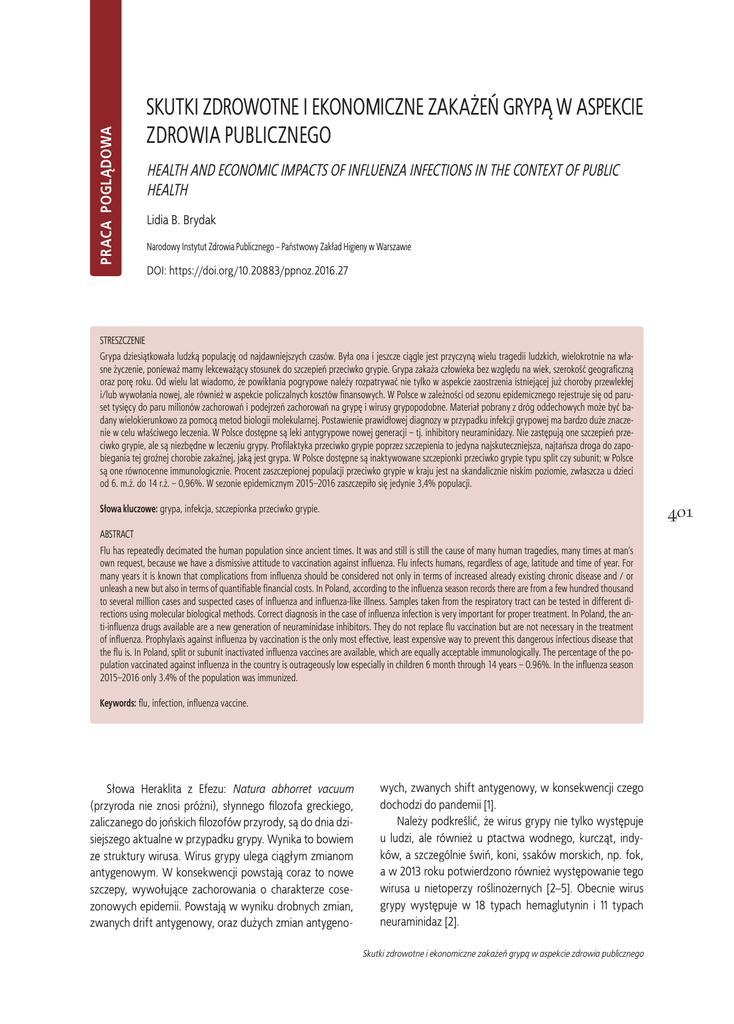 PRACA PoGLĄDOWA Skutki zdrowotne i ekonomiczne zakażeń grypą w aspekcie zdrowia publicznego Health and economic impacts of influenza infections in the context of public health Lidia B. Brydak Narodowy Instytut Zdrowia Publicznego – Państwowy Zakład Higieny w Warszawie DOI: https://doi.org/10.20883/ppnoz.2016.27 Streszczenie Grypa dziesiątkowała ludzką populację od najdawniejszych czasów. Była ona i jeszcze ciągle jest przyczyną wielu tragedii ludzkich, wielokrotnie na własne życzenie, ponieważ mamy lekceważący stosunek do szczepień przeciwko grypie. Grypa zakaża człowieka bez względu na wiek, szerokość geograficzną oraz porę roku. Od wielu lat wiadomo, że powikłania pogrypowe należy rozpatrywać nie tylko w aspekcie zaostrzenia istniejącej już choroby przewlekłej i/lub wywołania nowej, ale również w aspekcie policzalnych kosztów finansowych. W Polsce w zależności od sezonu epidemicznego rejestruje się od paruset tysięcy do paru milionów zachorowań i podejrzeń zachorowań na grypę i wirusy grypopodobne. Materiał pobrany z dróg oddechowych może być badany wielokierunkowo za pomocą metod biologii molekularnej. Postawienie prawidłowej diagnozy w przypadku infekcji grypowej ma bardzo duże znaczenie w celu właściwego leczenia. W Polsce dostępne są leki antygrypowe nowej generacji – tj. inhibitory neuraminidazy. Nie zastępują one szczepień przeciwko grypie, ale są niezbędne w leczeniu grypy. Profilaktyka przeciwko grypie poprzez szczepienia to jedyna najskuteczniejsza, najtańsza droga do zapobiegania tej groźnej chorobie zakaźnej, jaką jest grypa. W Polsce dostępne są inaktywowane szczepionki przeciwko grypie typu split czy subunit; w Polsce są one równocenne immunologicznie. Procent zaszczepionej populacji przeciwko grypie w kraju jest na skandalicznie niskim poziomie, zwłaszcza u dzieci od 6. m.ż. do 14 r.ż. – 0,96%. W sezonie epidemicznym 2015–2016 zaszczepiło się jedynie 3,4% populacji. 401 Słowa kluczowe: grypa, infekcja, szczepionka przeciwko grypie. Abstract Flu has repeatedly decimated the human population since ancient times. It was and still is still the cause of many human tragedies, many times at man’s own request, because we have a dismissive attitude to vaccination against influenza. Flu infects humans, regardless of age, latitude and time of year. For many years it is known that complications from influenza should be considered not only in terms of increased already existing chronic disease and / or unleash a new but also in terms of quantifiable financial costs. In Poland, according to the influenza season records there are from a few hundred thousand to several million cases and suspected cases of influenza and influenza-like illness. Samples taken from the respiratory tract can be tested in different directions using molecular biological methods. Correct diagnosis in the case of influenza infection is very important for proper treatment. In Poland, the anti-influenza drugs available are a new generation of neuraminidase inhibitors. They do not replace flu vaccination but are not necessary in the treatment of influenza. Prophylaxis against influenza by vaccination is the only most effective, least expensive way to prevent this dangerous infectious disease that the flu is. In Poland, split or subunit inactivated influenza vaccines are available, which are equally acceptable immunologically. The percentage of the population vaccinated against influenza in the country is outrageously low especially in children 6 month through 14 years – 0.96%. In the influenza season 2015–2016 only 3.4% of the population was immunized. Keywords: flu, infection, influenza vaccine. Słowa Heraklita z Efezu: Natura abhorret vacuum (przyroda nie znosi próżni), słynnego filozofa greckiego, zaliczanego do jońskich filozofów przyrody, są do dnia dzisiejszego aktualne w przypadku grypy. Wynika to bowiem ze struktury wirusa. Wirus grypy ulega ciągłym zmianom antygenowym. W konsekwencji powstają coraz to nowe szczepy, wywołujące zachorowania o charakterze cosezonowych epidemii. Powstają w wyniku drobnych zmian, zwanych drift antygenowy, oraz dużych zmian antygeno- wych, zwanych shift antygenowy, w konsekwencji czego dochodzi do pandemii [1]. Należy podkreślić, że wirus grypy nie tylko występuje u ludzi, ale również u ptactwa wodnego, kurcząt, indyków, a szczególnie świń, koni, ssaków morskich, np. fok, a w 2013 roku potwierdzono również występowanie tego wirusa u nietoperzy roślinożernych [2–5]. Obecnie wirus grypy występuje w 18 typach hemaglutynin i 11 typach neuraminidaz [2]. Skutki zdrowotne i ekonomiczne zakażeń grypą w aspekcie zdrowia publicznego 402 W XX wieku miały miejsce trzy pandemie grypy wywołane różnymi subtypami wirusa grypy typu A. Najtragiczniejszą w skutkach była hiszpanka w latach 1918–1919 (A/H1N1) powodująca wg dostępnych obecnie danych między 50–100 mln zgonów. Następne dwie pandemie: pandemia azjatycka w roku 1957–1958 (AH2N2) i pandemia tzw. ery Hong-Kong (A/H3N2) w roku 1968– 1969 spowodowały znacznie mniejszą liczbę zgonów, bo około 1–4 mln dla każdej z nich [6]. Należy podkreślić, że pandemia ery Hong-Kong, która przyszła do Polski z dużym opóźnieniem – 1971 r., spowodowała wg danych PZH 5940 zgonów [7]. Ponadto od pandemii ery Hong-Kong potwierdzono krążenie w populacji wirusów dwóch subtypów wirusa grypy typu A i wirusa grypy typu B. Kamieniem węgielnym wielokierunkowych badań nad grypą było wyizolowanie wirusa grypy u ludzi w 1933 r. przez trzech angielskich badaczy Ch. Andrewesa, W. Smitha oraz P. Laidlawa, w Londynie (obecnie mieści się tam WHO Collaborating Centre – WHO CC for Reference and Research on Influenza at The Francis Crick Institute – Londyn, UK). Gwałtowne szerzenie się choroby zakaźnej, jaką jest grypa, spowodowane jest z jednej strony możliwością szybkiego przemieszczania się