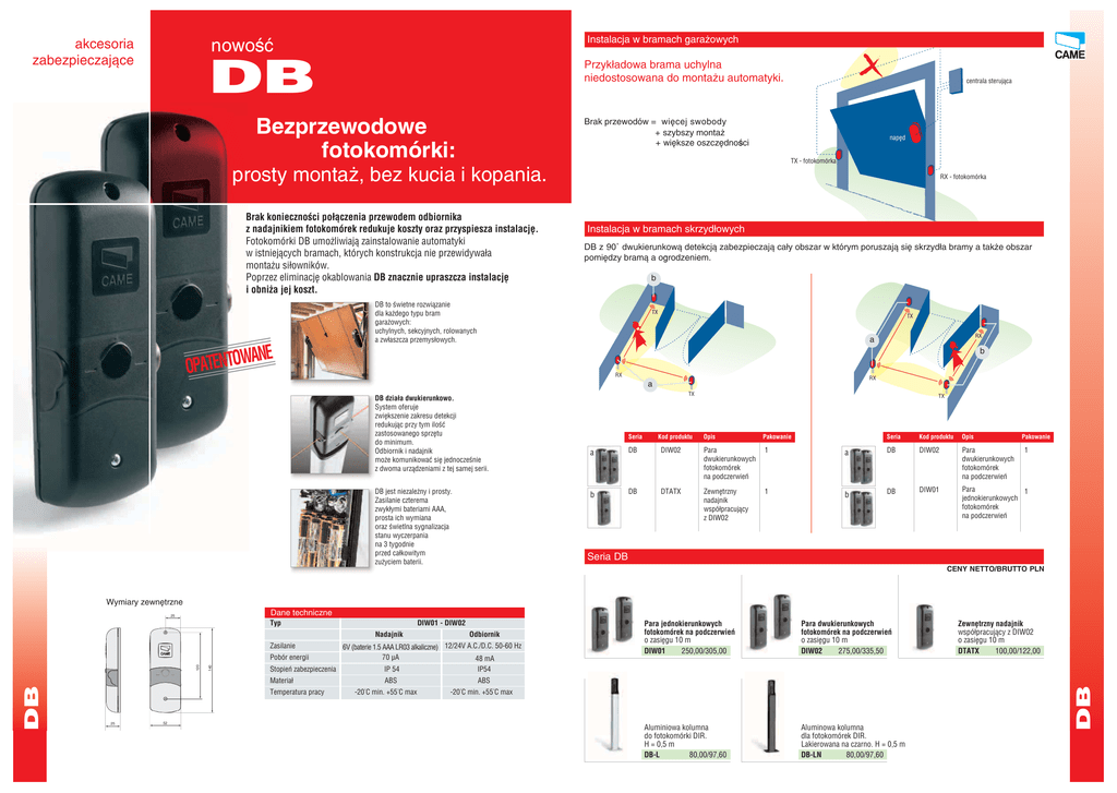 Instalacja w bramach garażowych nowość akcesoria zabezpieczające DB Przykładowa brama uchylna niedostosowana do montażu automatyki. Bezprzewodowe fotokomórki: Brak przewodów = więcej swobody + szybszy montaż + większe oszczędności napęd TX - fotokomórka prosty montaż, bez kucia i kopania. Brak konieczności połączenia przewodem odbiornika z nadajnikiem fotokomórek redukuje koszty oraz przyspiesza instalację. Fotokomórki DB umożliwiają zainstalowanie automatyki w istniejących bramach, których konstrukcja nie przewidywała montażu siłowników. Poprzez eliminację okablowania DB znacznie upraszcza instalację i obniża jej koszt. ANE OPATENTOW centrala sterująca RX - fotokomórka Instalacja w bramach skrzydłowych DB z 90° dwukierunkową detekcją zabezpieczają cały obszar w którym poruszają się skrzydła bramy a także obszar pomiędzy bramą a ogrodzeniem. b DB to świetne rozwiązanie dla każdego typu bram garażowych: uchylnych, sekcyjnych, rolowanych a zwłaszcza przemysłowych. TX TX RX a b RX RX a DB działa dwukierunkowo. System oferuje zwiększenie zakresu detekcji redukując przy tym ilość zastosowanego sprzętu do minimum. Odbiornik i nadajnik może komunikować się jednocześnie z dwoma urządzeniami z tej samej serii. DB jest niezależny i prosty. Zasilanie czterema zwykłymi bateriami AAA, prosta ich wymiana oraz świetlna sygnalizacja stanu wyczerpania na 3 tygodnie przed całkowitym zużyciem baterii. TX Seria Kod produktu TX Opis Pakowanie Seria Kod produktu Opis Pakowanie a DB DIW02 Para dwukierunkowych fotokomórek na podczerwień 1 a DB DIW02 Para dwukierunkowych fotokomórek na podczerwień 1 b DB DTATX Zewnętrzny nadajnik współpracujący z DIW02 1 b DB DIW01 Para 1 jednokierunkowych fotokomórek na podczerwień Seria DB CENY NETTO/BRUTTO PLN Wymiary zewnętrzne Dane techniczne Typ DIW01 - DIW02 Nadajnik Zasilanie 120 DB 140 Pobór energii 25 52 6V (baterie 1.5 AAA LR03 alkaliczne) 12/24V A.C./D.C. 50-60 Hz 70 μA 48 mA Stopień zabezpieczenia IP 54 Materiał ABS Temperatura pracy Odbiornik -20°C min. +55°C max Para jednokierunkowych fotokomórek na podczerwień o zasięgu 10 m DIW01 250,00/305,00 Para dwukierunkowych fotokomórek na podczerwień o zasięgu 10 m DIW02 275,00/335,50 Aluminiowa kolumna do fotokomórki DIR. H = 0,5 m DB-L 80,00/97,60 Aluminowa kolumna dla fotokomórek DIR. Lakierowana na czarno. H = 0,5 m DB-LN 80,00/97,60 Zewnętrzny nadajnik współpracujący z DIW02 o zasięgu 10 m DTATX 100,00/122,00 IP54 ABS -20°C min. +55°C max DB 25