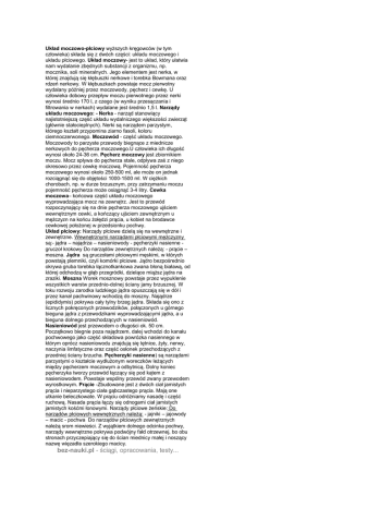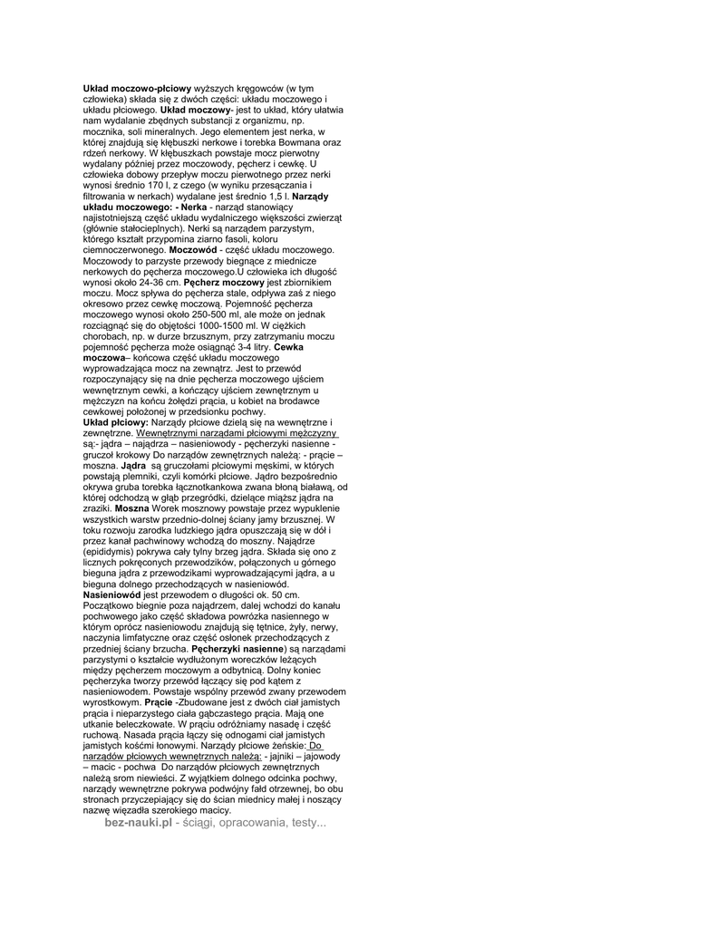 Układ moczowo-płciowy wyższych kręgowców (w tym człowieka) składa się z dwóch części: układu moczowego i układu płciowego. Układ moczowy- jest to układ, który ułatwia nam wydalanie zbędnych substancji z organizmu, np. mocznika, soli mineralnych. Jego elementem jest nerka, w której znajdują się kłębuszki nerkowe i torebka Bowmana oraz rdzeń nerkowy. W kłębuszkach powstaje mocz pierwotny wydalany później przez moczowody, pęcherz i cewkę. U człowieka dobowy przepływ moczu pierwotnego przez nerki wynosi średnio 170 l, z czego (w wyniku przesączania i filtrowania w nerkach) wydalane jest średnio 1,5 l. Narządy układu moczowego: - Nerka - narząd stanowiący najistotniejszą część układu wydalniczego większości zwierząt (głównie stałocieplnych). Nerki są narządem parzystym, którego kształt przypomina ziarno fasoli, koloru ciemnoczerwonego. Moczowód - część układu moczowego. Moczowody to parzyste przewody biegnące z miednicze nerkowych do pęcherza moczowego.U człowieka ich długość wynosi około 24-36 cm. Pęcherz moczowy jest zbiornikiem moczu. Mocz spływa do pęcherza stale, odpływa zaś z niego okresowo przez cewkę moczową. Pojemność pęcherza moczowego wynosi około 250-500 ml, ale może on jednak rozciągnąć się do objętości 1000-1500 ml. W ciężkich chorobach, np. w durze brzusznym, przy zatrzymaniu moczu pojemność pęcherza może osiągnąć 3-4 litry. Cewka moczowa– końcowa część układu moczowego wyprowadzająca mocz na zewnątrz. Jest to przewód rozpoczynający się na dnie pęcherza moczowego ujściem wewnętrznym cewki, a kończący ujściem zewnętrznym u mężczyzn na końcu żołędzi prącia, u kobiet na brodawce cewkowej położonej w przedsionku pochwy. Układ płciowy: Narządy płciowe dzielą się na wewnętrzne i zewnętrzne. Wewnętrznymi narządami płciowymi mężczyzny są:- jądra – najądrza – nasieniowody - pęcherzyki nasienne gruczoł krokowy Do narządów zewnętrznych należą: - prącie – moszna. Jądra są gruczołami płciowymi męskimi, w których powstają plemniki, czyli komórki płciowe. Jądro bezpośrednio okrywa gruba torebka łącznotkankowa zwana błoną białawą, od której odchodzą w głąb przegródki, dzielące miąższ jądra na zraziki. Moszna Worek mosznowy powstaje przez wypuklenie wszystkich warstw przednio-dolnej ściany jamy brzusznej. W toku rozwoju zarodka ludzkiego jądra opuszczają się w dół i przez kanał pachwinowy wchodzą do moszny. Najądrze (epididymis) pokrywa cały tylny brzeg jądra. Składa się ono z licznych pokręconych przewodzików, połączonych u górnego bieguna jądra z przewodzikami wyprowadzającymi jądra, a u bieguna dolnego przechodzących w nasieniowód. Nasieniowód jest przewodem o długości ok. 50 cm. Początkowo biegnie poza najądrzem, dalej wchodzi do kanału pochwowego jako część składowa powrózka nasiennego w którym oprócz nasieniowodu znajdują się tętnice, żyły, nerwy, naczynia limfatyczne oraz część osłonek przechodzących z przedniej ściany brzucha. Pęcherzyki nasienne) są narządami parzystymi o kształcie wydłużonym woreczków leżących między pęcherzem moczowym a odbytnicą. Dolny koniec pęcherzyka tworzy przewód łączący się pod kątem z nasieniowodem. Powstaje wspólny przewód zwany przewodem wyrostkowym. Prącie -Zbudowane jest z dwóch ciał jamistych prącia i nieparzystego ciała gąbczastego prącia. Mają one utkanie beleczkowate. W prąciu odróżniamy nasadę i część ruchową. Nasada prącia łączy się odnogami ciał jamistych jamistych kośćmi łonowymi. Narządy płciowe żeńskie: Do narządów płciowych wewnętrznych należą: - jajniki – jajowody – macic - pochwa Do narządów płciowych zewnętrznych należą srom niewieści. Z wyjątkiem dolnego odcinka pochwy, narządy wewnętrzne pokrywa podwójny fałd otrzewnej, bo obu stronach przyczepiający się do ścian miednicy małej i noszący nazwę więzadła szerokiego macicy. bez-nauki.pl - ściągi, opracowania, testy... Jajnik jest parzystym gruczołem płciowym żeńskim o kształcie jajowatym, wielkości 3cm X 2cm X 1cm, i wadze 5-2 g. Jajnik leży przy bocznych ścianach miednicy małej na tylnej powierzchni więzadła szerokiego macicy. Więzadło jajnika właściwe łączy biegun dolny gruczołu z macicą, a koniec góry leży przy ujściu brzusznym jajowodu. Jajowód jest przewodem parzystym, biegnącym w więzadle szerokim od okolicy końca jajowodowego jajnika do górno- bocznego kąta macicy. Długość jego wynosi ok. 12cm. Przewodem tym jajo dostaje się do macicy. Macica jest narządem nieparzystym. Kształtem podobna jest do spłaszczonej gruszki. Położona jest w miednicy małej między pęcherzem moczowym a odbytnicą. Uwypuklona górna część nosi nazwę dna, które ku dołowi przechodzi trzon, a niżej w szyjkę, w której odróżniamy część nadpochwową i część pochwową szyjki, wpuklającą się do pochwy. Pochwa ma kształt spłaszczonej cewki, która łączy ujście macicy z przedsionkiem pochwy. Rozciągliwe ściany umożliwiają znaczne zwiększenie jej i długości, co uwidacznia się przy porodzie. Ku przodowi od pochwy leżą pęcherz i cewka moczowa., ku tyłowi – odbytnica. Zapłodnienie- Proces, który zachodzi po ejakulacji, gdy plemniki docierają do komórki jajowej w jajowodzie. Tylko jeden plemnik przebija wewnętrzną osłonę komórki jajowej (warstwę przejrzysta), a jego jądro komórkowe łączy się z jądrem komórkowym komórki jajowej. W ten sposób powstaje pierwsza komórka dziecka zwana zygotą. Przemieszcza się ona w stronę macicy podlegając w tym czasie licznym podziałom. Uformowana w ich wyniku kulista grupa komórek osadza się następnie w ścianie macicy. Nazywamy to implantacją. Od tego momentu nowe komórki nazywamy embrionem. Budowa plemnika: a) główka, b) witka, c) jądro komórkowe, d) akrosom, e) wstawka z włóknem osi