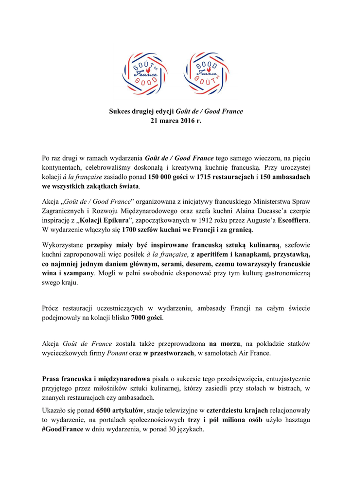 Sukces drugiej edycji Goût de / Good France 21 marca 2016 r. Po raz drugi w ramach wydarzenia Goût de / Good France tego samego wieczoru, na pięciu kontynentach, celebrowaliśmy doskonałą i kreatywną kuchnię francuską. Przy uroczystej kolacji à la française zasiadło ponad 150 000 gości w 1715 restauracjach i 150 ambasadach we wszystkich zakątkach świata. Akcja „Goût de / Good France” organizowana z inicjatywy francuskiego Ministerstwa Spraw Zagranicznych i Rozwoju Międzynarodowego oraz szefa kuchni Alaina Ducasse’a czerpie inspirację z „Kolacji Epikura”, zapoczątkowanych w 1912 roku przez Auguste’a Escoffiera. W wydarzenie włączyło się 1700 szefów kuchni we Francji i za granicą. Wykorzystane przepisy miały być inspirowane francuską sztuką kulinarną, szefowie kuchni zaproponowali więc posiłek à la française, z aperitifem i kanapkami, przystawką, co najmniej jednym daniem głównym, serami, deserem, czemu towarzyszyły francuskie wina i szampany. Mogli w pełni swobodnie eksponować przy tym kulturę gastronomiczną swego kraju. Prócz restauracji uczestniczących w wydarzeniu, ambasady Francji na całym świecie podejmowały na kolacji blisko 7000 gości. Akcja Goût de France została także przeprowadzona na morzu, na pokładzie statków wycieczkowych firmy Ponant oraz w przestworzach, w samolotach Air France. Prasa francuska i międzynarodowa pisała o sukcesie tego przedsięwzięcia, entuzjastycznie przyjętego przez miłośników sztuki kulinarnej, którzy zasiedli przy stołach w bistrach, w znanych restauracjach czy ambasadach. Ukazało się ponad 6500 artykułów, stacje telewizyjne w czterdziestu krajach relacjonowały to wydarzenie, na portalach społecznościowych trzy i pół miliona osób użyło hasztagu #GoodFrance w dniu wydarzenia, w ponad 30 językach. Od Kambodży po Polskę, przez Ghanę, Australię czy Meksyk, Goût de / Good France pozwoliło pokazać sztukę życia à la française, produkty lokalne, a szerzej mówiąc podkreślić atrakcyjność Francji jako kierunku turystycznego. Bardziej niż kiedykolwiek gastronomia jest kluczowym atutem naszego kraju: co trzeci turysta przybywający nad Sekwanę chce zasmakować we francuskiej sztuce kulinarnej. W tym roku, minister Spraw Zagranicznych i Rozwoju Międzynarodowego odwiedził trzy paryskie restauracje uczestniczące w akcji „Goût de / Good France, od skromnego bistro począwszy po renomowaną restaurację, aby spotkać się z szefami kuchni i klientami. Miało to także szczególne znaczenie po ubiegłorocznych zamachach terrorystycznych. „Szefowie kuchni w restauracjach na całym świecie zaproponowali menu składające się z dań kuchni francuskiej lub inspirowanych tą kuchnią, wykorzystując różnorodne francuskie produkty lokalne, w tym znakomitej jakości produkty świeże, nasze wina i szampany. Dziś wieczorem chcieliśmy podkreślić, że nigdy nie zrezygnujemy z naszego sposobu życia, wspólnego zasiadania przy stole, by wzajemnie dzielić się posiłkiem i odkrywać nieznane smaki, to także należy do naszej narodowej kuchni!” Jean-Marc Ayrault Minister Spraw Zagranicznych i Rozwoju Międzynarodowego „Druga edycja Goût de / Good France odniosła wielki sukces! Wzięło w niej udział 1.715 restauracji w 150 krajach. Dziękuję wszystkim szefom małych i dużych restauracji, którzy przyłączyli się do tego przedsięwzięcia, aby celebrować sztukę życia à la française w całej jej różnorodności”. Alain Ducasse Jean-Marc Ayrault, Minister Spraw Zagranicznych i Rozwoju Międzynarodowego zainaugurował akcję w Bistro Paradis, kierowanym przez francusko-brazylijskiego szefa kuchni. Następnie udał się do restauracji Allard, aby pogratulować młodej szefowej kuchni Laëtitii Rouabah, a potem do Le Meurice, sztandarowej restauracji Alaina Ducasse’a. Dania serwowane na całym świecie 21 marca przyrządzono ze świeżych produktów francuskich i lokalnych. Na szczególne uznanie zasługują foie gras z daktylami i crème brulée z kwiatem hibiskusa serwowane w Sudanie, małże świętego Jakuba z Murmańska w calvadosie i beza Pavlova przyrządzone w Rosji, Magret de canard z owocem tupiro z Amazonii, podane w Wenezueli … W duchu dzielenia się doświadczeniami, kilku znanych francuskich szefów kuchni udało się za granicę: Sébastien Sanjou, wyróżniony prestiżowymi gwiazdkami Michelina, przyrządził kolację dla księcia Udaipura w Indiach, Alain Passard, zdobywca trzech gwiazdek Michelina, przygotował uroczystą kolację w Indonezji, Stéphan Paroche, zdobywca wyróżnienia Bib Gourmand Michelin, przyrządził kolację w Albanii. Laureat tytułu „Meilleur Ouvrier de France”, William Jacquier udał się na Madagaskar. NIEMCY Dziewięciu małych szefów kuchni w wieku 10 i 11 lat przygotowywało potrawy u boku szefa kuchni Ambasady Francji w Berlinie, Wilfrieda Bancquarta. Słodkie przysmaki przez nich przygotowane zostały podane gościom zaproszonym na kolację Goût de France w ambasadzie. ALGIERIA Jean-Pierre Xiradakis i pięciu szefów kuchni z Bordeaux zaproponowało menu „Południowy zachód” w pięciu miastach Algierii: Stéphane Carrade w Algierze, Julien Cruège w Konstantynie, Emmanuel Bouchet w Annabie, Yves Lemarié w Tlemcen a Franck Audu w Oranie. W związku z tą inicjatywą, pięciu młodych kucharzy algierskich skorzysta z programu „Parcours d’excellence culinaire” umożliwiającego im odbycie stażu zawodowego w restauracjach wcześniej wspomnianych pięciu szefów kuchni. JAPONIA Na uroczystej kolacji w rezydencji Ambasadora Francji w Tokio zgromadziło się 60 osobistości. Tematem kolacji był kosmos, a goście, wśród których była japońska Minister odpowiedzialna za politykę kosmiczną, mogli degustować potrawy inspirowane świątecznymi posiłkami astronautów, łączącymi francuską sztukę kulinarną, innowacyjność i bezpieczeństwo zdrowotne. ZJEDNOCZONE KRÓLESTWO Osadzen