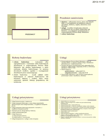 2013-11-07 Przedmiot zamówienia dostawy - nabywanie rzeczy, praw oraz innych PRZEDMIOT Roboty budowlane Usługi roboty Rozporządzenie Prezesa Rady Ministrów z dnia 28 budowlane wykonanie albo zaprojektowanie i wykonanie robót budowlanych określonych w rozporządzeniu Prezesa Rady Ministrów lub obiektu budowlanego, a także realizację obiektu budowlanego, za pomocą dowolnych środków, zgodnie z wymaganiami określonymi przez zamawiającego obiekt budowlany – wynik całości robót budowlanych w zakresie budownictwa lub inżynierii lądowej i wodnej, który może samoistnie spełniać funkcję gospodarczą lub techniczną Usługi priorytetowe Usługi konserwacyjne i naprawcze Usługi transportu lądowego, w tym usługi samochodów dóbr, w szczególności na podstawie umowy sprzedaży, dostawy, najmu, dzierżawy oraz leasingu usługi - wszelkie świadczenia, których przedmiotem nie są roboty budowlane lub dostawy, a są usługami wymienionymi w rozporządzeniu Prezesa Rady Ministrów roboty budowlane opancerzonych oraz usługi kurierskie, z wyjątkiem transportu poczty Usługi transportu lotniczego pasażerów i towarów, z wyjątkiem transportu poczty Transport poczty drogą lądową i lotniczą Usługi telekomunikacyjne Usługi finansowe a) usługi ubezpieczeniowe; b) usługi bankowe i inwestycyjne Usługi komputerowe i usługi z nimi związane stycznia 2010 r. w sprawie wykazu usług o charakterze priorytetowym i niepriorytetowym, Przenosi do prawa wewnętrznego treść załącznika II do dyrektywy 2004/18/WE i załącznika XVII A i XVII B do dyrektywy 2004/17/WE Dzieli usługi na: priorytetowe – załacznik II A niepriorytewowe – załącznik II B Prezes Rady Ministrów wyda również rozporządzenie przenoszące wykaz z dyrektywy obronnej Usługi priorytetowe usługi badawcze i rozwojowe usługi w zakresie księgowości, audytu oraz prowadzenia ksiąg rachunkowych usługi badania rynku i opinii publicznej usługi konsultacyjne w zakresie zarządzania i usługi z nimi związane usługi architektoniczne, inżynieryjne i zintegrowane usługi inżynieryjne; usługi urbanistyczne, architektury krajobrazu, związane z nimi usługi konsultacji naukowych i technicznych; usługi badań i analiz technicznych usługi reklamowe usługi sprzątania budynków i usługi zarządzania mieniem usługi w zakresie publikowania i drukowania – wykonywane na podstawie wynagrodzenia lub umowy usługi w zakresie odprowadzania ścieków i wywozu nieczystości; usługi sanitarne i podobne 1 2013-11-07 Usługi niepriorytetowe Usługi hotelarskie i restauracyjne Usługi transportu kolejowego Usługi transportu wodnego Dodatkowe i pomocnicze usługi transportowe Usługi prawnicze Usługi rekrutacji i pozyskiwania personelu Usługi detektywistyczne i bezpieczeństwa, z wyjątkiem usług samochodów opancerzonych Usługi edukacyjne i szkoleniowe Usługi społeczne i zdrowotne Usługi rekreacyjne, kulturalne i sportowe Inne usługi Ułatwienia w postępowaniu – usługi niepriorytetowe Zamawiający może wszcząć postępowanie w trybie: negocjacji bez ogłoszenia lub zamówienia z wolnej ręki także w innych uzasadnionych przypadkach niż przewidziane dla trybu, w szczególności jeżeli zastosowanie innego trybu mogłoby skutkować co najmniej jedną z następujących okoliczności: naruszeniem zasad celowego, oszczędnego i efektywnego dokonywania wydatków; naruszeniem zasad dokonywania wydatków w wysokości i w terminach wynikających z wcześniej zaciągniętych zobowiązań; poniesieniem straty w mieniu publicznym; uniemożliwieniem terminowej realizacji zadań. Ułatwienia w postępowaniu – usługi niepriorytetowe Nie stosuje się przepisów ustawy dotyczących: terminów składania wniosków o dopuszczenie do udziału w postępowaniu lub terminów składania ofert, obowiązku żądania wadium, obowiązku żądania dokumentów potwierdzających spełnianie warunków udziału w postępowaniu, zakazu ustalania kryteriów oceny ofert na podstawie właściwości wykonawcy przesłanek wyboru trybu: negocjacji z ogłoszeniem, dialogu konkurencyjnego licytacji elektronicznej. USŁUGI NIEPRIORYTETOWE W przypadku usług prawniczych, polegających na wykonywaniu zastępstwa procesowego przed sądami, trybunałami lub innymi organami orzekającymi lub doradztwie prawnym w zakresie zastępstwa procesowego, lub jeżeli wymaga tego ochrona ważnych praw lub interesów Skarbu Państwa, nie stosuje się przepisów ustawy dotyczących przesłanek wyboru trybu negocjacji bez ogłoszenia oraz przesłanek wyboru trybu zamówienia z wolnej ręki. ZAKRES PRZEDMIOTOWYWYŁĄCZENIA nabycie własności nieruchomości oraz innych praw do nieruchomości, w szczególności dzierżawy i najmu, umowy z zakresu prawa pracy; zamówienia i konkursy, których wartość nie przekracza wyrażonej w złotych równowartości kwoty 14.000 euro; zamówienia in house inne wyłączenia (również o charakterze podmiotowym zawiera art. 4) 2