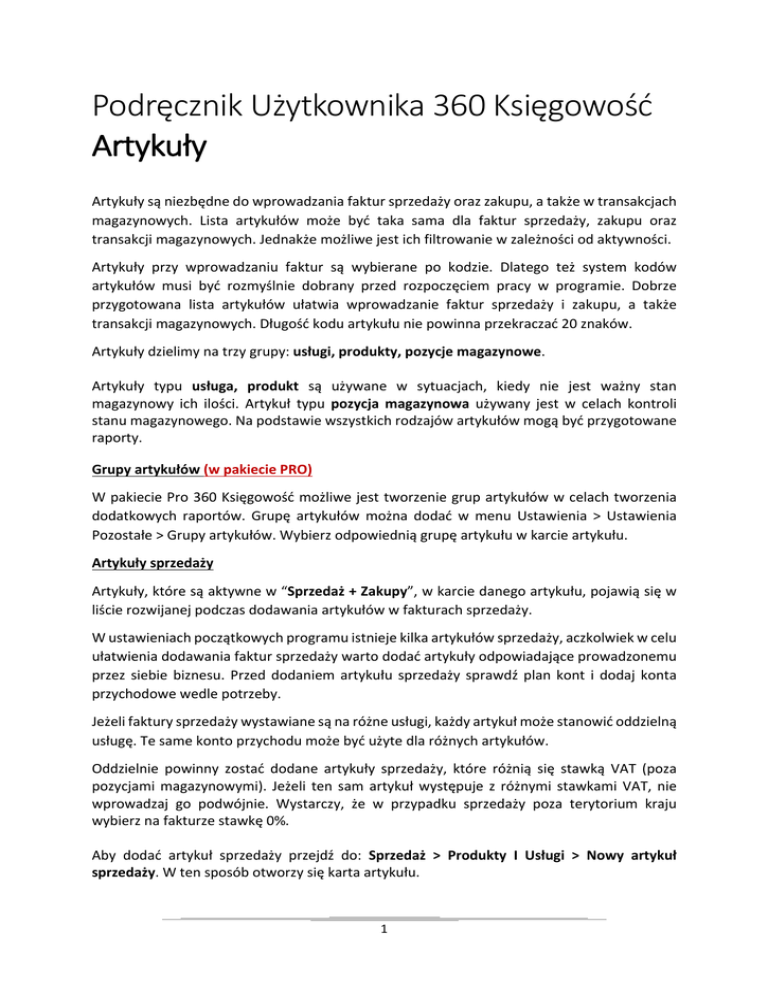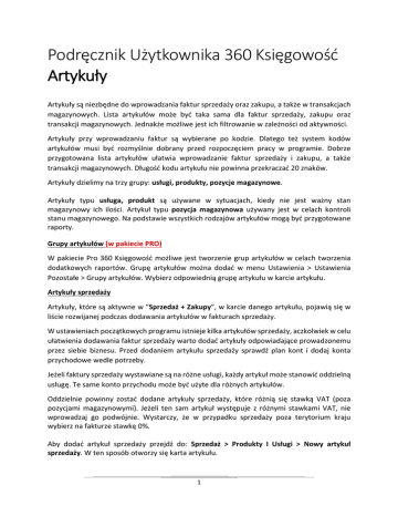 Podręcznik Użytkownika 360 Księgowość Artykuły Artykuły są niezbędne do wprowadzania faktur sprzedaży oraz zakupu, a także w transakcjach magazynowych. Lista artykułów może być taka sama dla faktur sprzedaży, zakupu oraz transakcji magazynowych. Jednakże możliwe jest ich filtrowanie w zależności od aktywności. Artykuły przy wprowadzaniu faktur są wybierane po kodzie. Dlatego też system kodów artykułów musi być rozmyślnie dobrany przed rozpoczęciem pracy w programie. Dobrze przygotowana lista artykułów ułatwia wprowadzanie faktur sprzedaży i zakupu, a także transakcji magazynowych. Długość kodu artykułu nie powinna przekraczać 20 znaków. Artykuły dzielimy na trzy grupy: usługi, produkty, pozycje magazynowe. Artykuły typu usługa, produkt są używane w sytuacjach, kiedy nie jest ważny stan magazynowy ich ilości. Artykuł typu pozycja magazynowa używany jest w celach kontroli stanu magazynowego. Na podstawie wszystkich rodzajów artykułów mogą być przygotowane raporty. Grupy artykułów (w pakiecie PRO) W pakiecie Pro 360 Księgowość możliwe jest tworzenie grup artykułów w celach tworzenia dodatkowych raportów. Grupę artykułów można dodać w menu Ustawienia > Ustawienia Pozostałe > Grupy artykułów. Wybierz odpowiednią grupę artykułu w karcie artykułu. Artykuły sprzedaży Artykuły, które są aktywne w “Sprzedaż + Zakupy”, w karcie danego artykułu, pojawią się w liście rozwijanej podczas dodawania artykułów w fakturach sprzedaży. W ustawieniach początkowych programu istnieje kilka artykułów sprzedaży, aczkolwiek w celu ułatwienia dodawania faktur sprzedaży warto dodać artykuły odpowiadające prowadzonemu przez siebie biznesu. Przed dodaniem artykułu sprzedaży sprawdź plan kont i dodaj konta przychodowe wedle potrzeby. Jeżeli faktury sprzedaży wystawiane są na różne usługi, każdy artykuł może stanowić oddzielną usługę. Te same konto przychodu może być użyte dla różnych artykułów. Oddzielnie powinny zostać dodane artykuły sprzedaży, które różnią się stawką VAT (poza pozycjami magazynowymi). Jeżeli ten sam artykuł występuje z różnymi stawkami VAT, nie wprowadzaj go podwójnie. Wystarczy, że w przypadku sprzedaży poza terytorium kraju wybierz na fakturze stawkę 0%. Aby dodać artykuł sprzedaży przejdź do: Sprzedaż > Produkty I Usługi > Nowy artykuł sprzedaży. W ten sposób otworzy się karta artykułu. 1 Kod – wprowadź nazwę skróconą artykułu. Nazwa – opisuje transakcję związaną z artykułem. W razie potrzeby możliwa jest zmiana lub uzupełnienie nazwy artykułu na fakturze. Rodzaj – wybierz Produkt, Usługa lub Pozycja Magazynowa. Jeżeli śledzisz zmiany stanu na magazynie danego artykułu to wybierz ostatnią opcję (Pozycja magazynowa). Aktywny w – wybierz transakcje, w których dany artykuł może być użyty. • Sprzedaż – tylko w dokumentach sprzedaży, • Sprzedaż + Zakupy – dokumenty sprzedaży, zakupu oraz dokumenty sprzedaży, w których wybierane są pozycje magazynowe, • Nieaktywny – artykuł nie jest używany. Jednostka miary – wybierz jednostkę miary dla danego artykułu. Możesz dodać własne jednostki miary przechodząc do Ustawienia > Ustawienia ogólne > Jednostki miary. Cena sprzedaży – jeżeli masz artykuł sprzedaży, a cena sprzedaży tego artykułu jest znana, wprowadź cenę bez VAT, tak żeby program mógł ją sugerować za każdym razem kiedy dany artykuł jest wybierany w fakturze sprzedaży. Na fakturze sprzedaży można zmienić cenę sprzedaży w razie potrzeby. Jeżeli cena sprzedaży danego artykułu jest zmienna, nie wprowadzaj Ceny sprzedaży ani Ostatniej ceny zakupu. Rabat % – wysokość rabatu przypisanego danemu artykułowi w procentach, dodany jako domyślny na fakturze. Wysokość rabatu % może być zmieniona na fakturze. Konto sprzedaży / zakupu artykułu zależy od rodzaju artykułu oraz aktywności. W programie można ustawić konta domyślne przechodząc do Ustawienia > Ustawienia finansów > Konta domyślne. W związku z tym, że możliwe jest wskazanie tylko jednego konta sprzedaży w ustawieniach domyślnych, ustawienia domyślne konta mogą nie być dogodne w przypadku dodania nowych kont. Dlatego też, sprawdź konta podczas przygotowywania nowych kont. Jeżeli rodzaj artykułu to Usługa lub Produkt, wybierz odpowiednie konto sprzedaży dla artykułu sprzedaży. Jeżeli rodzaj artykułu to Pozycja magazynowa, wybierz również konto zapasów (magazynu) oraz konto kosztów sprzedaży w dodatku do konta sprzedaży. 2 Program wykorzystuje przypisane konta do tworzenia automatycznych wpisów do księgi głównej. Konto sprzedaży może zostać ręcznie zmienione na fakturze sprzedaży w razie potrzeby. Konto zapasów (magazynu) nie może zostać zmienione na fakturze sprzedaży. VAT (Value added tax) – stawka VAT oznacza wysokość procentową VAT, jaka będzie obliczana na fakturze. Jeżeli niektóre artykuły sprzedawane są w Polsce i w innych krajach, wybierz stawkę, która jest w Polsce, a później na fakturze zmień stawkę na zero w razie potrzeby. Jeżeli natomiast artykuły sprzedawane są tylko poza terytorium Polski, wybierz stawkę 0%. Artykuły zakupu Artykuły aktywne w „Sprzedaż + Zakupy” są wyświetlane w liście artykułów w oknie wprowadzania faktur i innych dowodów zakupu W ustawieniach początkowych istnieje kilka różnych rodzajów artykułów zakupu wprowadzonych już do programu. Możesz dodać nowe artykuły w razie potrzeby. Sprawdź plan kont przed dodaniem nowych artykułów zakupu, w razie potrzeby dodaj nowe konta kosztowe. Utwórz różne artykuły dla każdego dodanego konta. Możesz dodać artykuły zakupu poprzez wybór Zakupy > Produkty i Usługi > Nowy artykuł zakupów lub poprzez kliknięcie dodaj po rozwinięciu listy artykułów w oknie wprowadzania dokumentu zakupu. Kod – wprowadź nazwę skróconą artykułu. Nazwa –