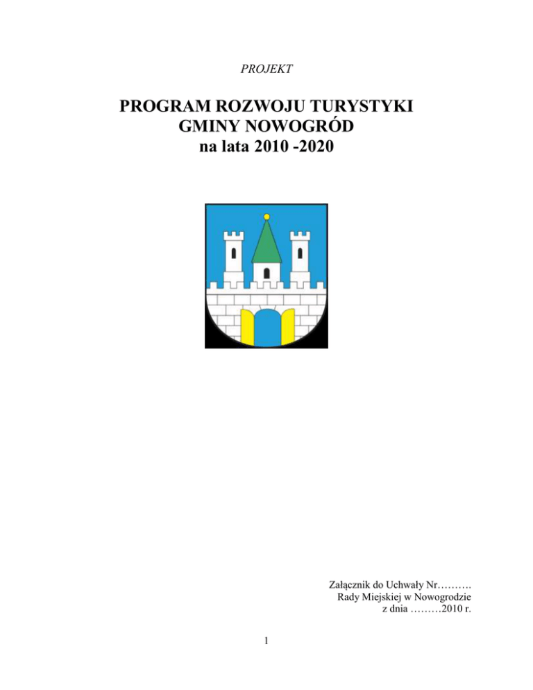 PROJEKT PROGRAM ROZWOJU TURYSTYKI GMINY NOWOGRÓD na lata 2010 -2020 Załącznik do Uchwały Nr………. Rady Miejskiej w Nowogrodzie z dnia ………2010 r. 1 Spis treści: Wstęp 1. Położenie gminy Nowogród 2. Nowogród – charakterystyka miasta i gminy. 3. Układ komunikacyjny 4. Charakterystyka gospodarcza 5. Cele programu 6. Stan wyjściowy działalności i infrastruktury turystycznej 7. Silne i słabe strony turystyki na terenie gminy 8. Wskazania kierunków realizacji 9. Wytworzenie produktu turystycznego 10. Oczekiwane efekty 2 Wstęp Turystyka ma szansę stać się najważniejszą, po rolnictwie, gałęzią gospodarki w gminie Nowogród. W tym celu potrzebne są kompleksowe i wszechstronne działania organizacyjne, planistyczne i inwestycyjne. Konieczne jest ukierunkowanie tych działań poprzez sformułowanie misji, określenie wizji oraz strategicznych celów rozwojowych turystyki w gminie. Zadanie to spełni wieloletni program rozwoju turystyki gminy. Program rozwoju turystyki Gminy Nowogród został opracowany metodą ekspercko-społeczną, przy jego tworzeniu równorzędną rolę pełniły analizy eksperckie i konsultacje z przedstawicielami społeczności gminy, zainteresowanymi problemami rozwoju turystyki. Przy budowie programu zostały wykorzystane analizy i uogólnienia eksperckie wynikające z danych uzyskanych poprzez obserwację, ankietę, wywiad środowiskowy. Program zgodny jest ze strategią zrównoważonego rozwoju miasta i gminy. Jest też zharmonizowany z dokumentami regionalnymi, krajowymi i międzynarodowymi (w tym Unii Europejskiej). W szczególności uwzględnia założenia dokumentów: - Strategia Rozwoju Kraju 2007-2015, - Narodowe Strategiczne Ramy Odniesienia 2007-2013, - Kierunki rozwoju turystyki do 2015 roku; dokument rządowy przyjęty przez Radę Ministrów w dniu 26 września 2008 r., - Program Rozwoju Turystyki i Zagospodarowania Turystycznego Województwa Podlaskiego w latach 2010 – 2015, - Strategia Rozwoju Produktu Turystycznego Szlak Wodny Króla Stefana Batorego: Wisła – Kanał Żerański – Zalew Zegrzyński – Narew – Biebrza – Kanał Augustowski (Niemen). Ponadto uwzględnione zostały dostępne informacje statystyczne z zakresu turystyki, opisowe i liczbowe instytucji, organizacji i innych jednostek związanych z turystyką, opracowania Urzędu Miejskiego w Nowogrodzie. Przy opracowaniu zostały wykorzystane następujące metody badawcze: - analiza SWOT, - ankieta badająca priorytety mieszkańców gminy w zakresie rozwoju turystyki, - metoda opisu i analizy z opracowaniami tabelarycznymi i mapkami. Dokument ma charakter programu średniookresowego. Analiza stanu istniejącego obejmuje lata 2002 - 2008, z odniesieniem wybranych elementów do lat wcześniejszych pozwalających na ukazanie trendów zjawisk i procesów. Programem objęty został okres do 2020 roku. 3 1. Położenie. Gmina Nowogród położona jest w zachodniej części województwa podlaskiego, w powiecie łomżyńskim na obszarze Międzyrzecza Łomżyńskiego. Miasto Nowogród położone jest malowniczo na wysokiej skarpie naprzeciwko ujścia Pisy do Narwi. Sąsiaduje z gminą Mały Płock, Łomża, Miastkowo i Zbójna. 2. Nowogród – charakterystyka miasta i gminy. Powierzchnia gminy Nowogród wynosi 10 098 ha. Stanowi to 7,5% powierzchni powiatu łomżyńskiego oraz 0,5% powierzchni województwa podlaskiego. Gminę zamieszkuje 4 2521 osoby. Ponad 50% ludności gminy jest mieszkańcami Nowogrodu. W pozostałych 15 miejscowościach gminy zamieszkuje 20001 osób. Wsie są zróżnicowane pod względem wielkości, od liczącej 534 osoby Mątwicy do liczącej 18 mieszkańców wsi Ptaki. Gęstość zaludnienia w gminie wynosi 41 os/km2, w tym miasto – 53 os/km2, tereny wiejskie – 33 os/km2. Tereny zurbanizowane zajmują jedynie 6% ogólnej powierzchni gminy. Tereny zabudowane zajmują 145 ha (28% terenów zurbanizowanych). Nowogród jest niewielkim miasteczkiem leżącym w północno-wschodniej Polsce na Ziemi Łomżyńskiej, w obecnym województwie podlaskim. Usytuowany na wysokiej skarpie u ujścia Pisy do Narwi. Liczy 21841 mieszkańców, powierzchnia miasta wynosi 2055,5132 ha. Najstarszych dat z dziejów Nowogrodu nie sposób ustalić. Wiadomo, że istniały tu osady sprzed paru tysięcy lat. W trakcie wykopalisk prowadzonych w latach sześćdziesiątych XX wieku znaleziono m.in. gliniane naczynia, ozdoby, ościenie na ryby, żelazne groty oszczepów i topory bojowe. W IX – XII w. w widłach Narwi i Pisy istniał gród, który później przeniesiony został na przeciwległy wysoki brzeg Narwi. Od 1355 r. gród należał do Ziemowita III, który w 1375 r. przekazał go synowi Januszowi I Starszemu. On to zbudował murowany zamek w miejsce spalonego dwukrotnie drewnianego grodziszcza. Była tu rezydencja książąt mazowieckich. W 1427 r. Nowogród otrzymał prawa miejskie. Miasto prężnie się rozwijało jako miasto królewskie z siedzibą władz i sądu bartnego kurpiowskich bartników. Kwitł handel i rzemiosło. „Złoty wiek” Nowogrodu zakończył się w czasie wojen szwedzkich. W drugiej połowie XIX w Nowogród z miasta rzemieślniczo – handlowego zmienia się w miasto o charakterze rolniczym. Mieszkańcy Nowogrodu i jego okolic zawsze byli związani z dziejami ojczyzny. Brali udział w powstaniu kościuszkowskim, kampanii Napoleona, powstaniu listopadowym i styczniowym odznaczając się odwagą i męstwem. Za udział w powstaniu styczniowym władze carskie odebrały miastu prawa miejskie, które przywrócono w 1918 r. W czasie I wojny światowej na Narwi koło Nowogrodu utrzymywał się przez 3 miesiące front rosyjsko – niemiecki, podczas którego miasto zostało zniszczone w 70%. W obronie miasta brali udział żołnierze 205 pułku piechoty, również odważna młodzież akademicka z Politechniki Warszawskiej i Uniwersytetu Warszawskiego. Ciężkie walki w obronie Nowogrodu toczyły się podczas II wojny światowej. Przez kilka dni