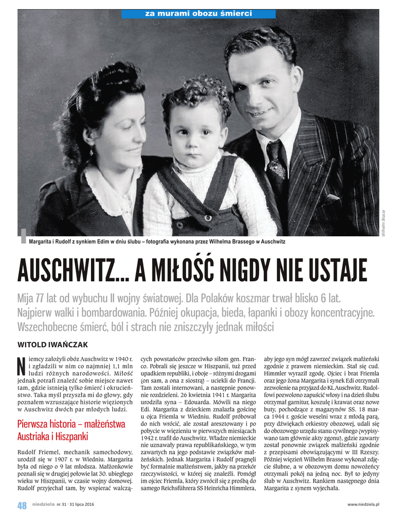 Wilhelm Brasse za murami obozu śmierci Margarita i Rudolf z synkiem Edim w dniu ślubu – fotografia wykonana przez Wilhelma Brassego w Auschwitz Auschwitz... a miłość nigdy nie ustaje Mija 77 lat od wybuchu II wojny światowej. Dla Polaków koszmar trwał blisko 6 lat. Najpierw walki i bombardowania. Później okupacja, bieda, łapanki i obozy koncentracyjne. Wszechobecne śmierć, ból i strach nie zniszczyły jednak miłości Witold Iwańczak N iemcy założyli obóz Auschwitz w 1940 r. i zgładzili w nim co najmniej 1,1 mln ludzi różnych narodowości. Miłość jednak potrafi znaleźć sobie miejsce nawet tam, gdzie istnieją tylko śmierć i okrucieństwo. Taka myśl przyszła mi do głowy, gdy poznałem wzruszające historie więzionych w Auschwitz dwóch par młodych ludzi. Pierwsza historia – małżeństwa Austriaka i Hiszpanki Rudolf Friemel, mechanik samochodowy, urodził się w 1907 r. w Wiedniu. Margarita była od niego o 9 lat młodsza. Małżonkowie poznali się w drugiej połowie lat 30. ubiegłego wieku w Hiszpanii, w czasie wojny domowej. Rudolf przyjechał tam, by wspierać walczą- 48 niedziela nr 31 . 31 lipca 2016 cych powstańców przeciwko siłom gen. Franco. Pobrali się jeszcze w Hiszpanii, tuż przed upadkiem republiki, i oboje – różnymi drogami (on sam, a ona z siostrą) – uciekli do Francji. Tam zostali internowani, a następnie ponownie rozdzieleni. 26 kwietnia 1941 r. Margarita urodziła syna – Edouarda. Mówili na niego Edi. Margarita z dzieckiem znalazła gościnę u ojca Friemla w Wiedniu. Rudolf próbował do nich wrócić, ale został aresztowany i po pobycie w więzieniu w pierwszych miesiącach 1942 r. trafił do Auschwitz. Władze niemieckie nie uznawały prawa republikańskiego, w tym zawartych na jego podstawie związków małżeńskich. Jednak Margarita i Rudolf pragnęli być formalnie małżeństwem, jakby na przekór rzeczywistości, w której się znaleźli. Pomógł im ojciec Friemla, który zwrócił się z prośbą do samego Reichsführera SS Heinricha Himmlera, aby jego syn mógł zawrzeć związek małżeński zgodnie z prawem niemieckim. Stał się cud. Himmler wyraził zgodę. Ojciec i brat Friemla oraz jego żona Margarita i synek Edi otrzymali zezwolenie na przyjazd do KL Auschwitz. Rudolfowi pozwolono zapuścić włosy i na dzień ślubu otrzymał garnitur, koszulę i krawat oraz nowe buty, pochodzące z magazynów SS. 18 marca 1944 r. goście weselni wraz z młodą parą, przy dźwiękach orkiestry obozowej, udali się do obozowego urzędu stanu cywilnego (wypisywano tam głównie akty zgonu), gdzie zawarty został ponownie związek małżeński zgodnie z przepisami obowiązującymi w III Rzeszy. Później więzień Wilhelm Brasse wykonał zdjęcie ślubne, a w obozowym domu nowożeńcy otrzymali pokój na jedną noc. Był to jedyny ślub w Auschwitz. Rankiem następnego dnia Margarita z synem wyjechała. www.niedziela.pl Austriak nie przeżył wojny. W obozie szybko związał się z ruchem oporu. Został powieszony przez Niemców 30 grudnia 1944 r. po próbie ucieczki z obozu przywódców konspiracji. Zginął w koszuli ślubnej, na której z okazji tej uroczystości więźniarki wyhaftowały mu róże. W niecały miesiąc później, 27 stycznia 1945 r., oddziały Armii Czerwonej wyzwoliły KL Auschwitz. Nieudana ucieczka Polaków: Bernarda Świerczyny, Czesława Duzela, Zbigniewa Raynocha, Piotra Piątego, a także Austriaka Ernsta Burgera miała miejsce 27 października 1944 r. Z obozu miał ich wywieźć esesman Johann Roth. Uciekinierzy ukryli się w samochodzie, którym wywożono brudną bieliznę do pralni. Roth zdradził. Samochód, zamiast wyjechać z obozu, podjechał wprost przed blok 11. Uciekinierzy zażyli truciznę. Na miejscu zmarli Raynoch i Duzel. Pozostałych odratowano i umieszczono w bloku 11. Trafili tam także Rudolf Friemel i Ludwig Vesely, których Roth wskazał jako organizatorów ucieczki. Friemel na dwa tygodnie przed śmiercią przesłał do żony gryps. Napisał w nim: „Moja kochana, kochana Margo, tulę Cię namiętnie do siebie i życzę Ci na święta wszystkiego najlepszego. Na zawsze Twój R. Co porabia mój mały uparciuch? Pisz mi dużo o nim. Moc ucałowań dla Was obojga!”. Jego żona i syn Edouard przeżyli wojnę. Margarita zmarła w 1987 r. Druga historia – Żydówki i Polaka Było to również w 1944 r. w tymże obozie, kiedy to uciekli z niego Mala Zimetbaum i Edward Galiński. On, zwany przez współwięźniów Edkiem, pochodził z miejscowości Tuligłowy koło Jarosławia. Wiosną 1940 r. został aresztowany wraz z innymi uczniami szkoły średniej w Jarosławiu w ramach niemieckiej akcji AB, skierowanej przeciw polskiej inteliwww.niedziela.pl gencji. Jako 17-latek w pierwszym transporcie polskich więźniów, 14 czerwca 1940 r., trafił do Auschwitz. Otrzymał numer 531. Pracował w ślusarni, której szefem był Niemiec z Bielska, esesman Edward Lubusch, bardzo przychylny więźniom (mówił po polsku; przed wojną żył wśród Polaków). Mala była starsza od Edka o 5 lat. Urodziła się w Brzesku jako najmłodsza córka Pinkasa i Chai. Rodzina w 1928 r. wyemigrowała do Antwerpii w Belgii. Mala była uzdolniona lingwistycznie. Posługiwała się językami: flamandzkim, francuskim, niemieckim, angielskim, polskim i rosyjskim. Niemcy aresztowali ją 11 września 1942 r. podczas łapanki i osadzili w obozie w Malines. 15 września 1942 r. została deportowana wraz z innymi Żydami do Auschwitz. Otrzymała numer 19880. Mala i Edek poznali się i pokochali na przełomie 1943 i 1944 r. Uciekli z obozu 24 czerwca 1944 r. Ona założyła kombinezon roboczy, pod którym ubrana była w zdobytą wcześniej sukienkę, a Edek, który znał doskonale język niemiecki, założył otrzymany od esesmana Lubuscha mundur i pas z kaburą oraz pistoletem. Posługując się podrobionymi dokumentami, wyszli na zewnątrz pod pozorem konwojowania więźniarki do pracy poza terenem ob