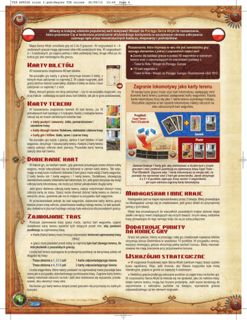 T2R AFRICA rules 2.qxd:Regles T2R suisse 26/09/12 15:49 Page 6 Witamy w kolejnej odsłonie popularnej serii kolejowej! Wsiąść do Pociągu Serce Afryki to rozszerzenie, które przeniesie Cię w bezkresne przestrzenie afrykańskiego kontynentu w szczytowym okresie odkrywania czarnego lądu przez nieustraszonych badaczy, misjonarzy i podróżników. Mapa Serce Afryki umożliwia grę od 2 do 5 graczom. W rozgrywkach 4- i 5osobowych gracze mogą zajmować obie nitki podwójnych tras. W rozgrywkach 2- i 3-osobowych, po zajęciu jednej z nitek podwójnej trasy, druga nitka już do końca gry jest niedostępna dla graczy. Karty biletów W rozszerzeniu znajdziecie 48 kart biletów. Na początku gry każdy z graczy otrzymuje losowo 4 bilety, z których musi zatrzymać co najmniej 2. W czasie rozgrywki, jeśli gracz zechce dobrać nowe bilety, dobiera 4 bilety ze stosu i musi x48 zatrzymać co najmniej 1 z nich. Bilety, których gracze nie chcą zatrzymać – czy to na początku rozgrywki, czy w jej trakcie - odkładają na spód stosu kart biletów, tak jak w grze podstawowej. Karty terenu W rozszerzeniu znajdziecie również 45 kart terenu, po 15 jednakowych kart każdego z 3 rodzajów. Każdy z rodzajów terenu odnosi się do trzech określonych kolorów tras: N karty pustyni i sawanny: żółte, pomarańczowe i czerwone trasy N karty dżungli i lasów: fioletowe, niebieskie i zielone trasy N karty gór i klifów: białe, szare i czarne trasy Na początku gry każdy z graczy, oprócz 4 kart biletów i 4 kart wagonów, otrzymuje 1 losową kartę terenu. Kolejne 2 karty terenu należy położyć odkryte obok planszy. Pozostałe karty tworzą zakryty stos kart terenu. Rozszerzenie, które trzymasz w ręku nie jest samodzielną grą i wymaga elementów z jednej z poprzednich części serii: G Zasoby dla każdego gracza w postaci 45 wagoników w wybranym kolorze wraz z odpowiadającym im znacznikiem punktacji z: - Ticket to Ride / Wsiąść do Pociągu: Europa G 110 kart wagonów z: - Ticket to Ride / Wsiąść do Pociągu: Europa / Rozszerzenie USA 1910 Zagranie lokomotywy jako karty terenu W swojej turze gracz może użyć kart lokomotywy zastępując nimi dowolne karty terenu (zamiast zastępować karty wagonów). Każda karta lokomotywy liczy się jako 1 karta terenu wybranego rodzaju. Wszystkie zagrane w ten sposób lokomotywy należy odrzucić na stos odrzuconych kart wagonów. Przykład: Cape Town Port Elizabeth Janek Piotr Dobieranie kart W trakcie gry, za każdym razem, gdy graczowi przysługuje prawo doboru karty wagonu, może zdecydować się na dobranie w zamian karty terenu. Tak więc, mając w swej turze możliwość dobrania 2 kart gracz może wziąć 2 karty wagonów, 2 karty terenu lub 1 kartę wagonu i 1 kartę terenu. Dodatkowo, obowiązują standardowe zasady dobierania kart lokomotyw, tzn. jeśli gracz decyduje się wziąć odkrytą kartę lokomotywy, nie może już dobrać jakiejkolwiek drugiej karty. Jeśli gracz dobierze odkrytą kartę terenu, należy natychmiast dołożyć nową odkrytą kartę ze stosu. Gracz może również dobrać kartę terenu w ciemno z wierzchu stosu, podobnie jak ma to miejsce w przypadku kart wagonów. W przeciwieństwie jednak do kart wagonów, dobierane karty terenu gracz kładzie przed sobą odkryte, posortowane według rodzaju terenu i w taki sposób, aby dokładna liczba kart każdego rodzaju była widoczna dla pozostałych graczy. Zajmowanie tras Podczas zajmowania trasy gracz może, oprócz kart wagonów, zagrać dodatkowo karty terenu spośród tych leżących przed nim, aby podwoić punktację za zajmowaną trasę. N Karta (Karty) terenu musi (muszą) odpowiadać kolorowi zajmowanej trasy ORAZ N gracz musi posiadać przed sobą co najmniej tyle kart danego terenu, ile którykolwiek z pozostałych graczy. Liczba kart terenu wymagana do podwojenia punktacji za daną trasę zależy od długości tej trasy: Trasa złożona z 1, 2 i 3 pól 1 karta odpowiadającego terenu Trasa złożona z 4, 5 i 6 pól 2 karty odpowiadającego terenu Liczba wagoników, które należy postawić na zajmowanej trasie pozostaje taka sama jak w przypadku standardowego punktowania trasy. Zagrane karty terenu należy natomiast odrzucić na bok i jeśli stos dobierania się wyczerpie, przetasować, aby utworzyć nowy stos. Na koniec gry karty terenu leżące przed graczem nie przynoszą mu żadnych korzyści. 6 Copyright © 2004-2012 Days of Wonder Jankowi brakuje 1 karty gór, aby zremisować w liczbie kart z innym graczem i móc podwoić punktację za zajmowaną trasę Cape Town Port Elizabeth. Zagrywa więc 1 kartę lokomotywy ze swojej ręki, co pozwala mu wyrównać stan 2 kart gór przeciwnika. Janek otrzymuje 4 x 2 = 8 punktów zajmując trasę swoimi 3 wagonikami, po czym odrzuca zagraną kartę lokomotywy. Madagaskar i inne kraje Madagaskar jest na mapie reprezentowany przez 2 lokacje. Bilety prowadzące na Madagaskar uznaje się za zrealizowane, jeśli gracz dotarł do przynajmniej jednej z tych lokacji. Wiele tras prowadzących do wszystkich pozostałych krajów stanowi ślepe zaułki i nie łączy miast znajdujących się na tych trasach. Innymi słowy, oddzielne trasy prowadzące do tego samego kraju nie są ze sobą połączone. Dodatkowe punkty na koniec gry Gracz lub gracze, którzy w przeciągu całej gry zrealizowali najwięcej biletów otrzymują bonus Globtrotera w wysokości 10 punktów. W przypadku remisu, wszyscy remisujący gracze otrzymują pełną wartość bonusu. Bilety niezrealizowane nie mają znaczenia przy przyznawaniu bonusu. Wskazówki strategiczne N W rozgrywce 5-osobowej rejon Serca Afryki (centrum mapy) dosyć szybko bywa zapełniony. Więc, jeśli chcecie, aby Wasza rozgrywka była mniej interakcyjna, grajcie w gronie co najwyżej 4-osobowym. N Niektórzy gracze preferują naliczanie punktów za zajęte trasy na koniec gry. W rozszerzeniu Serce Afryki ta metoda się nie sprawdzi, jako że niektóre trasy, dzięki kartom terenu, m